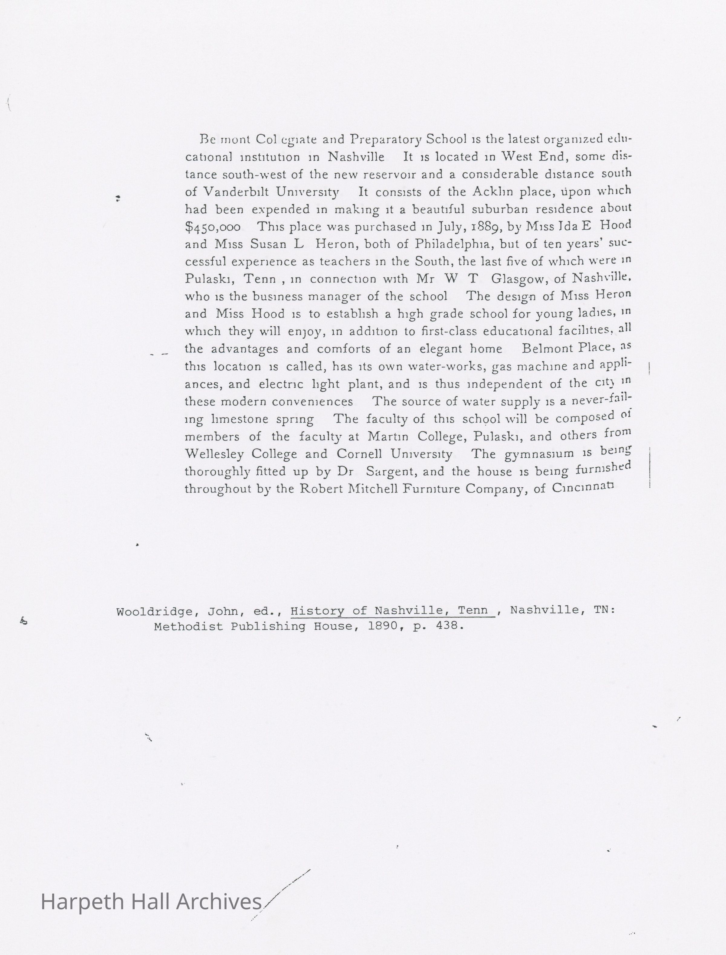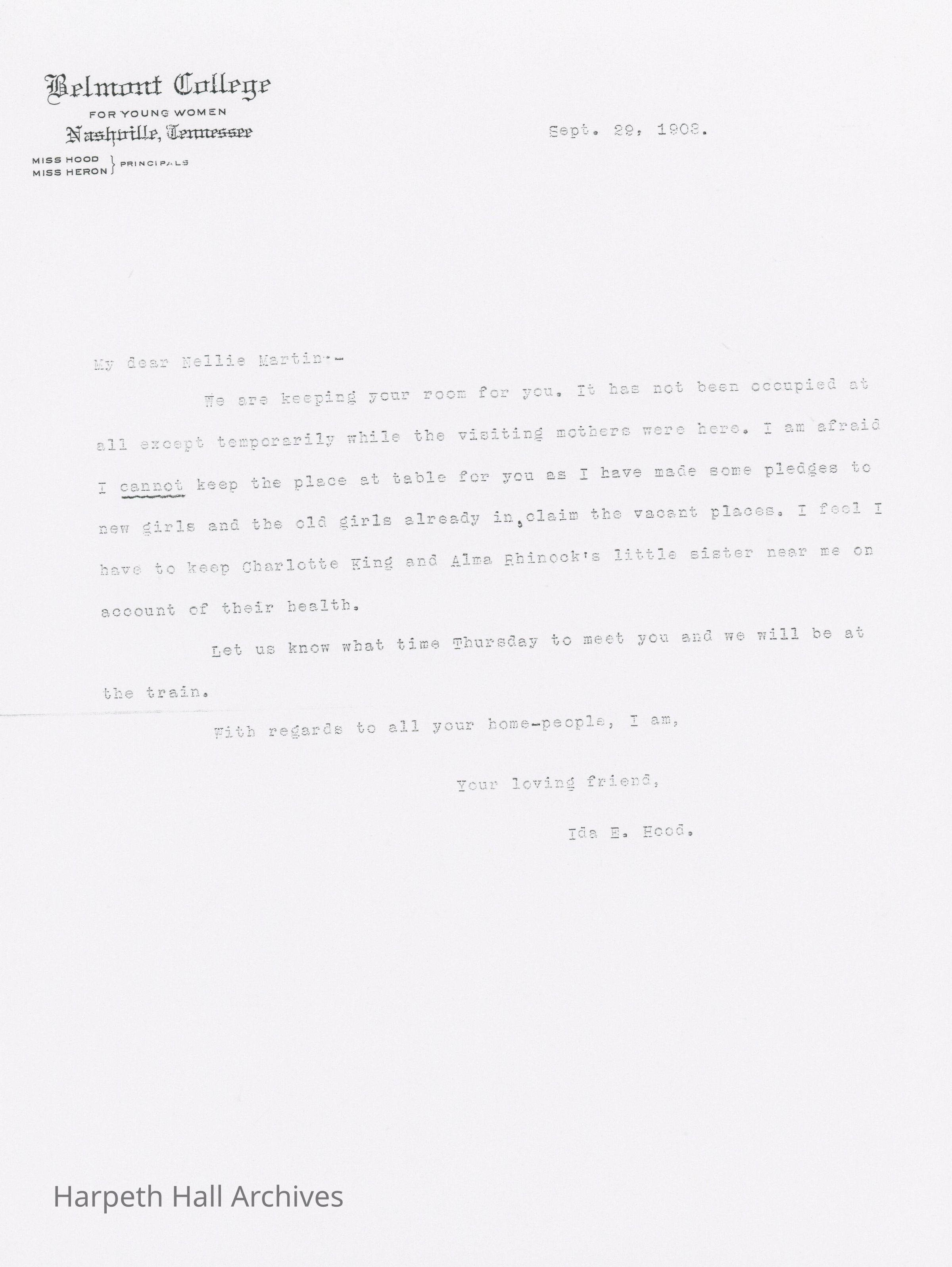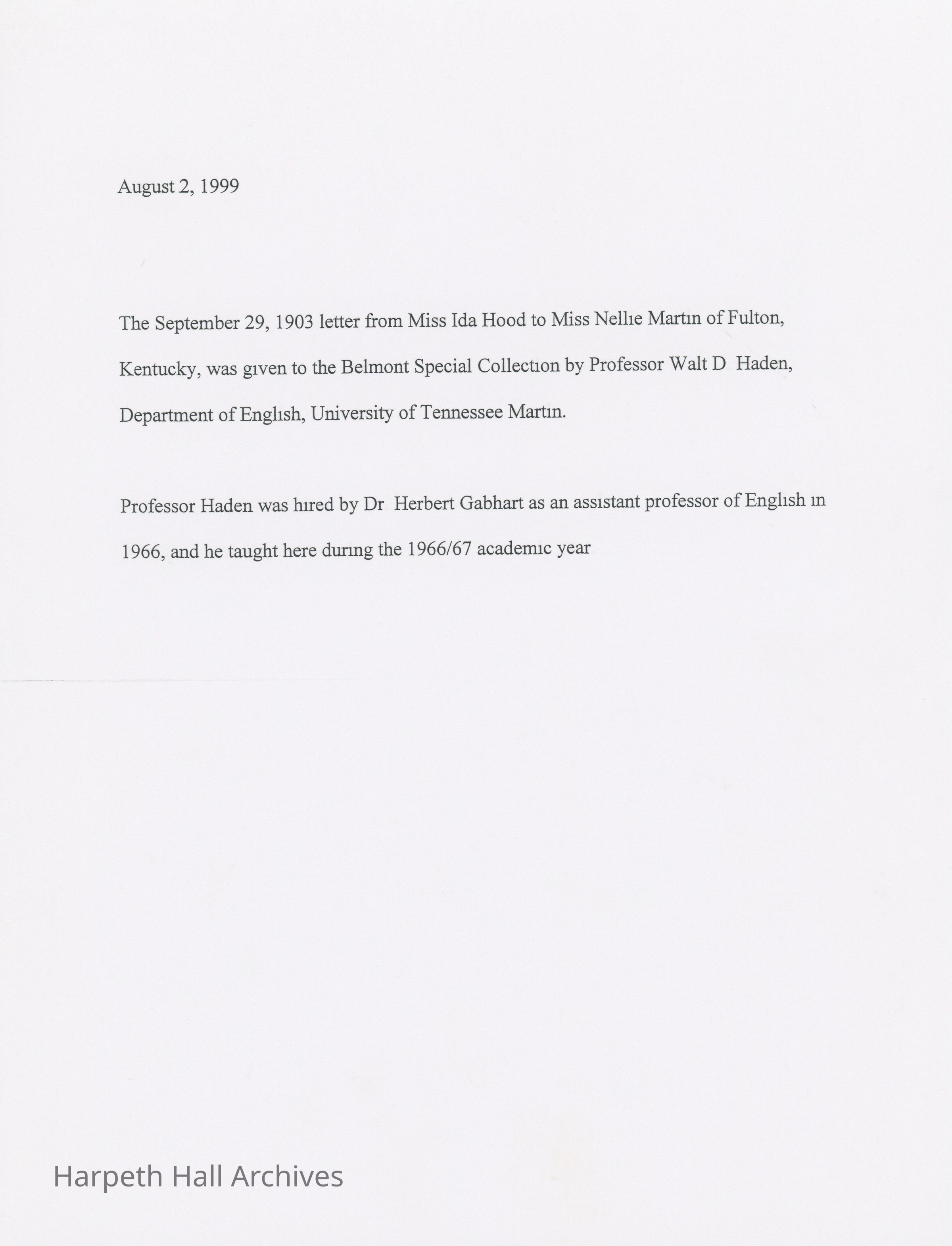 A letter from Ida Hood (founder of Belmont College for Young Women) addressed to Nellie Martin. Two types pages from 1903 and one typed page from 1999 describing the letterCollection