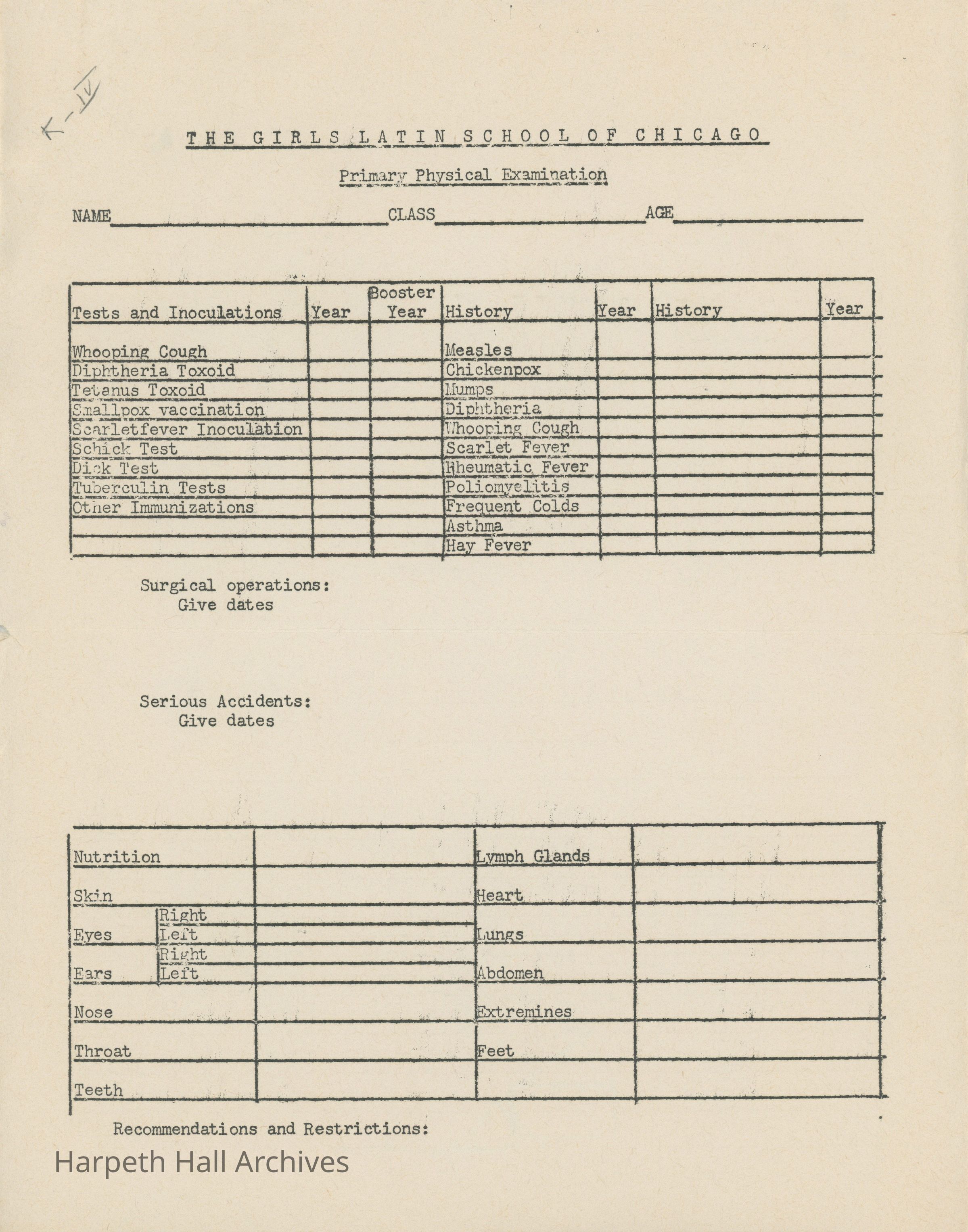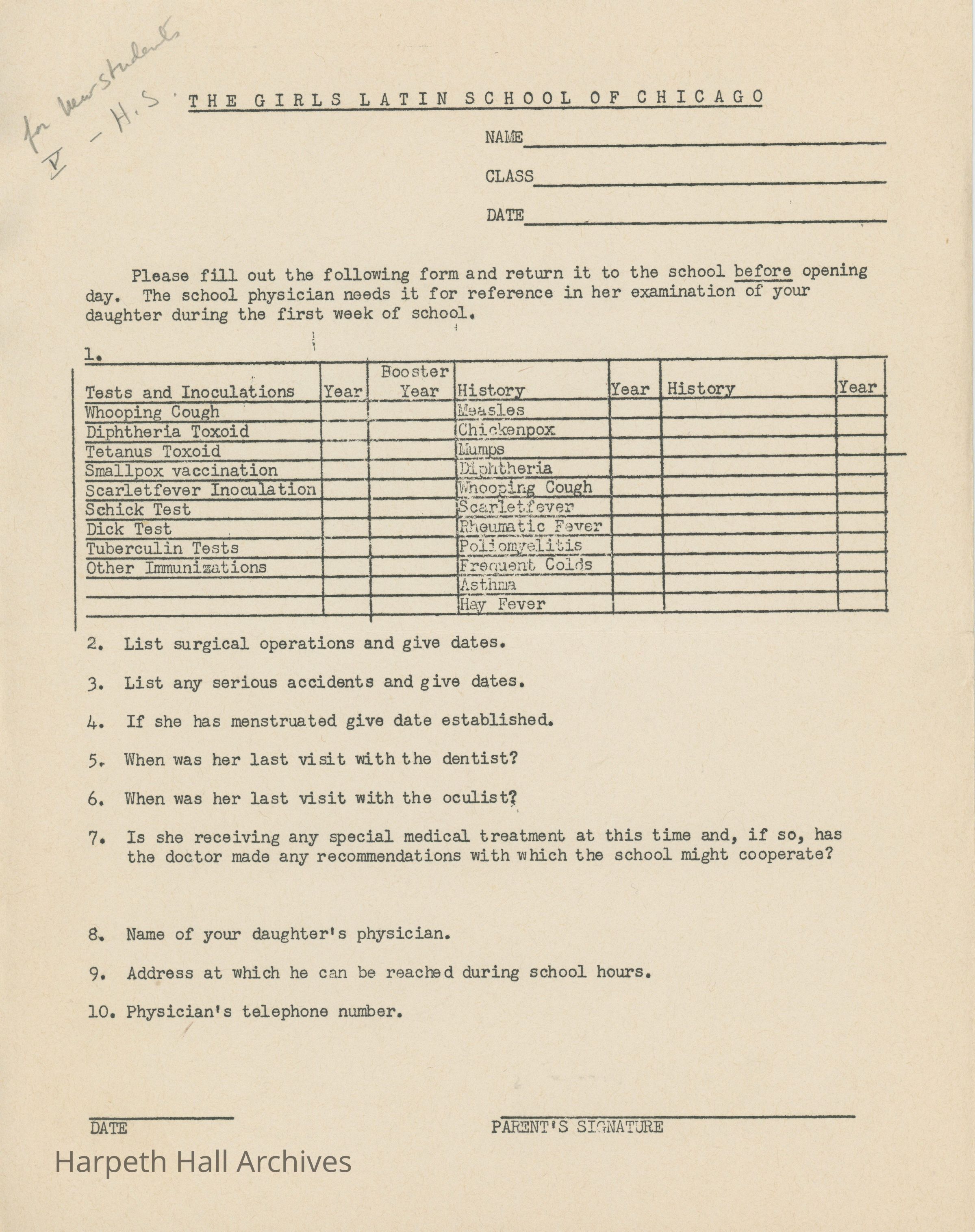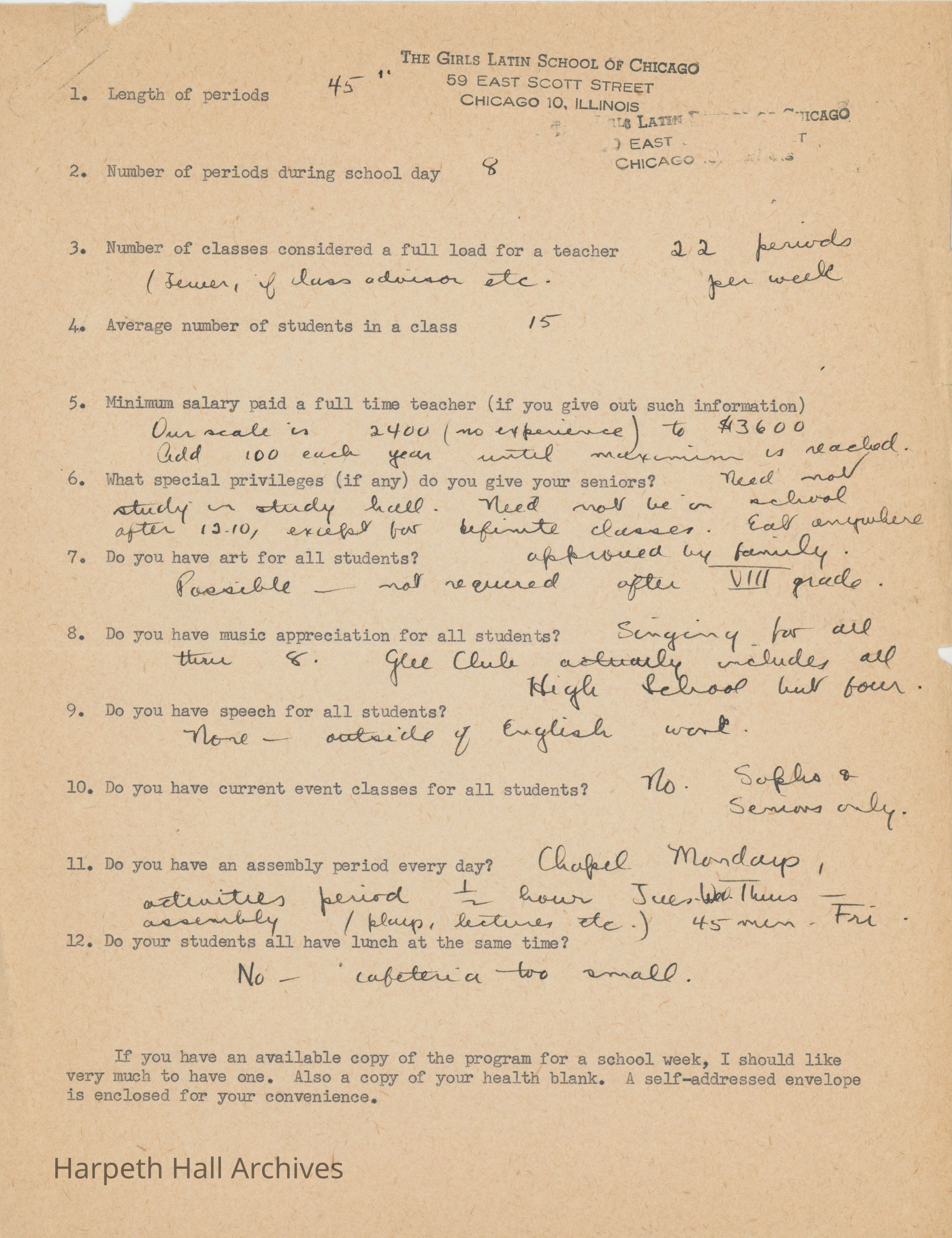 Questionnaire filled out by The Girls Latin School of Chicago in Illinois. Blank schedule and health cards are included.Context