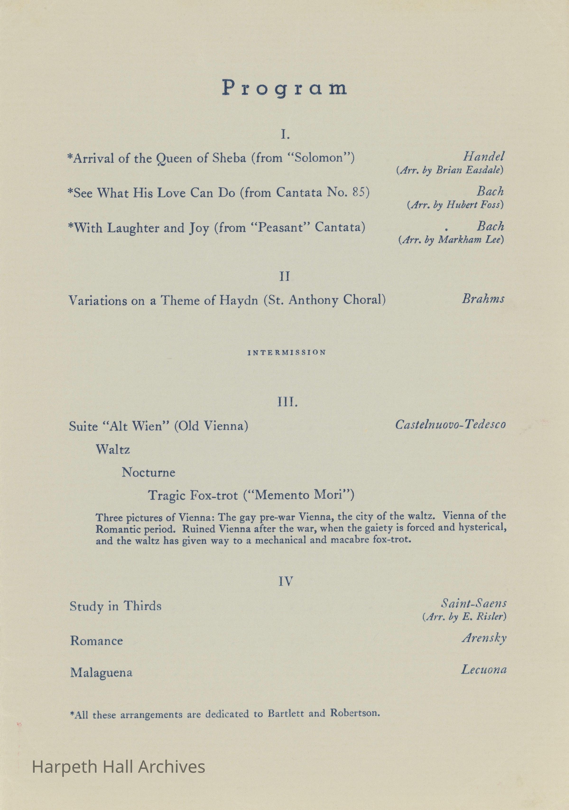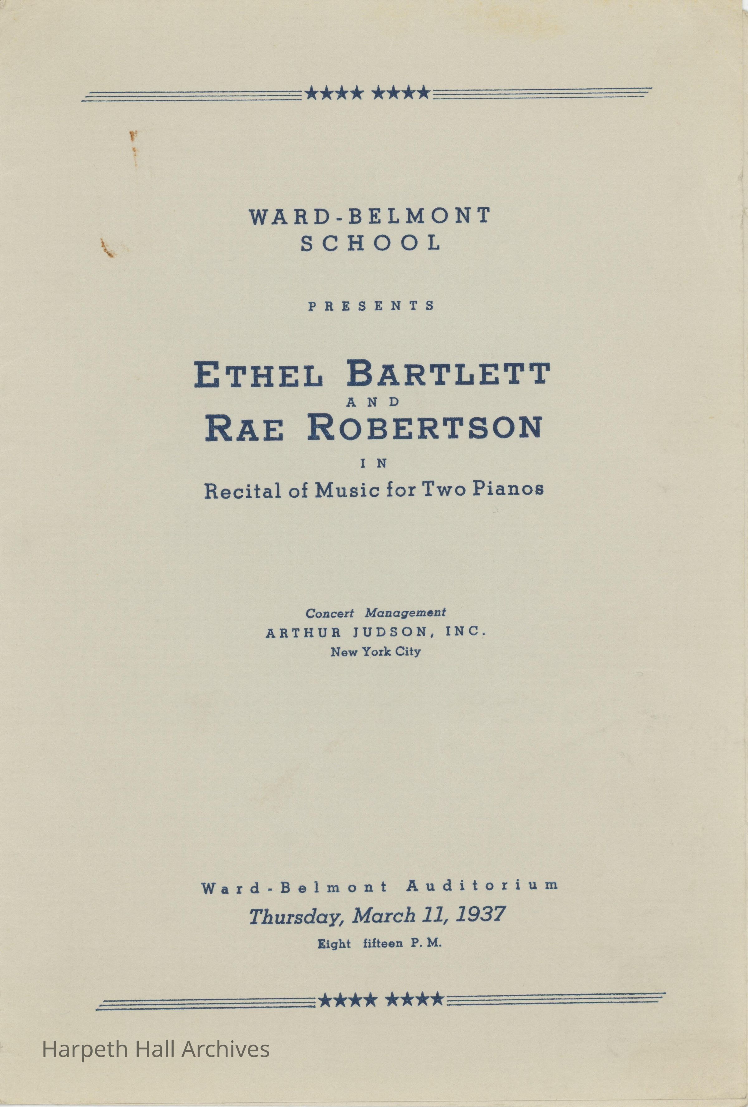 The program for Ethel Bartlett and Rae Robertson's Piano Recital on March 11th, 1937. They were both students of the Ward-Belmont Conservatory of Music.Collection