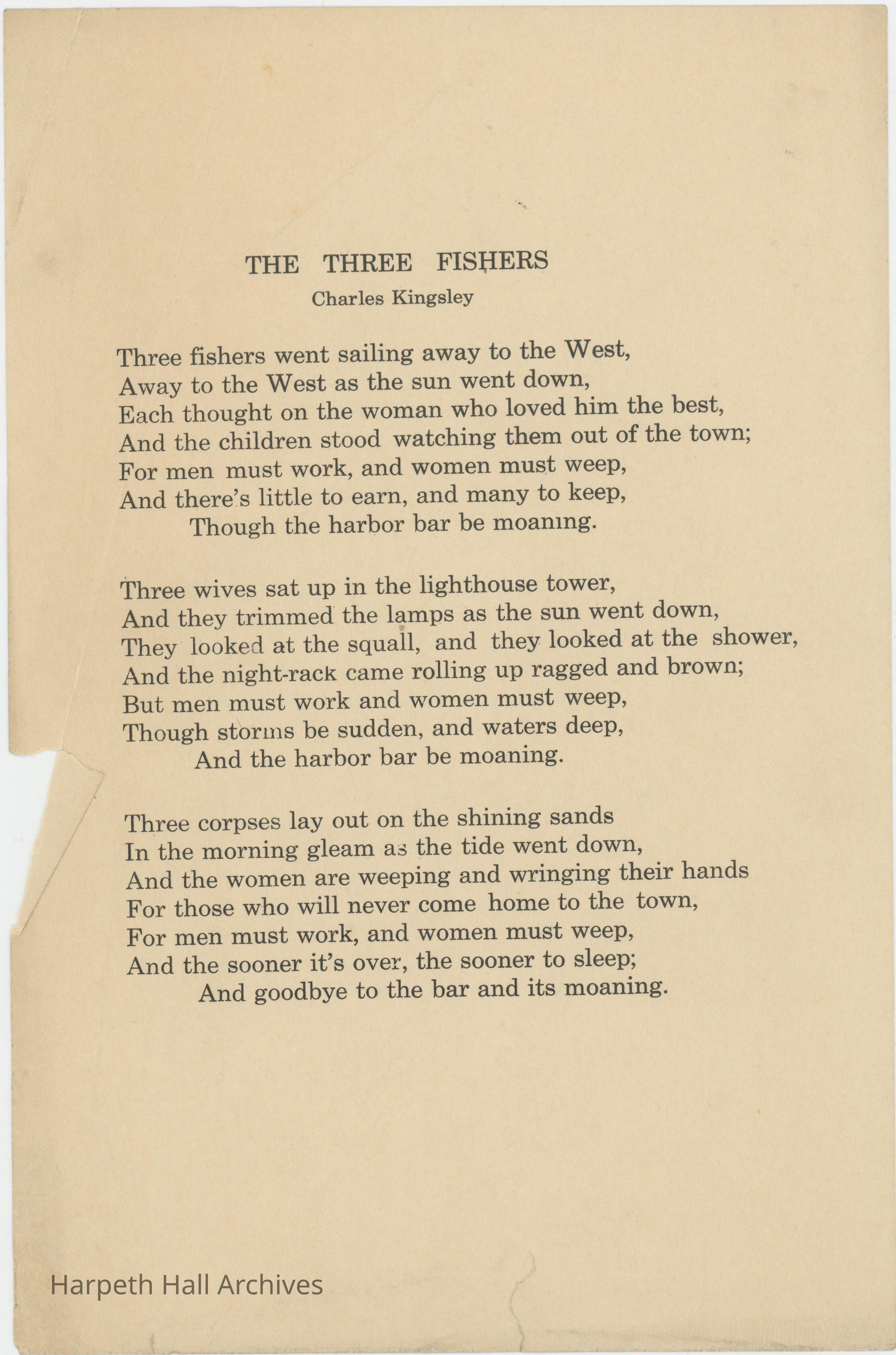 A poem entitled, "The Three Fishers" written by Charles Kingsley. This poem was studied by Ward-Belmont students.Collection