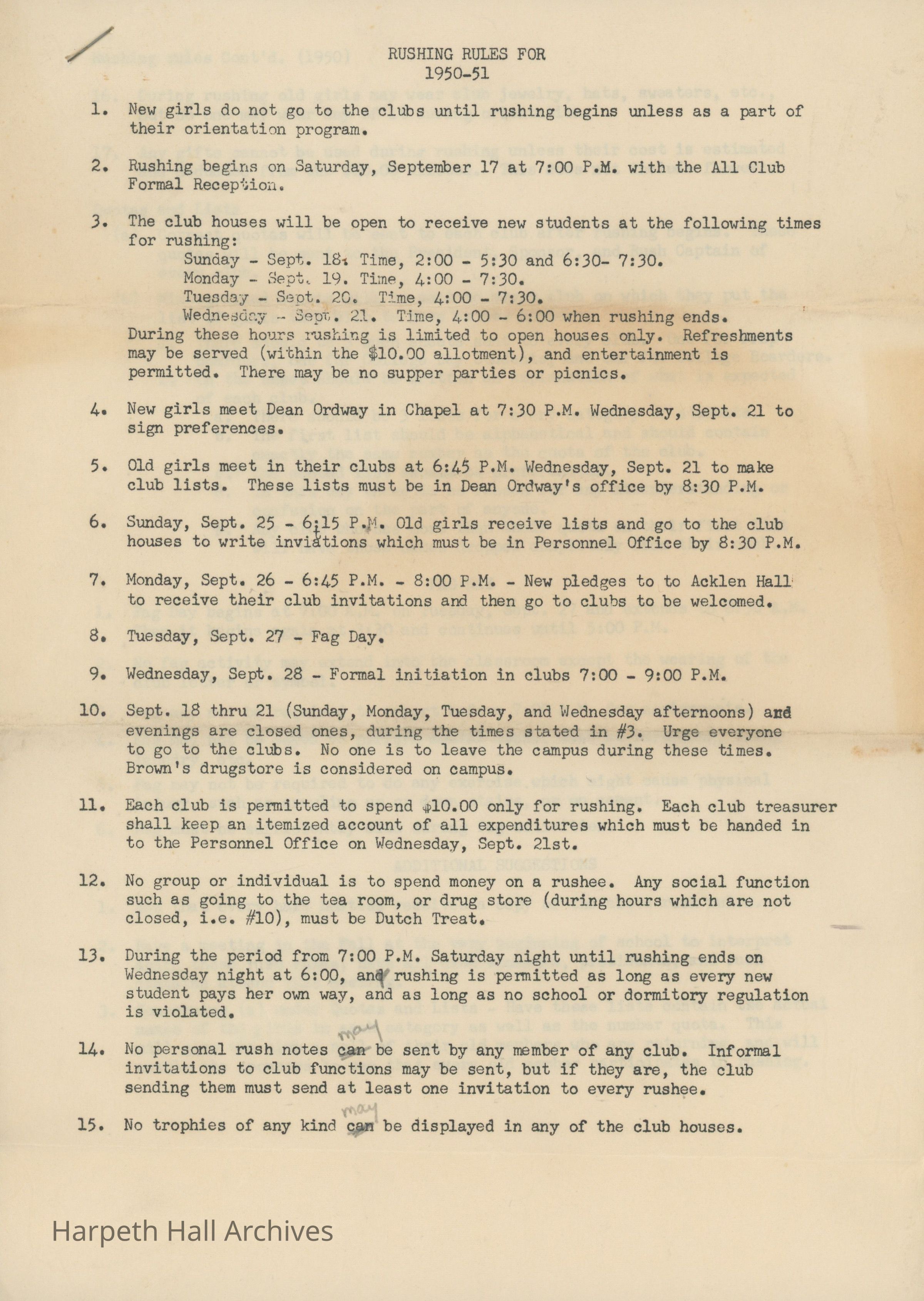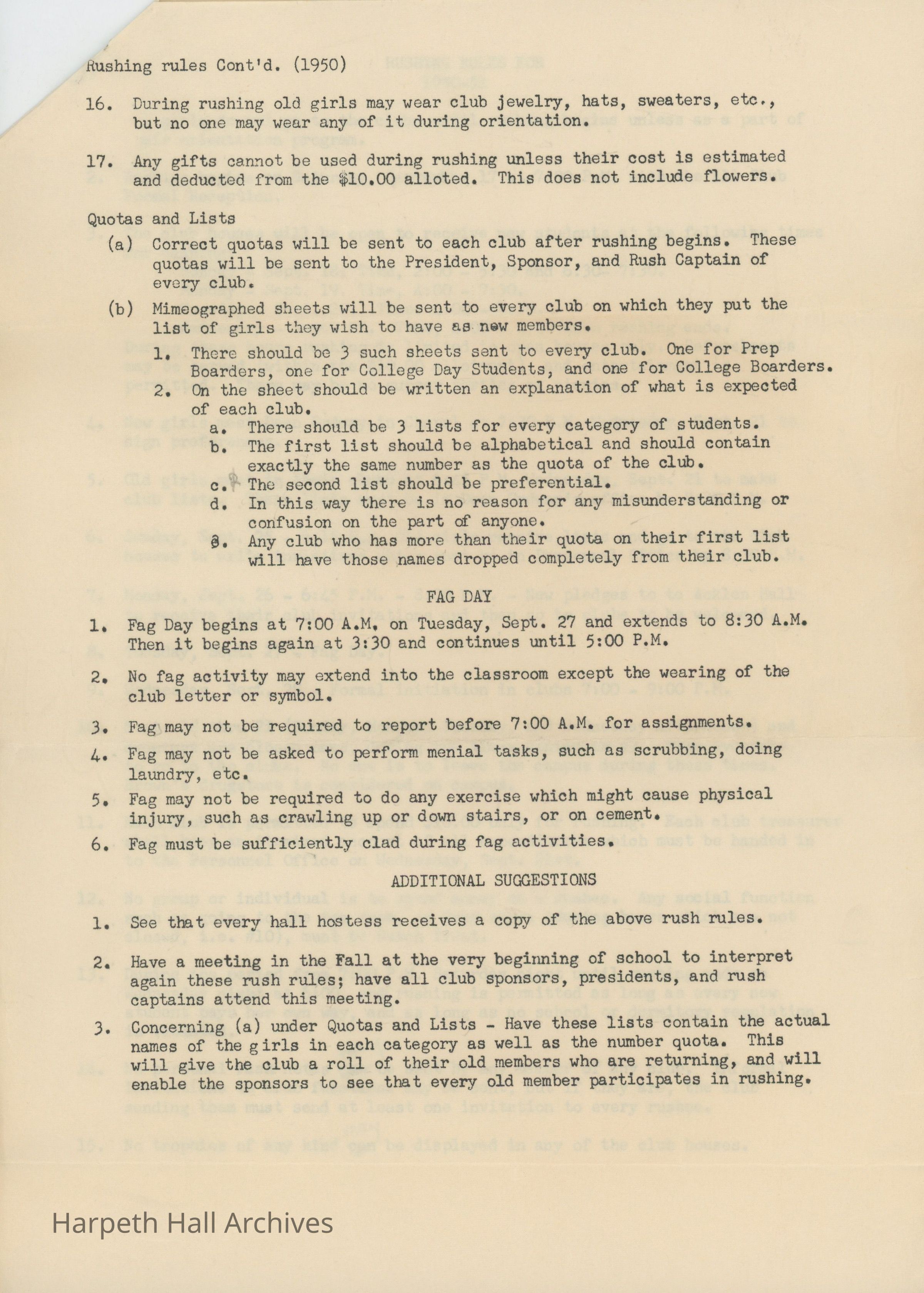 A document listing rules for the Ward-Belmont social clubs' rushing week and "Fag Day" for the 1950-51 school year. Rushing occurred in September. Seventeen rules are listed, along with instructions on club quotas and lists, regulations for Fag Day, and additional suggestions.Context
