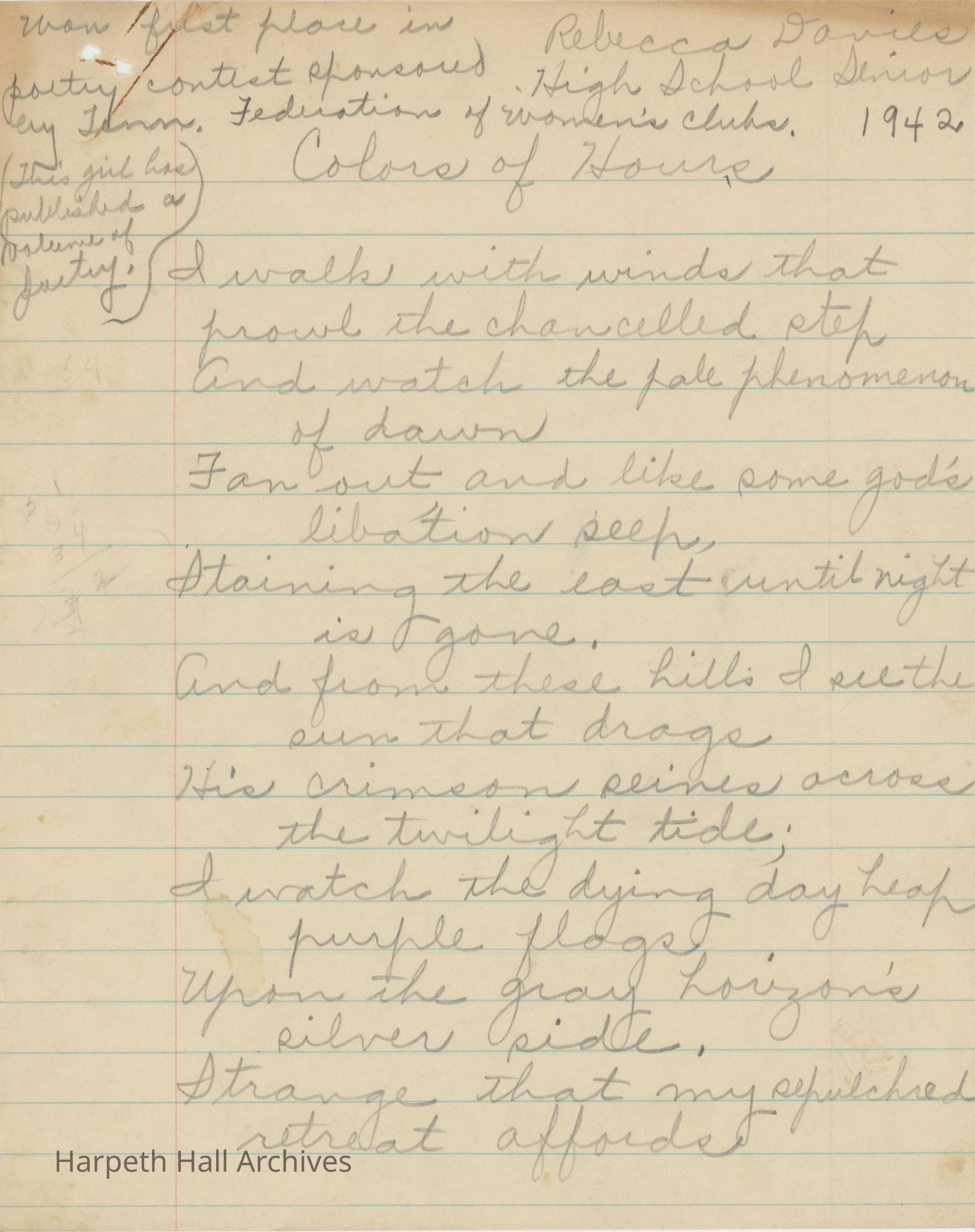An essay entitled, "Colors of Hours" written in 1942 by a Ward-Belmont High School student, Rebeca Davies.Collection