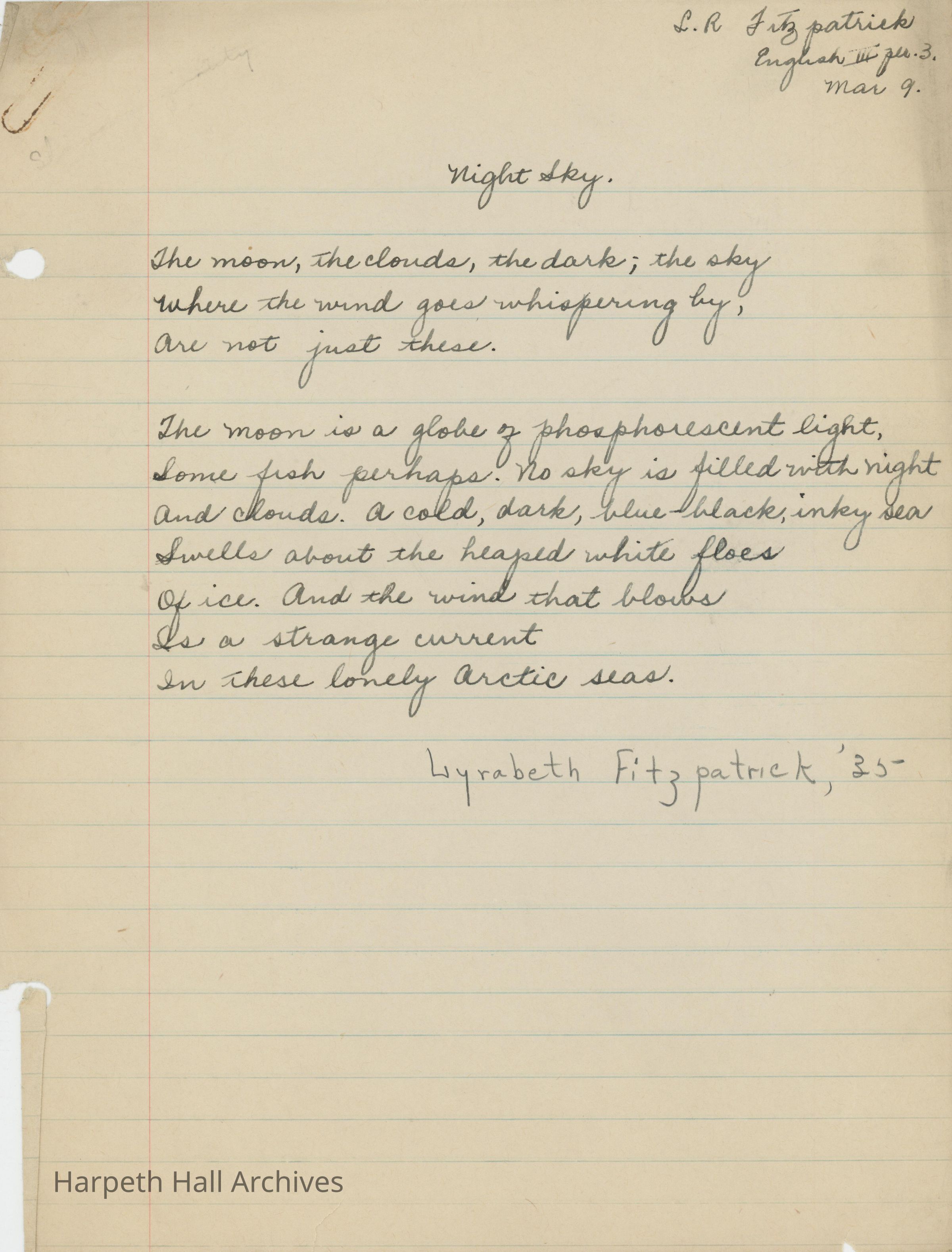A poem entitled, "Night Sky" written by Ward-Belmont student Lyrabeth Fitzpatrick (1935). The poem is dated March 9th, 1934.Collection