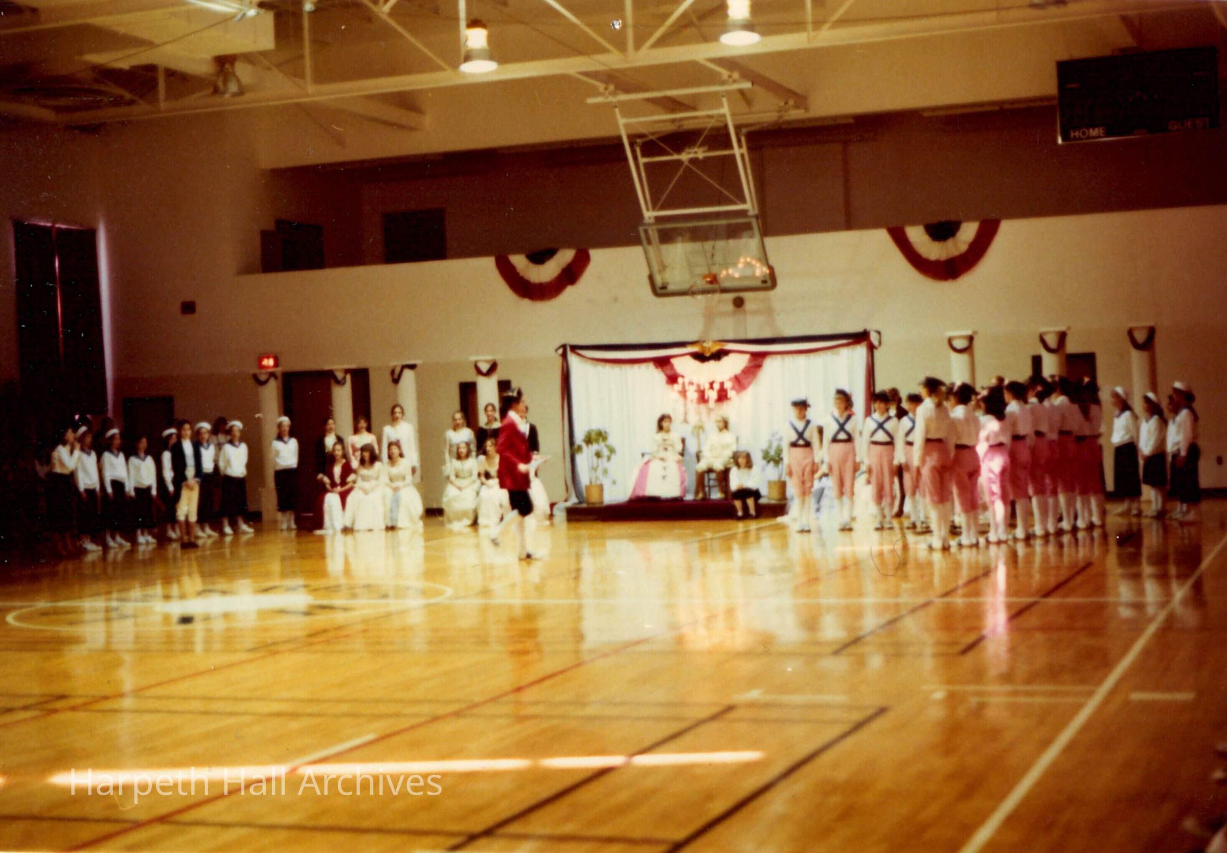 A group of seventh grade students performing in the George Washington Day Celebration. The photo is taken in the Morrison Gym in the McMurry Center.Context