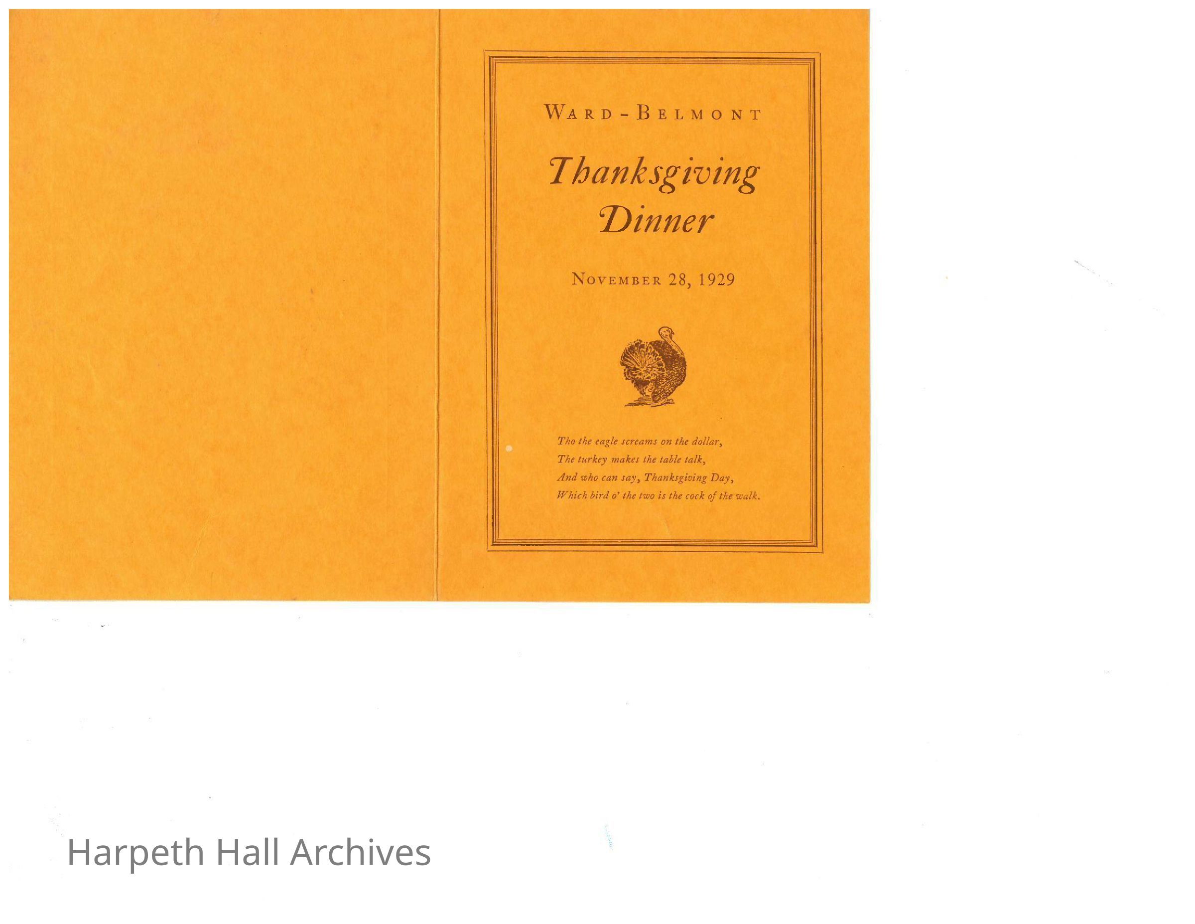 Ward-Belmont Thanksgiving Dinner Menu, 1929