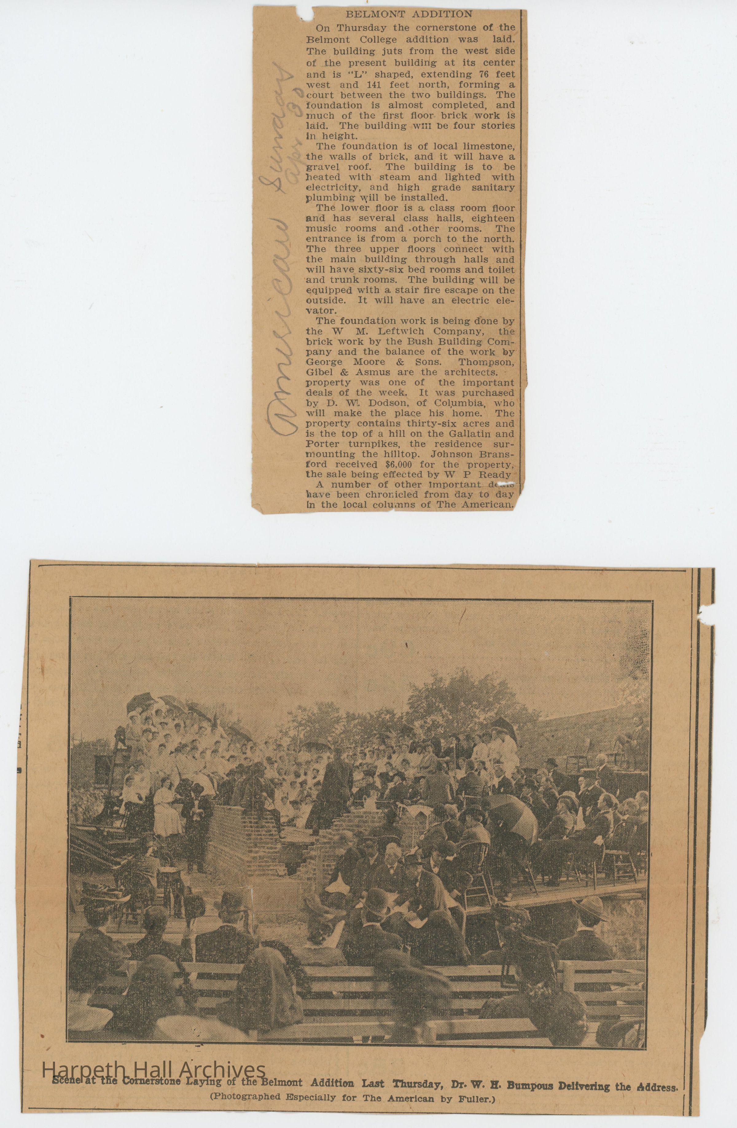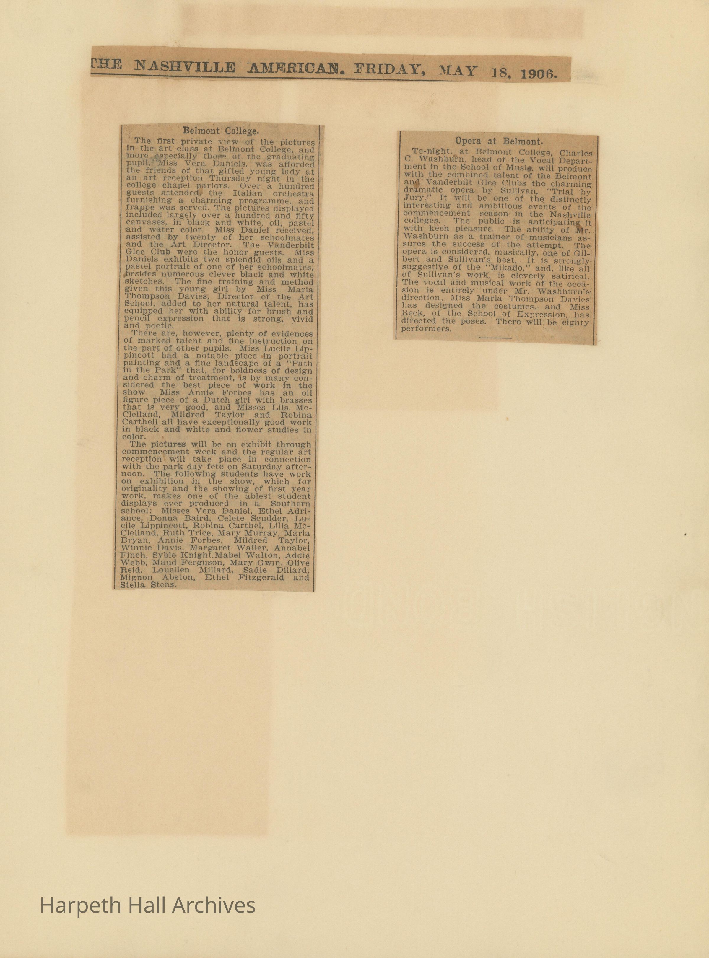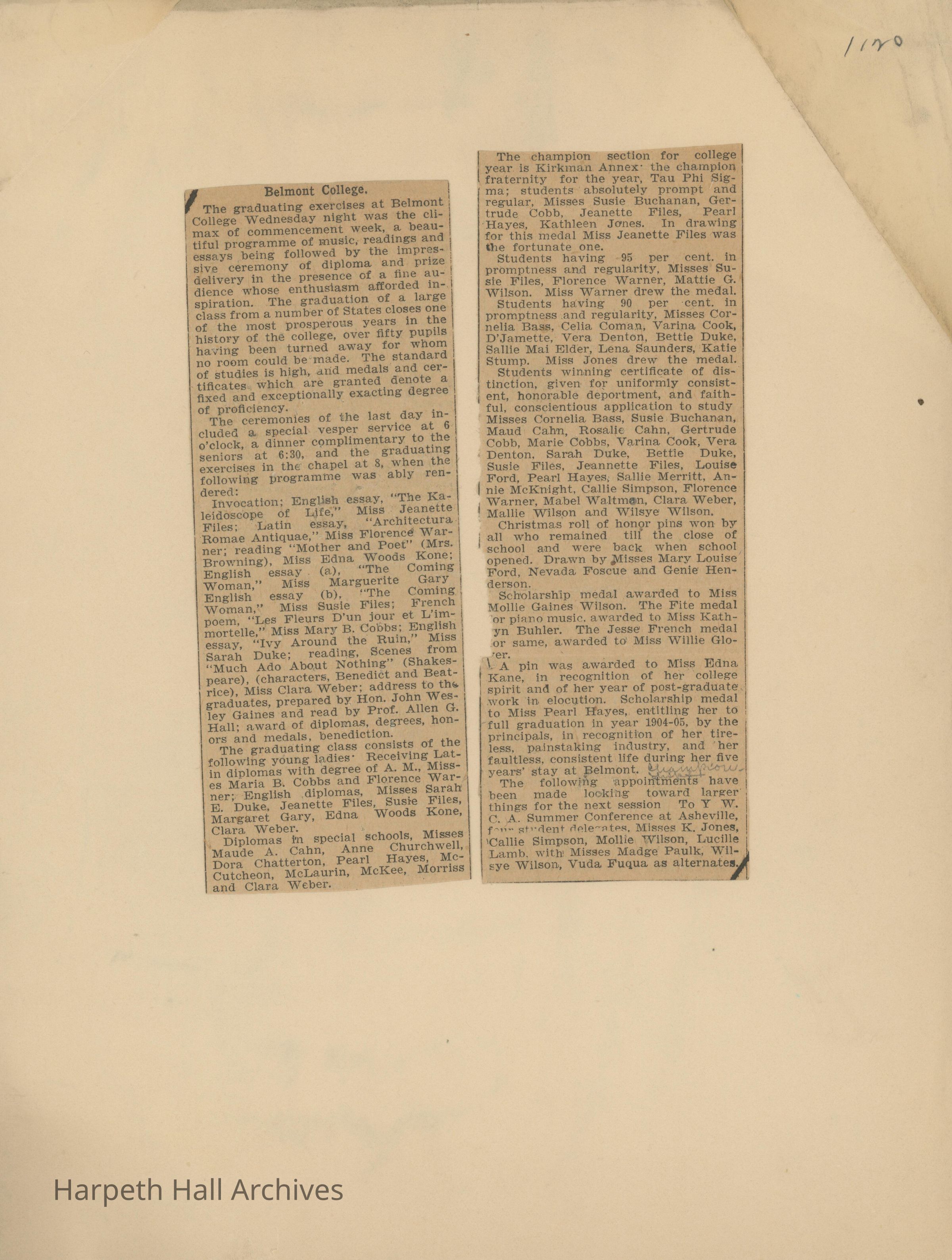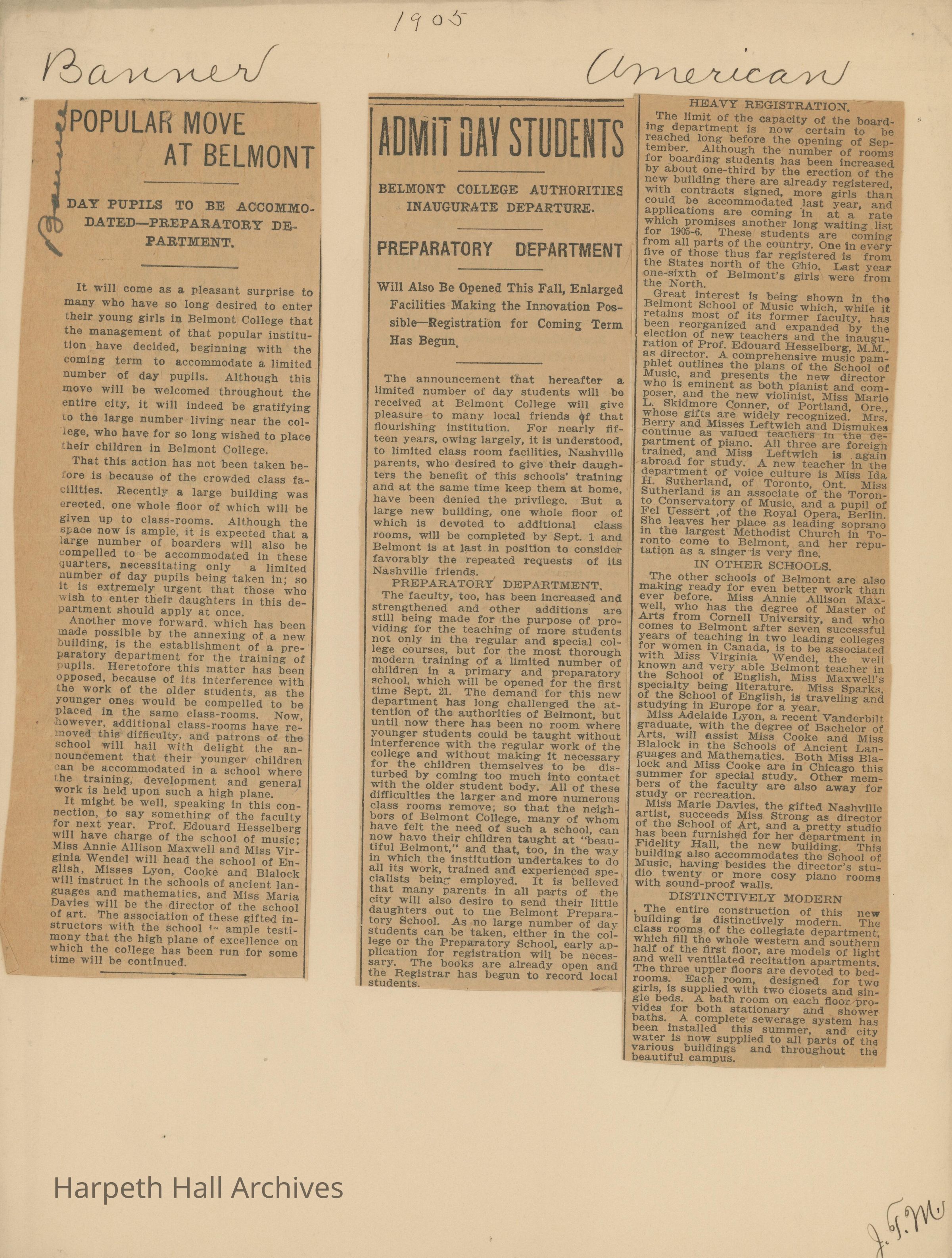 Newspaper clippings with articles about Belmont College for Young Women 1909-1915