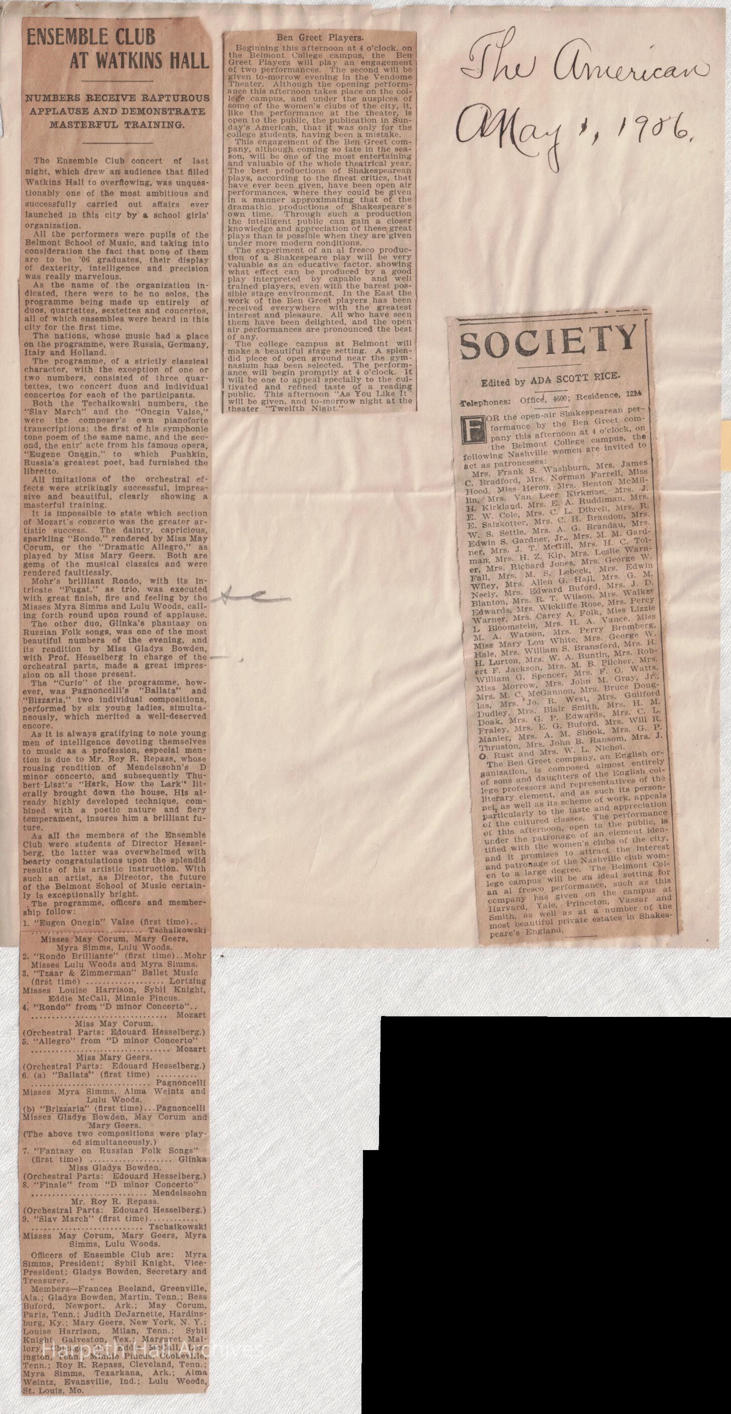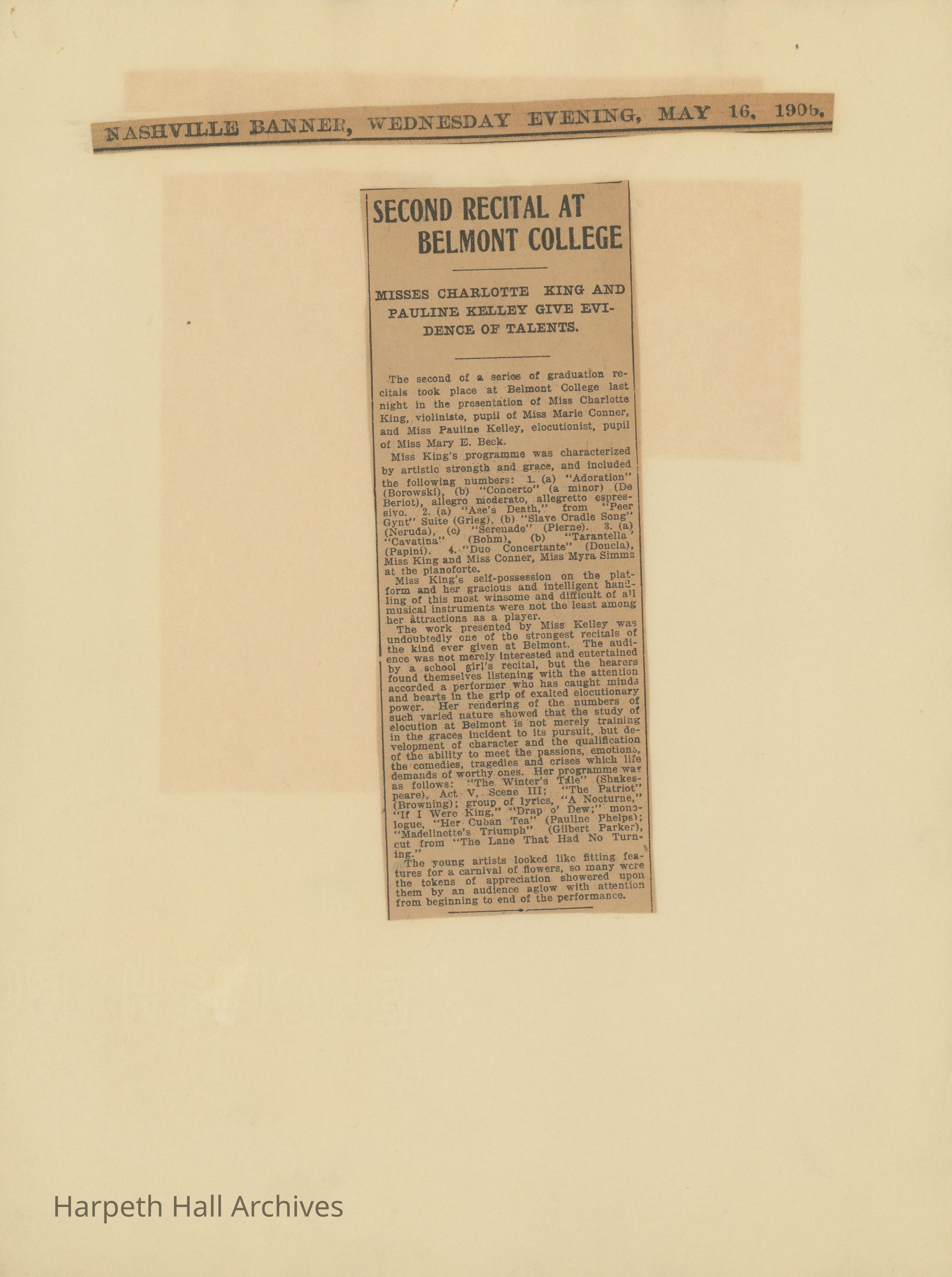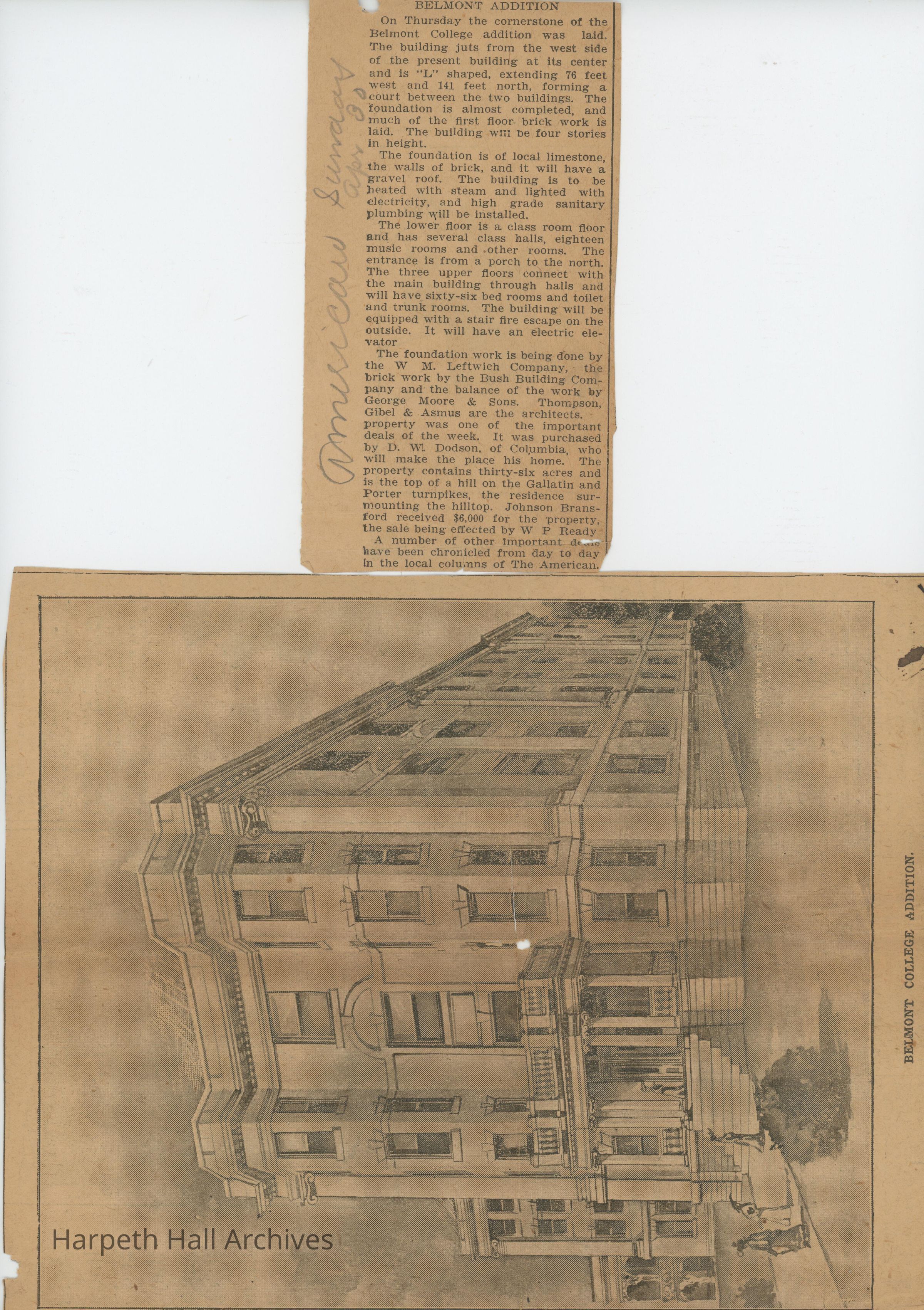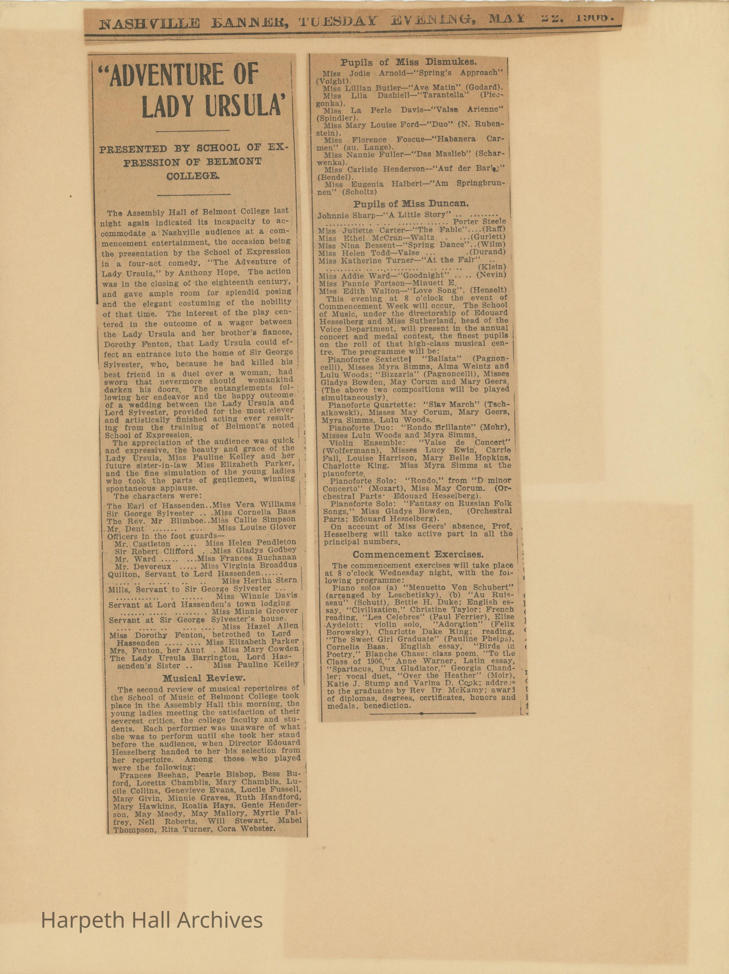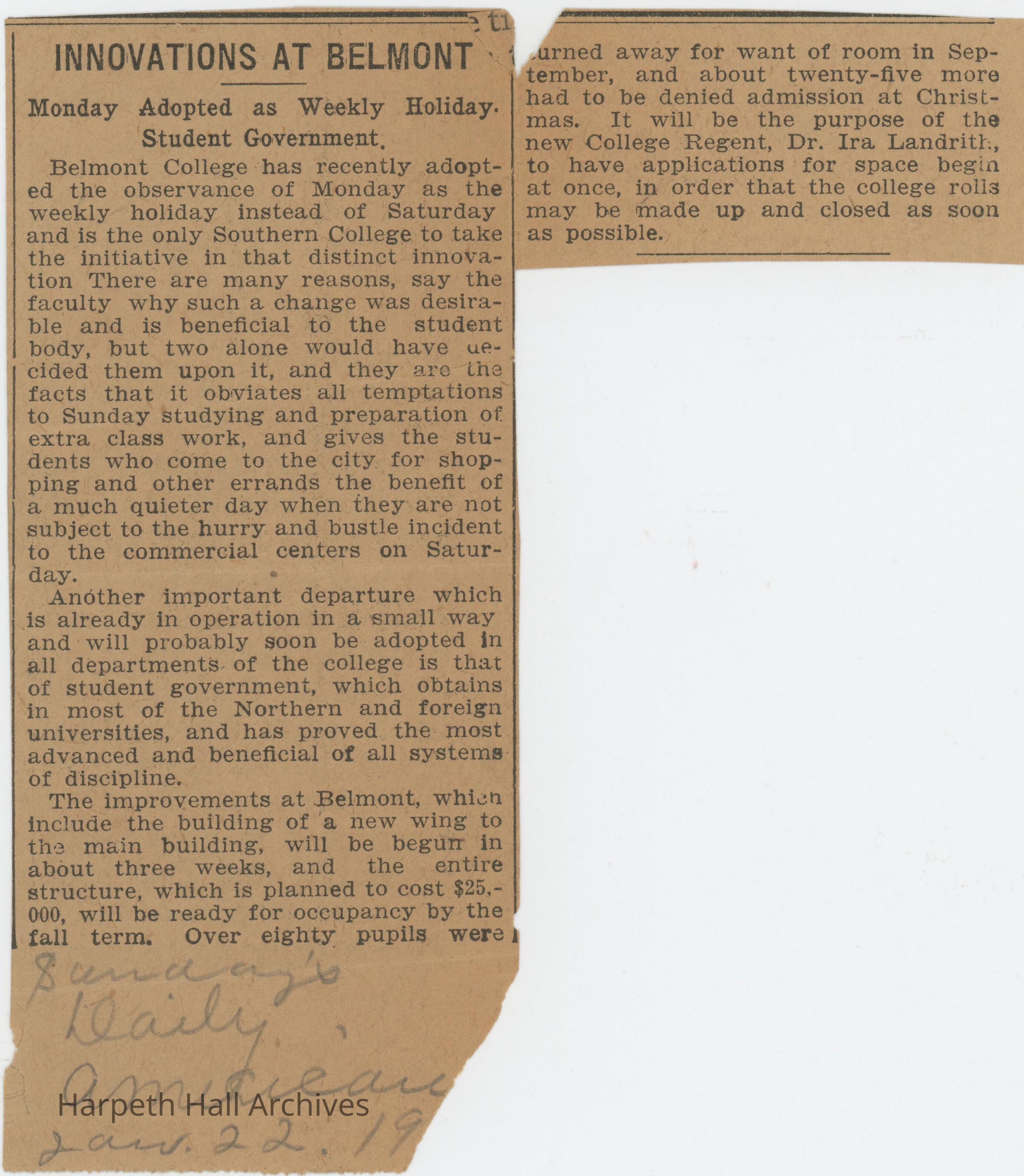 Newspaper clippings with articles about Belmont College for Young Women 1909-1915