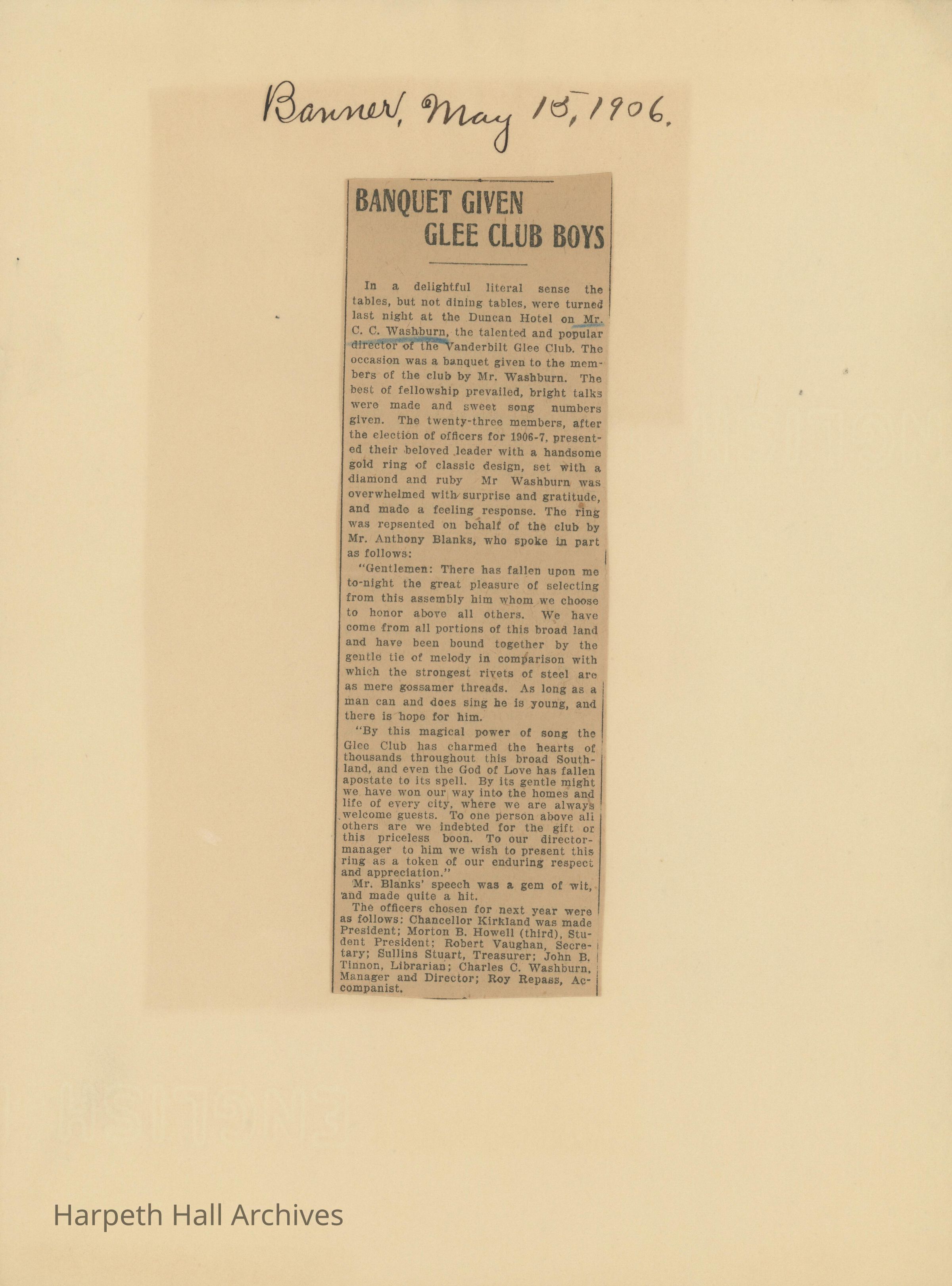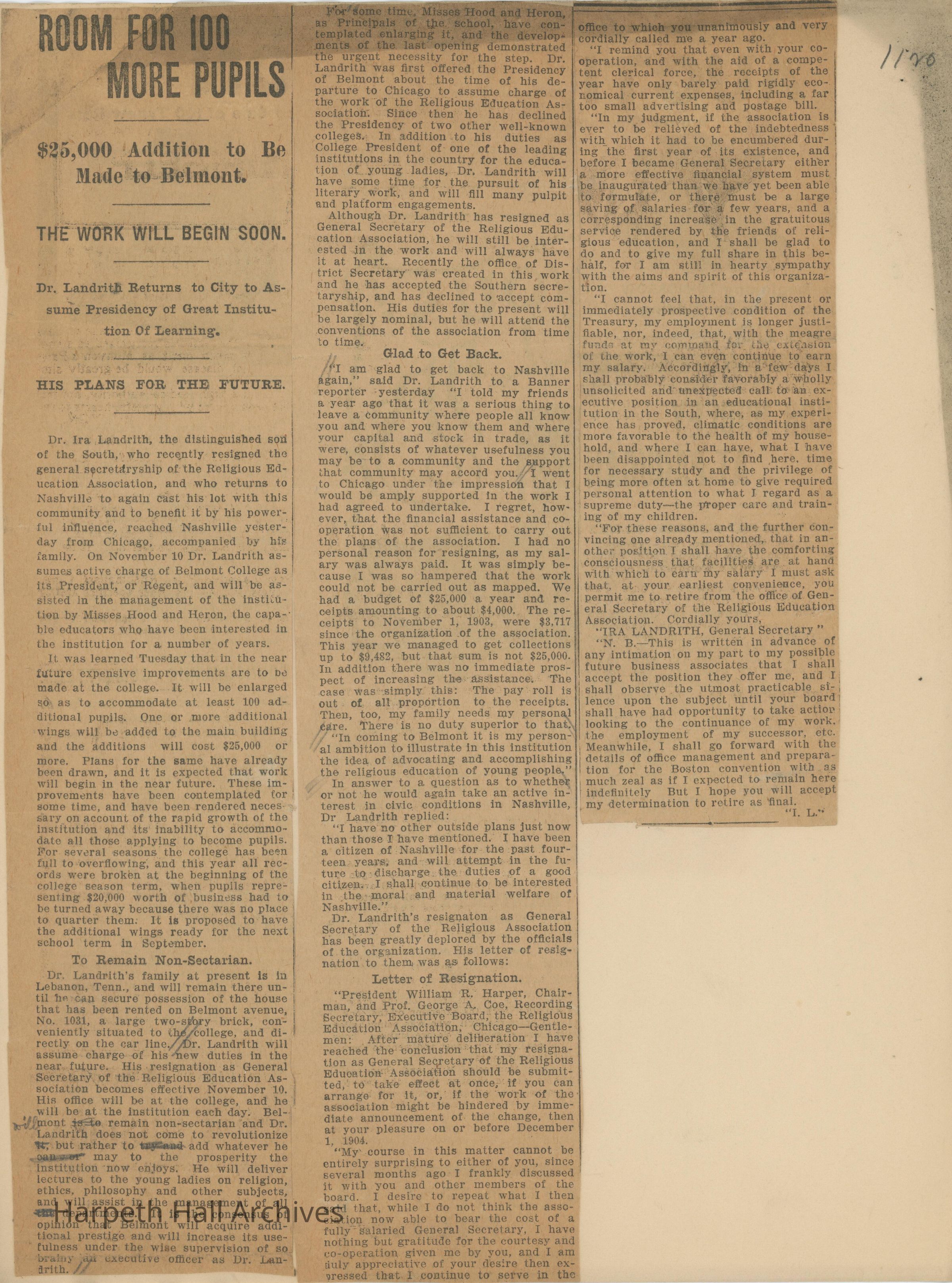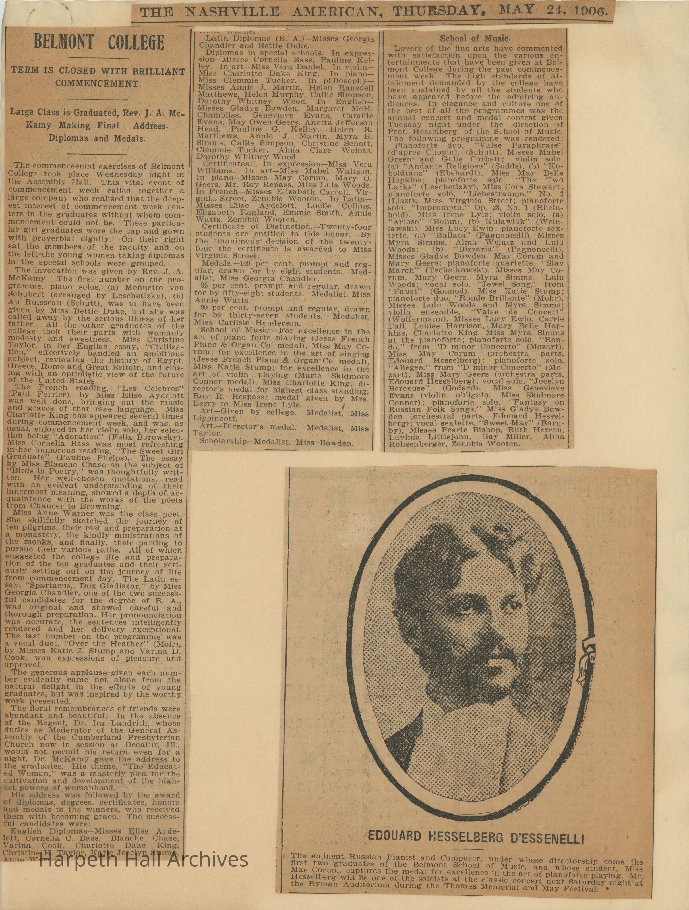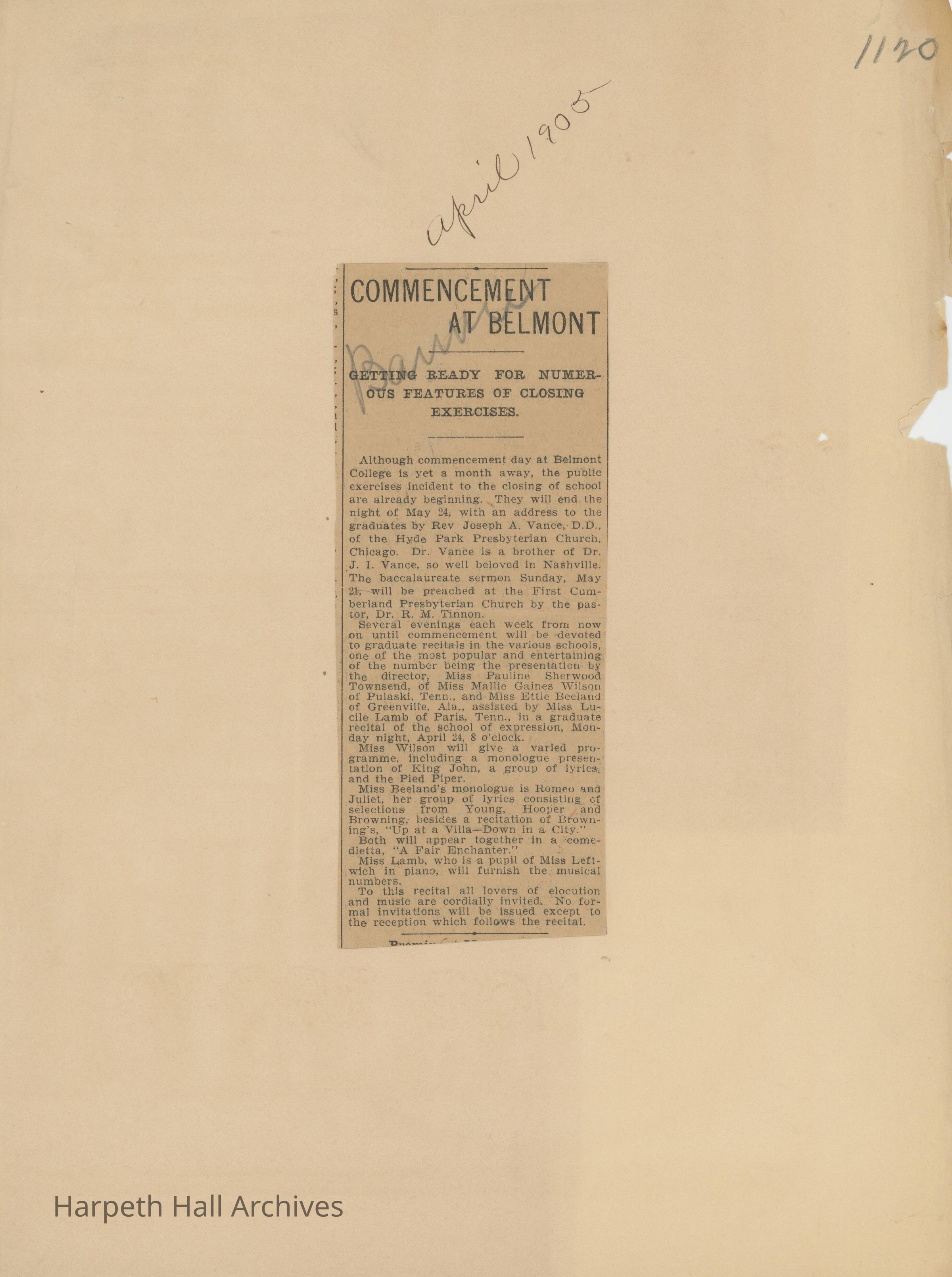 Newspaper clippings with articles about Belmont College for Young Women 1909-1915