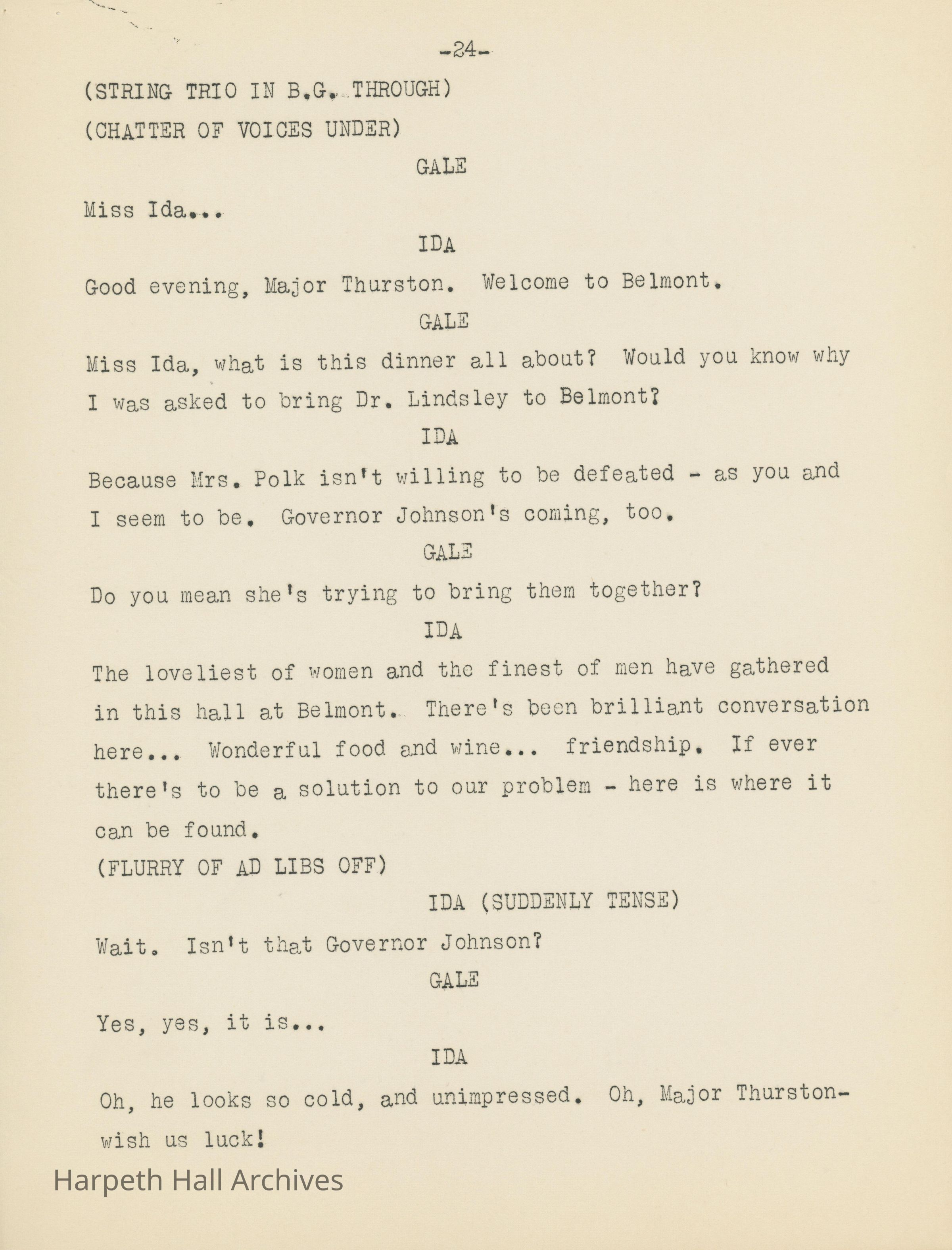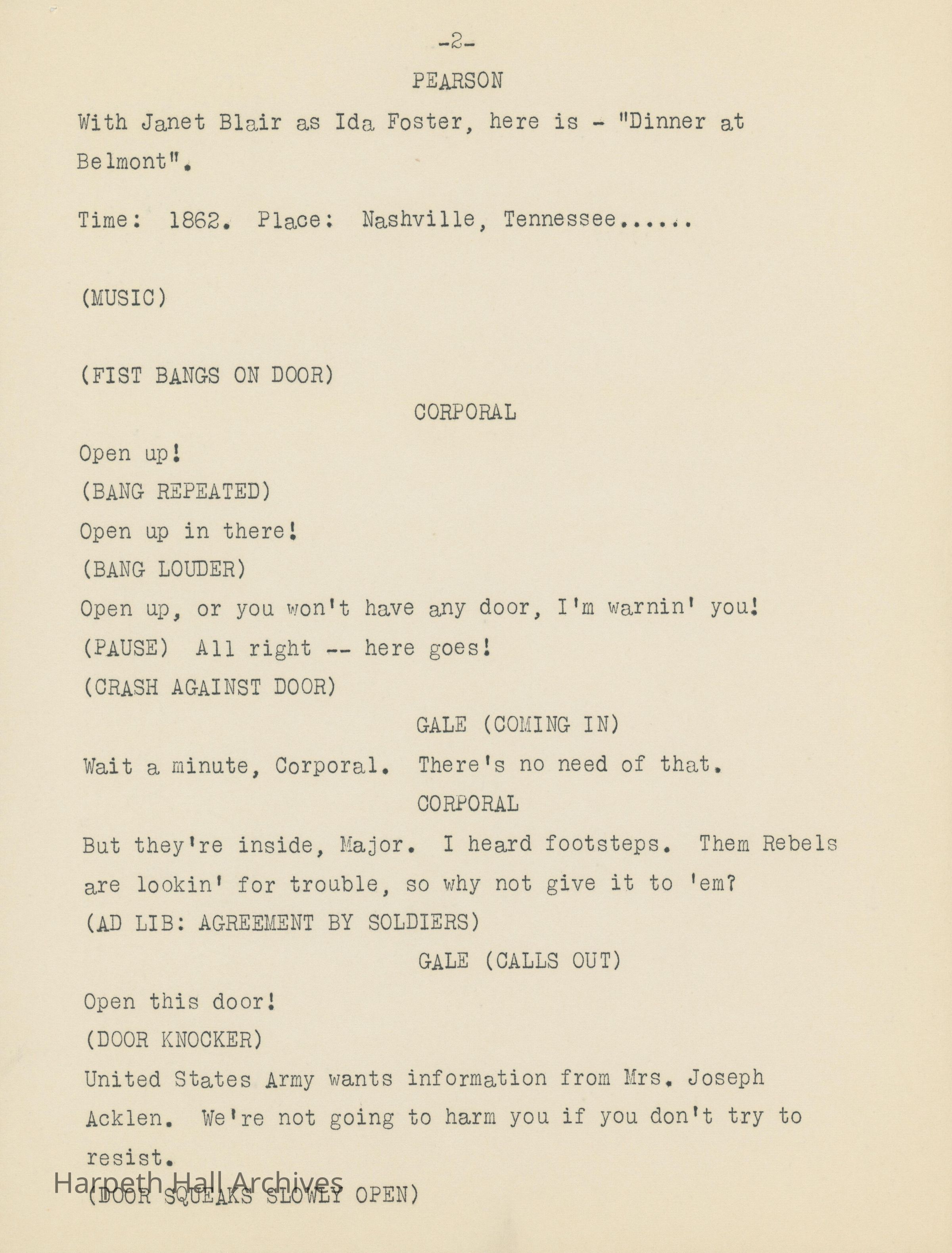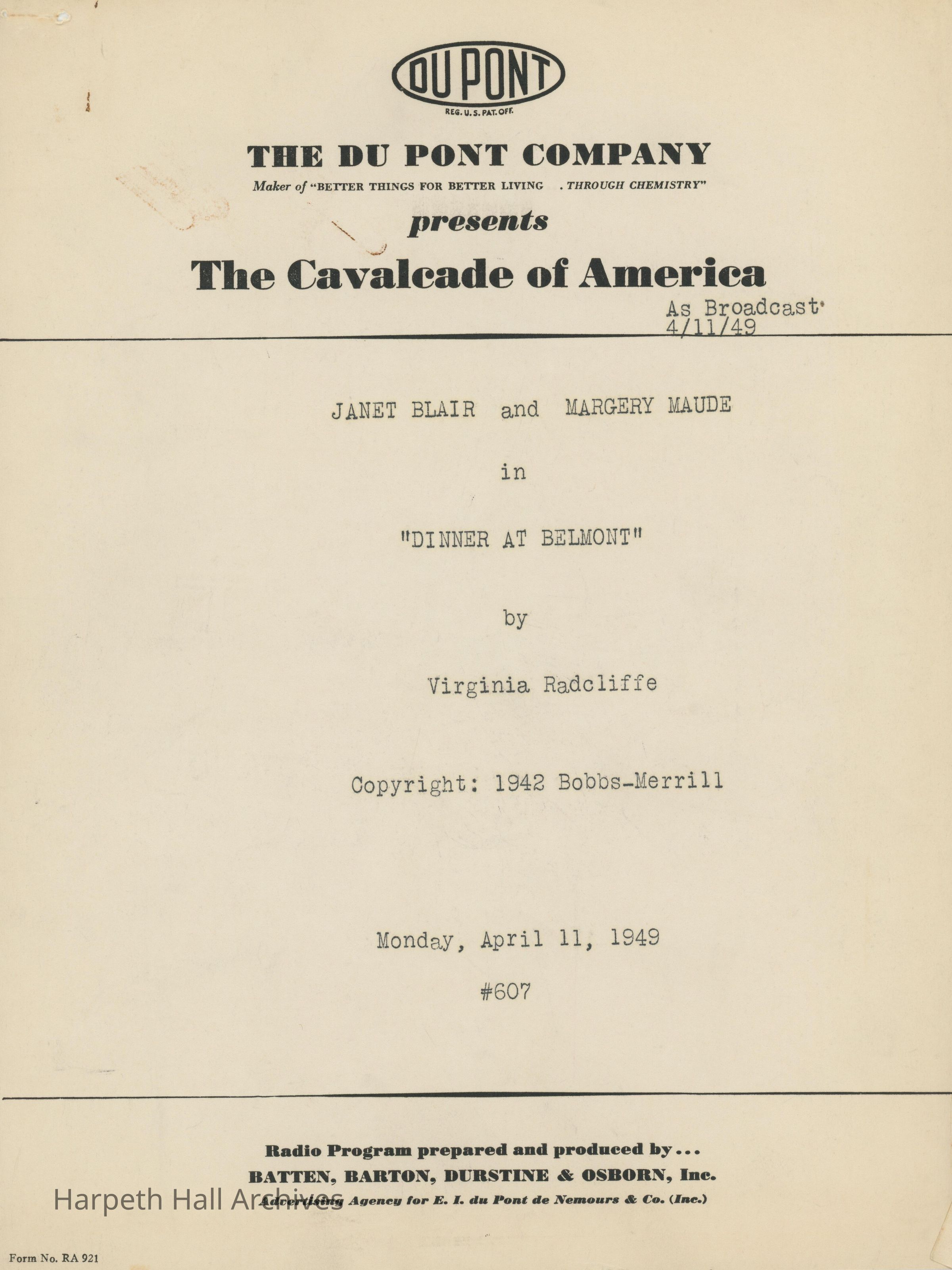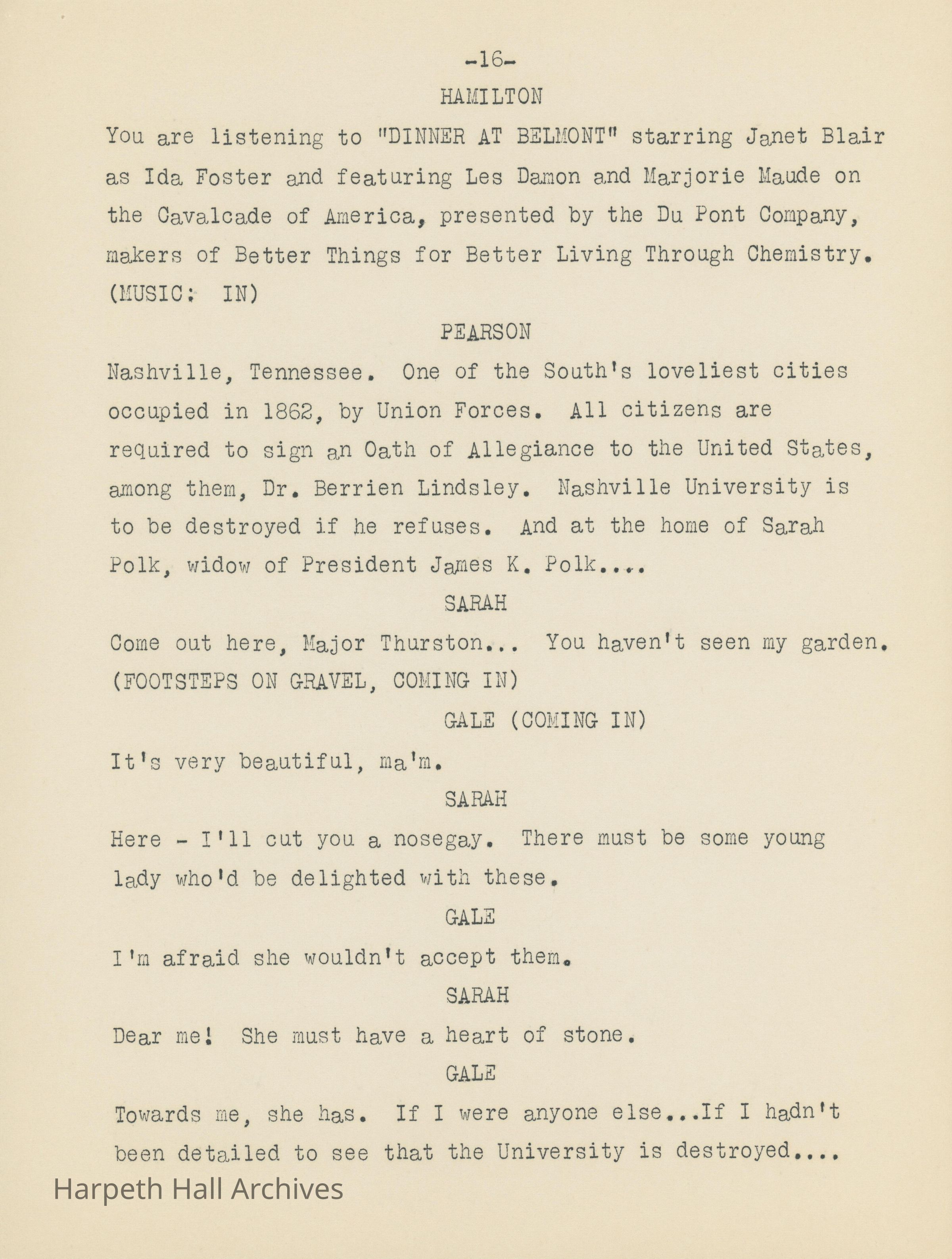 Ward-Belmont's script of "Dinner at Belmont" written by Virgina Radcliffe dated on April 11th, 1949.Collection