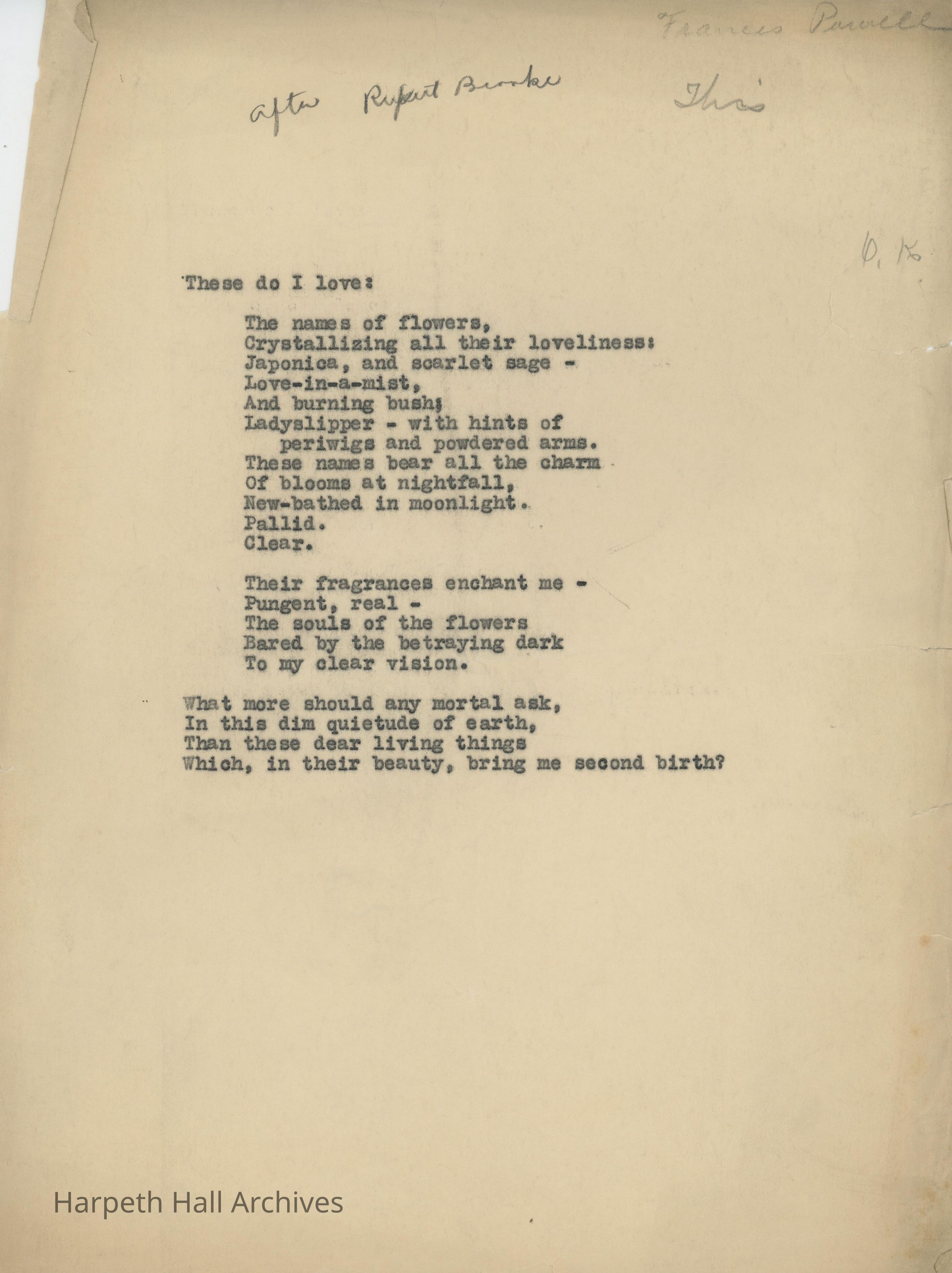 A poem entitled, "These do I love" written by Ward-Belmont student, Frances Powell.