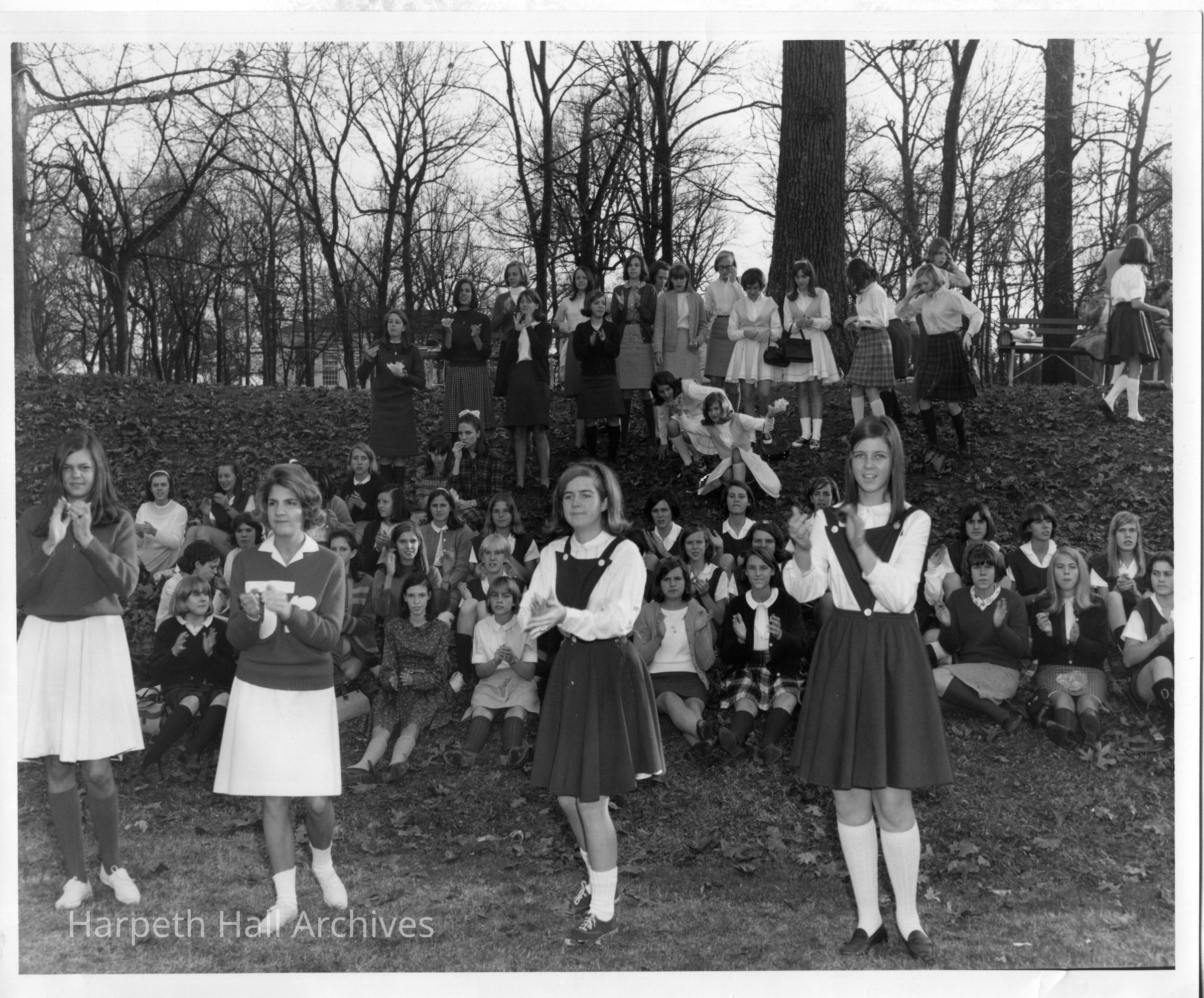 Four cheerleaders or club cheerleaders outside with student crowd behind them in 1964.