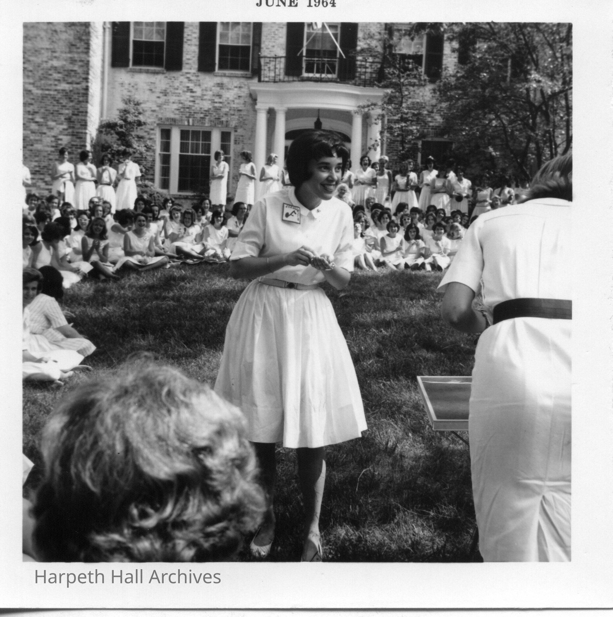 June "Junelle" McGaw Barras (1964) in 1964 in white dress among other students in white dresses and could possibly be Step Singing.