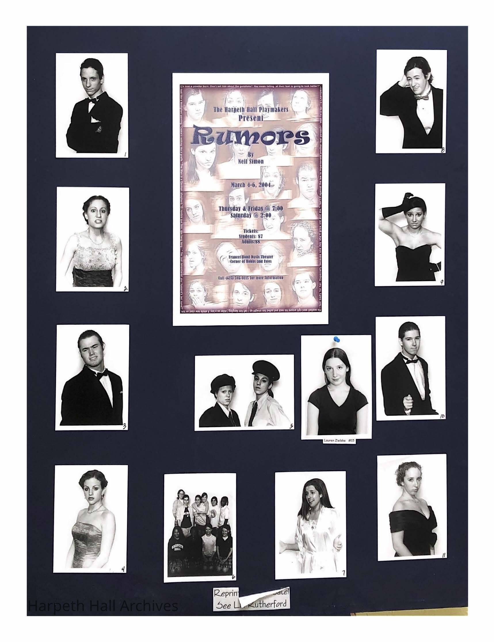 The cast board for the showing of Rumors put on by the Harpeth Hall Playmakers in March of 2004.