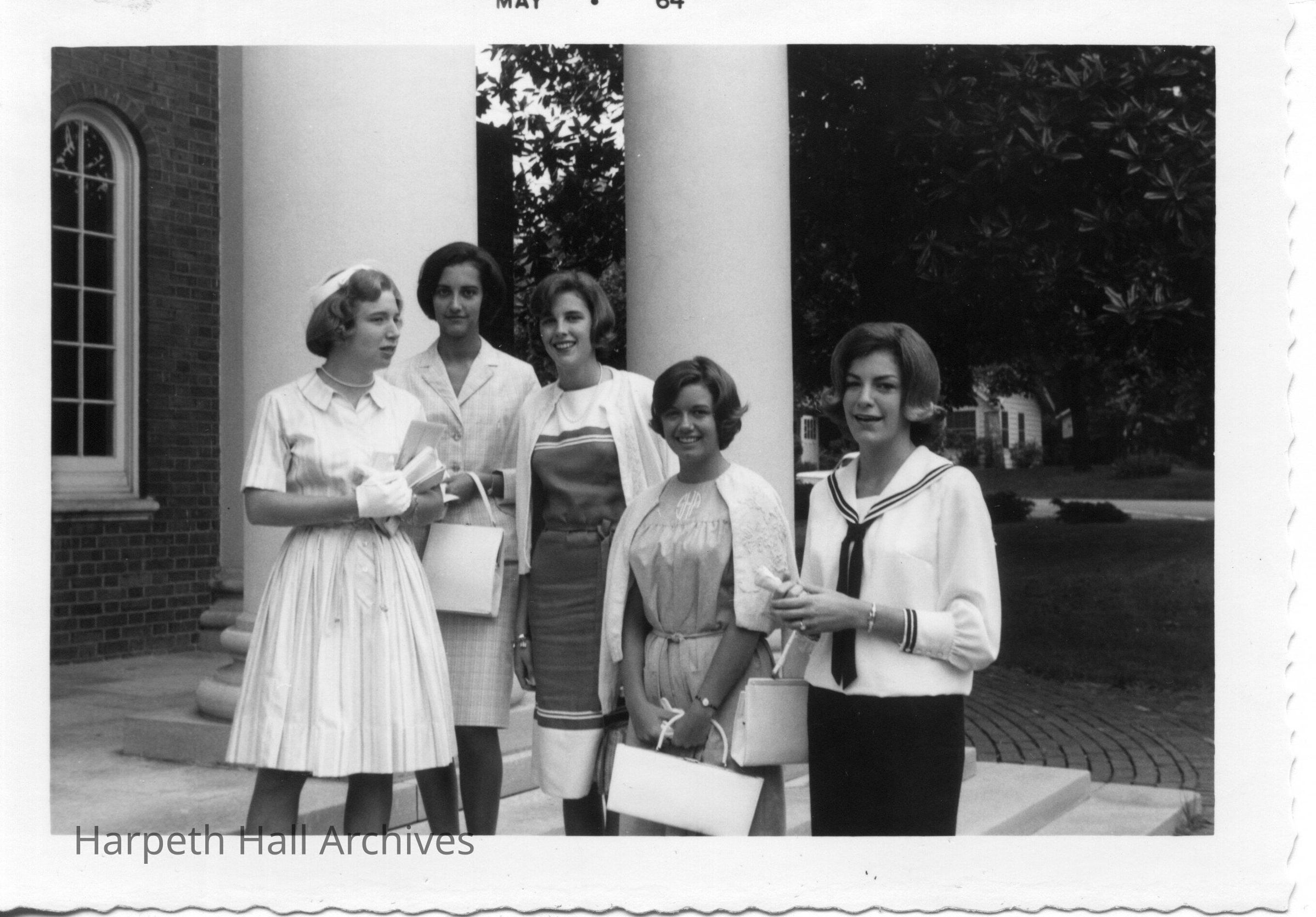 Five well dressed students in front of a building (not HH) in May of 1964.