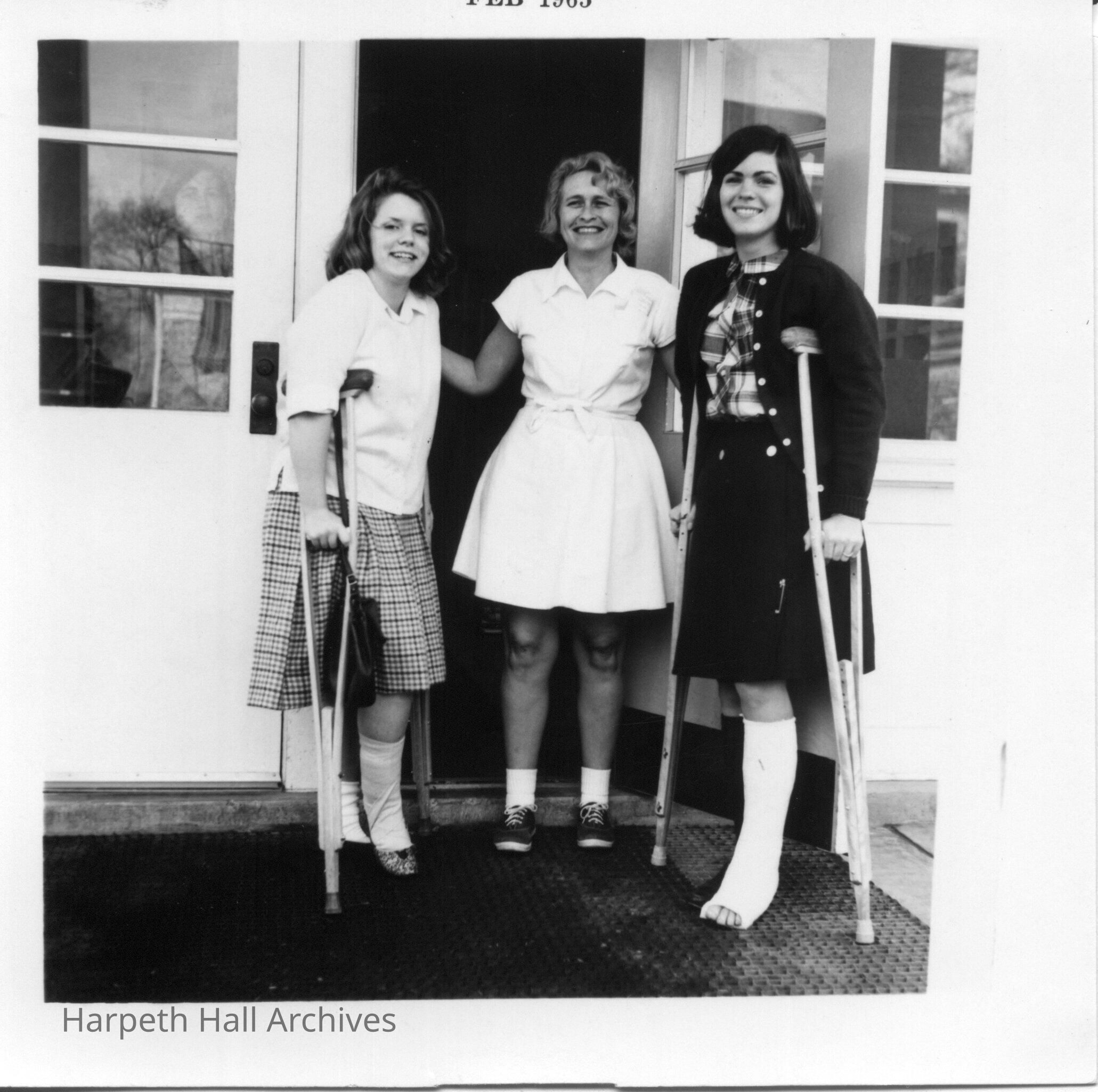 Catherine "Cathy" Anderson (1968), Patsy “Pat” Neblett Moran (1951, faculty), and Anne Martin Swain (1965) standing outside the door of a building and the 2 students are on crutches and in casts.Collection
