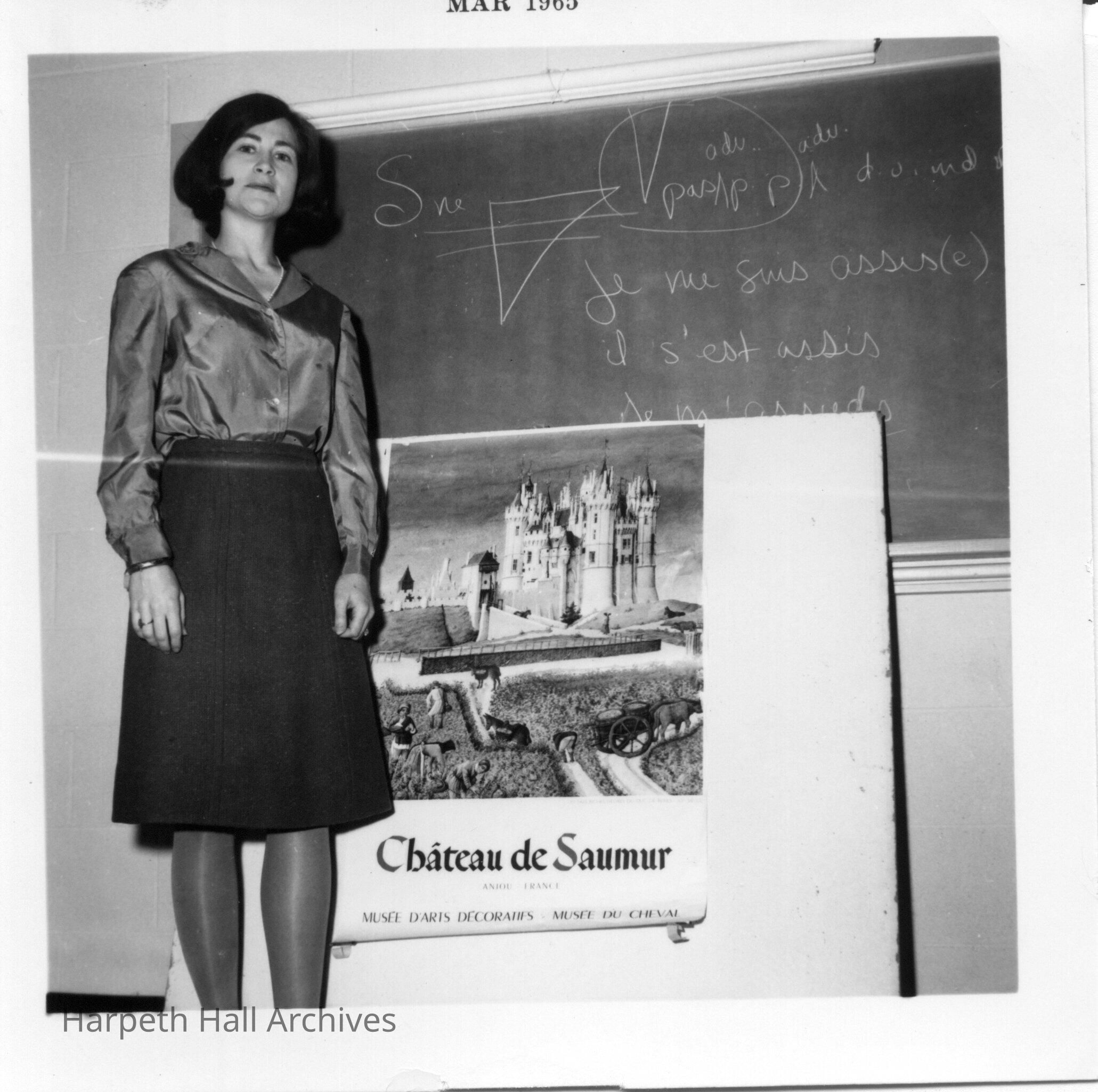French teacher, Lillian Stewart standing in front of chalkboard in her classroom in 1965.
