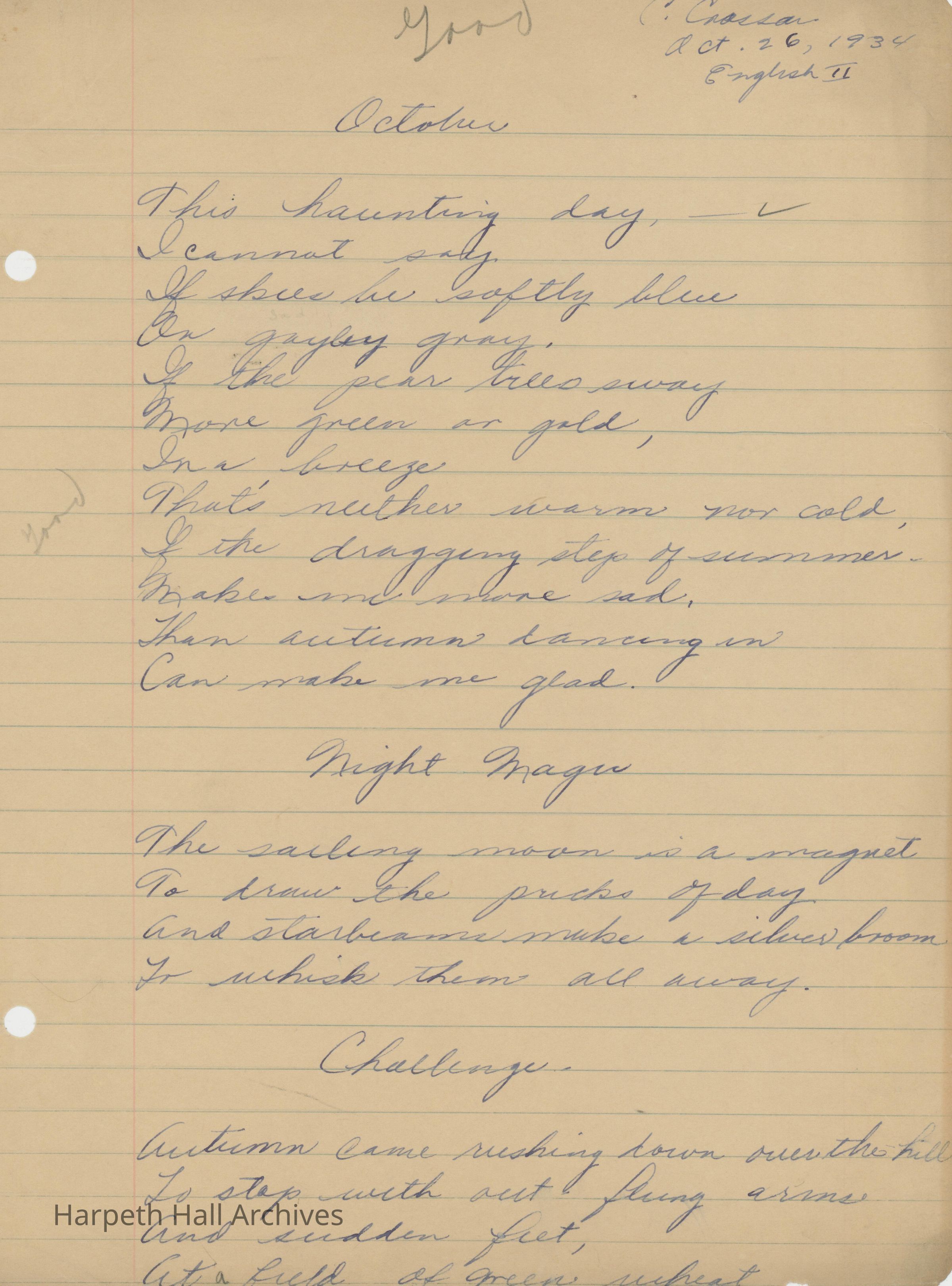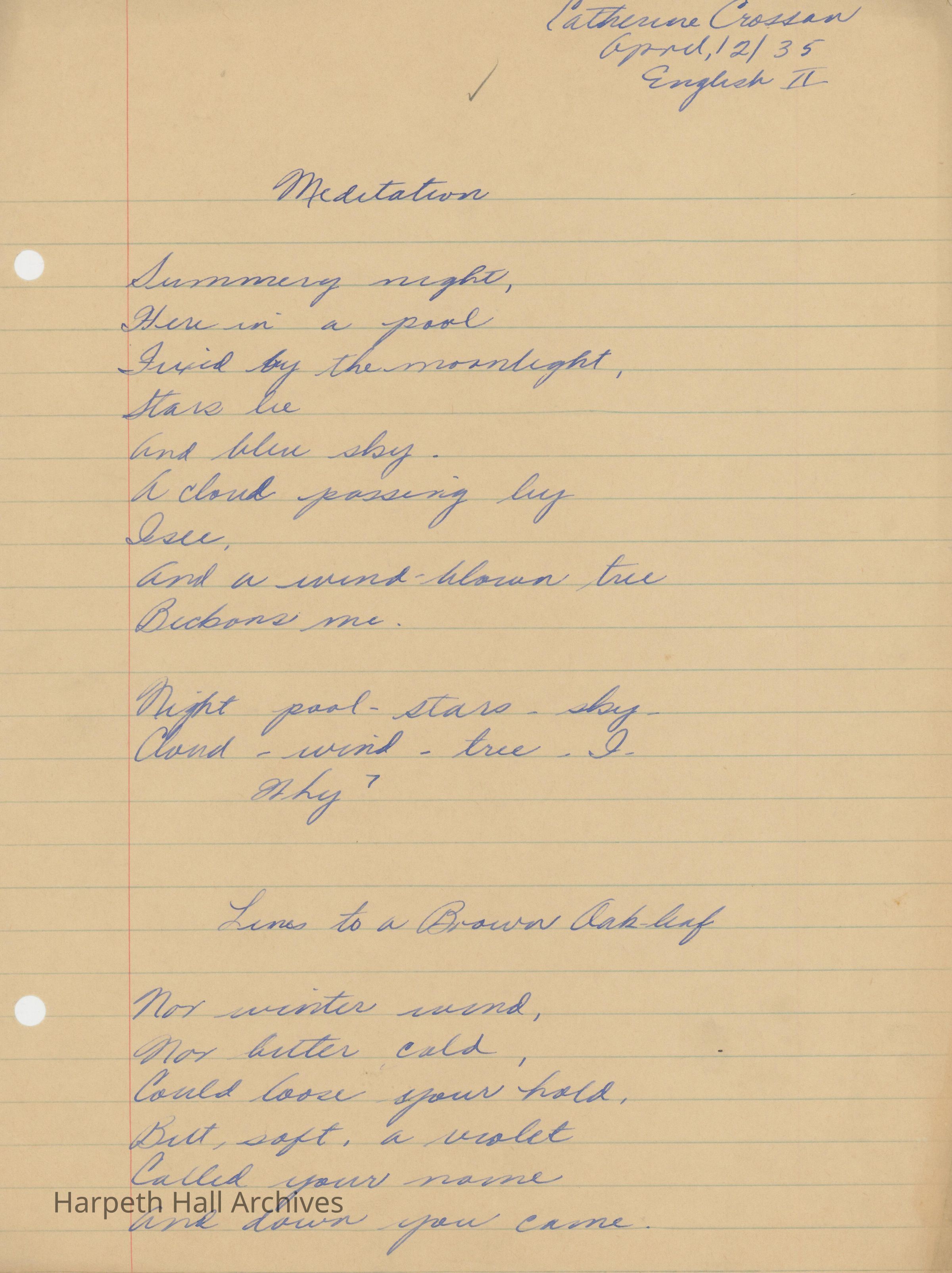 Poems written by Ward-Belmont student Catherine Crossan on October 26th, 1934 and April 12th, 1935 for her English II class.Collection
