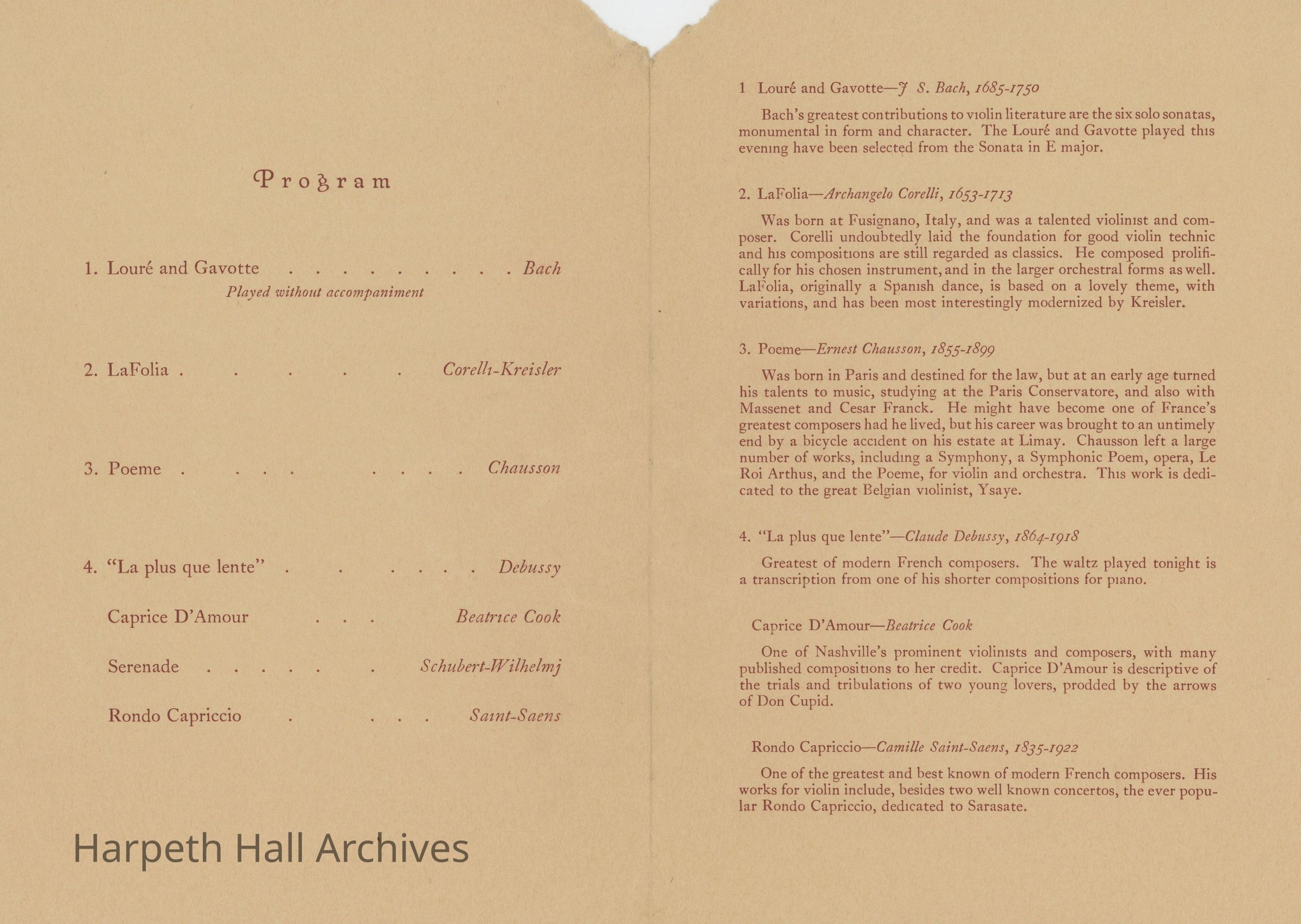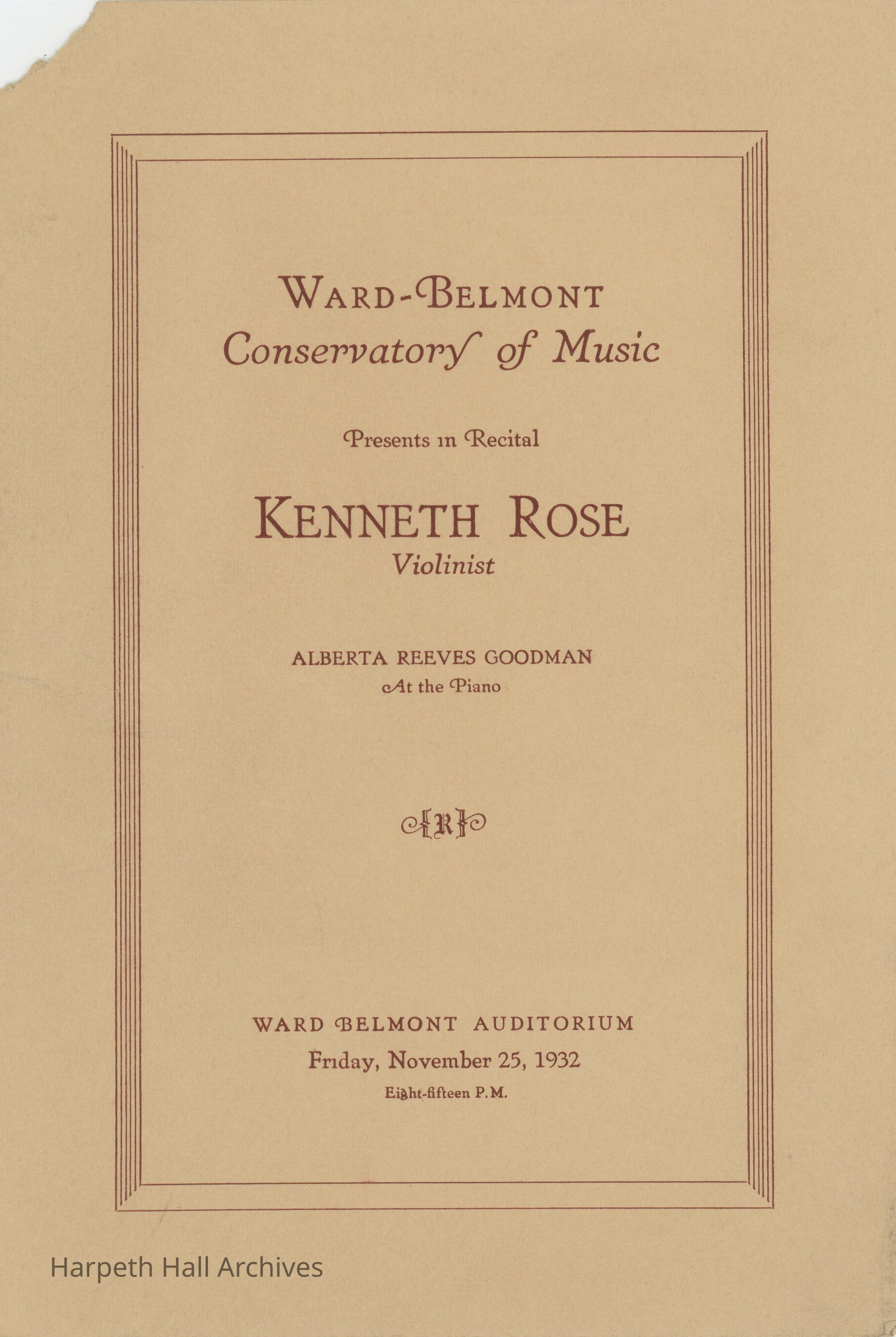 The program for the Kenneth Rose Violin Concert on November 25th, 1932. The concert was presented by the Ward-Belmont Conservatory of Music. Mr. Rose was the head of the Violin department at Ward-Belmont.Collection