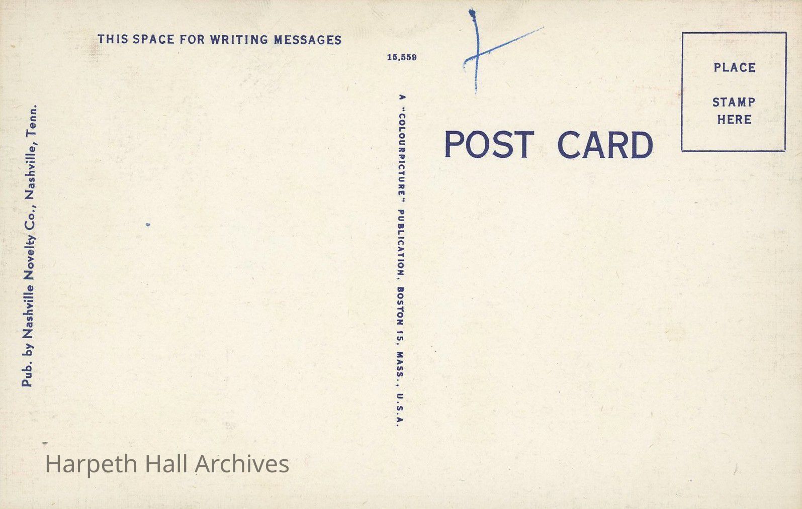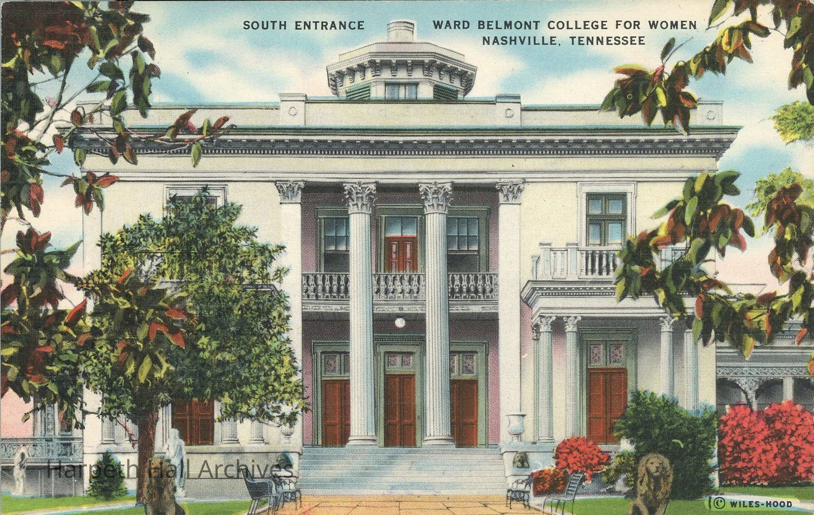 A postcard featuring an image of the south entrance of Ward-Belmont's campus in Nashville, Tennessee. The card, copyrighted by Wiles-Hood, was a "colourpicture" publication and was published by Nashville Novelty Co.Collection