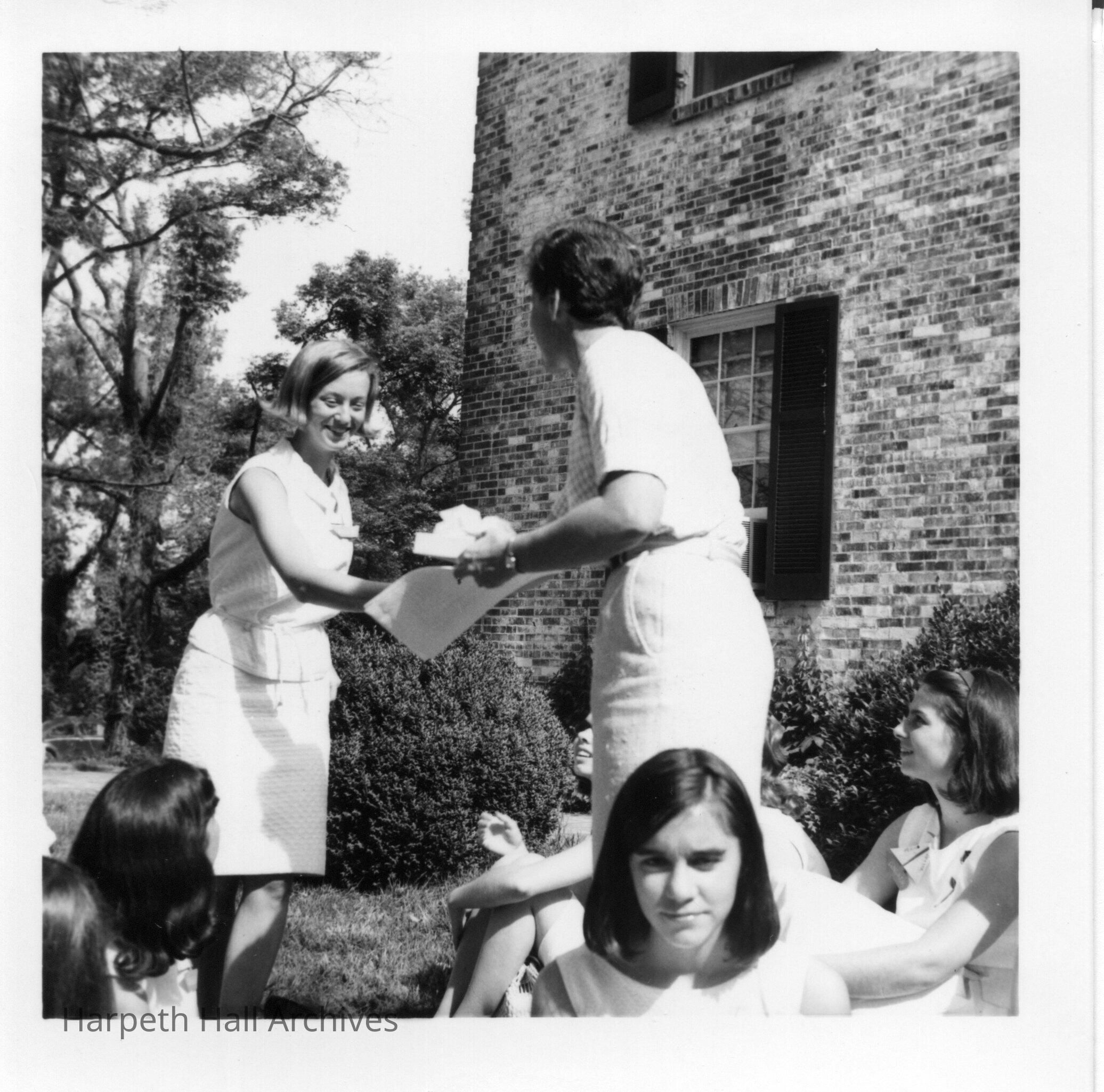 Paula Hughey (1966) accepting something in front of Souby Hall at Harpeth Hall