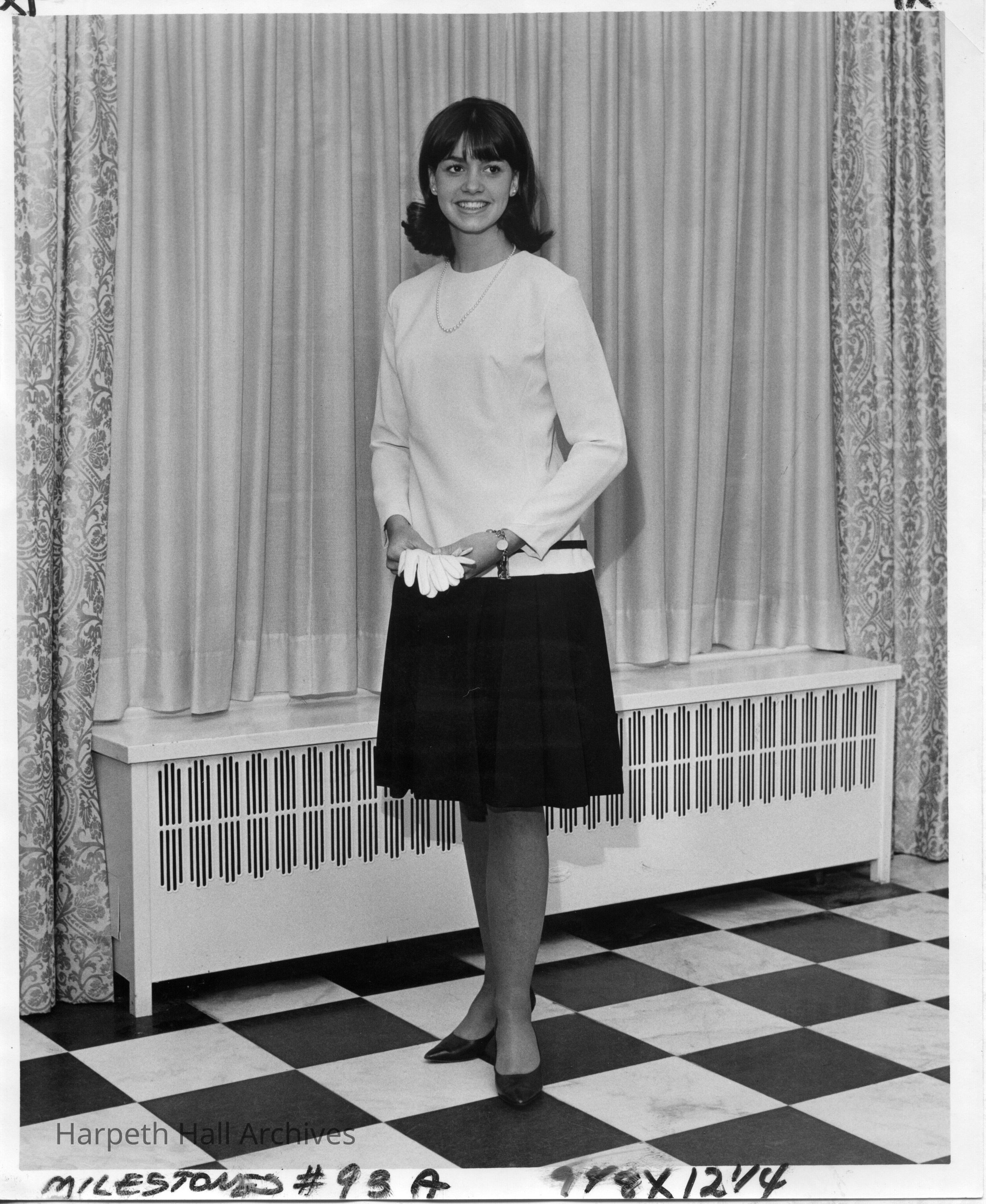 Louise "Weezie" Dortch Green (1967) poses in Souby Hall in dress and white gloves.