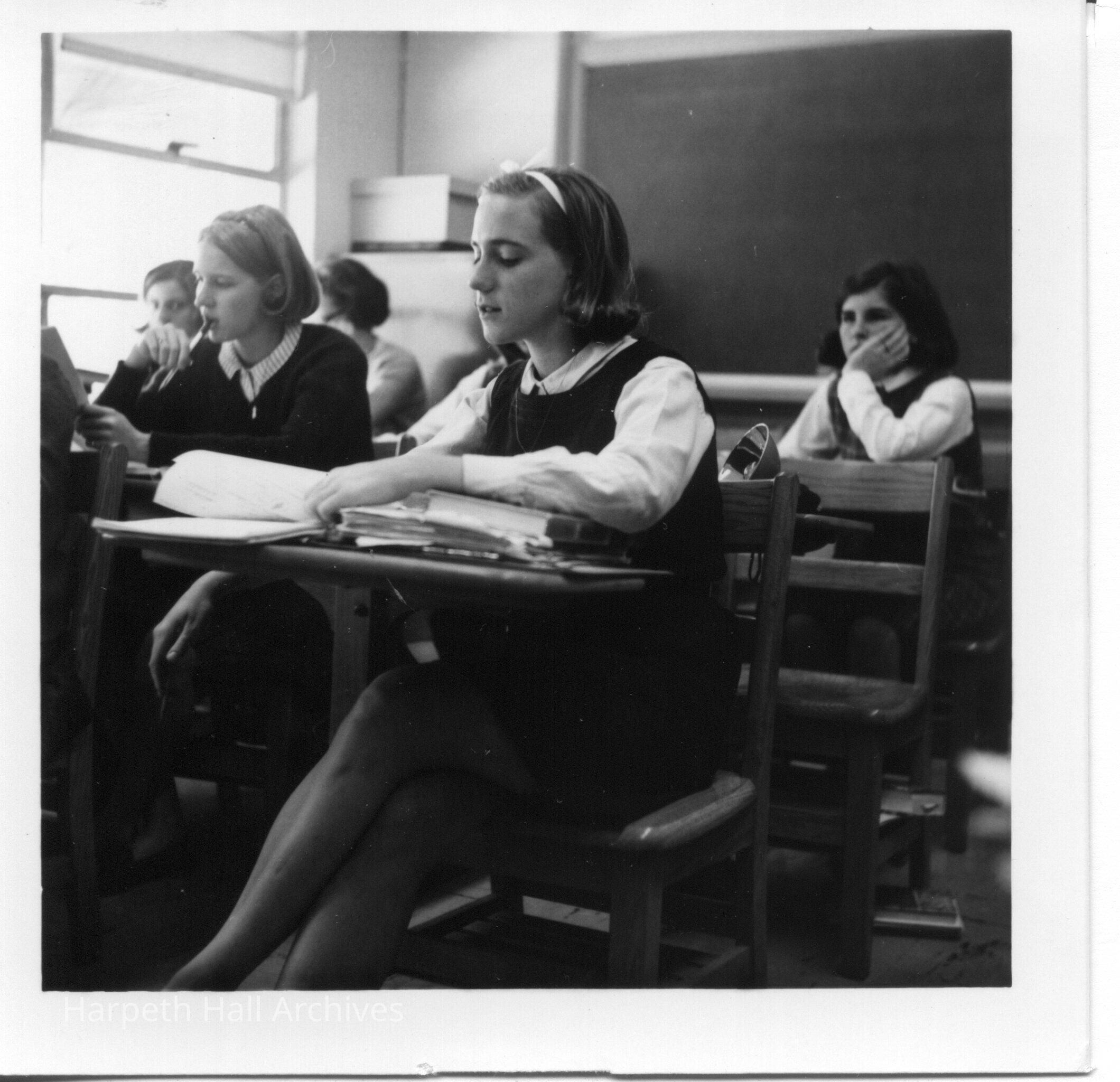 Lillian "Lil" Dobson McAulay (1967) seated at desk during class.
