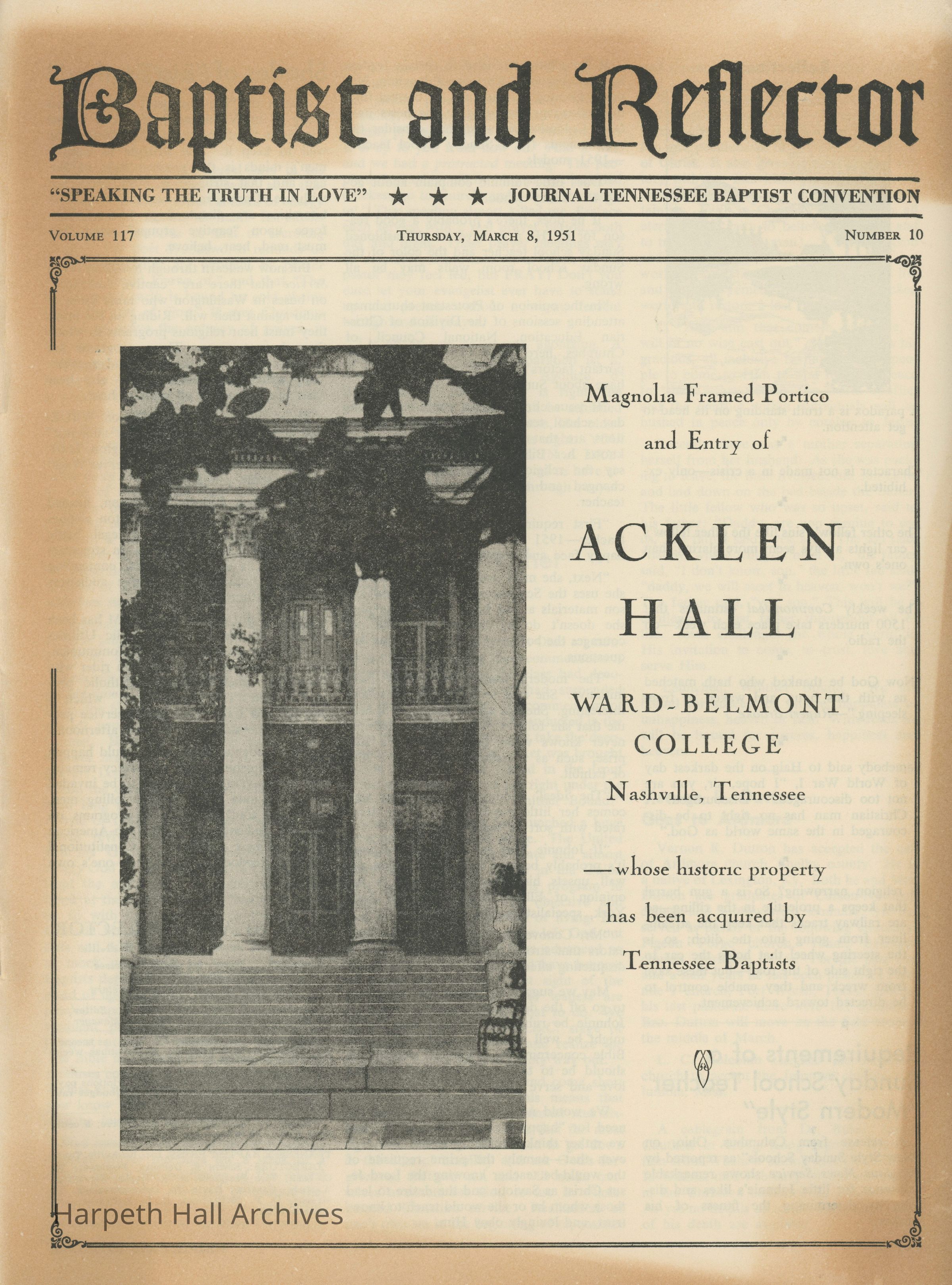 "Baptist and Reflector" Volume 117, number 10. This edition focuses on the Tennessee Baptist Convention moving its headquarters to their recently acquired Ward-Belmont property.Collection