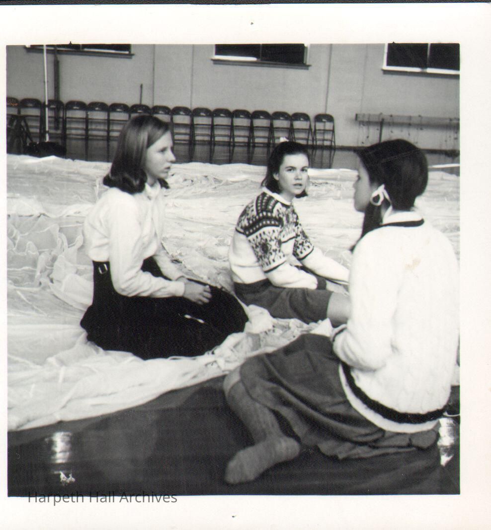 Three students sitting on the gym floor with white sheet in 1968.