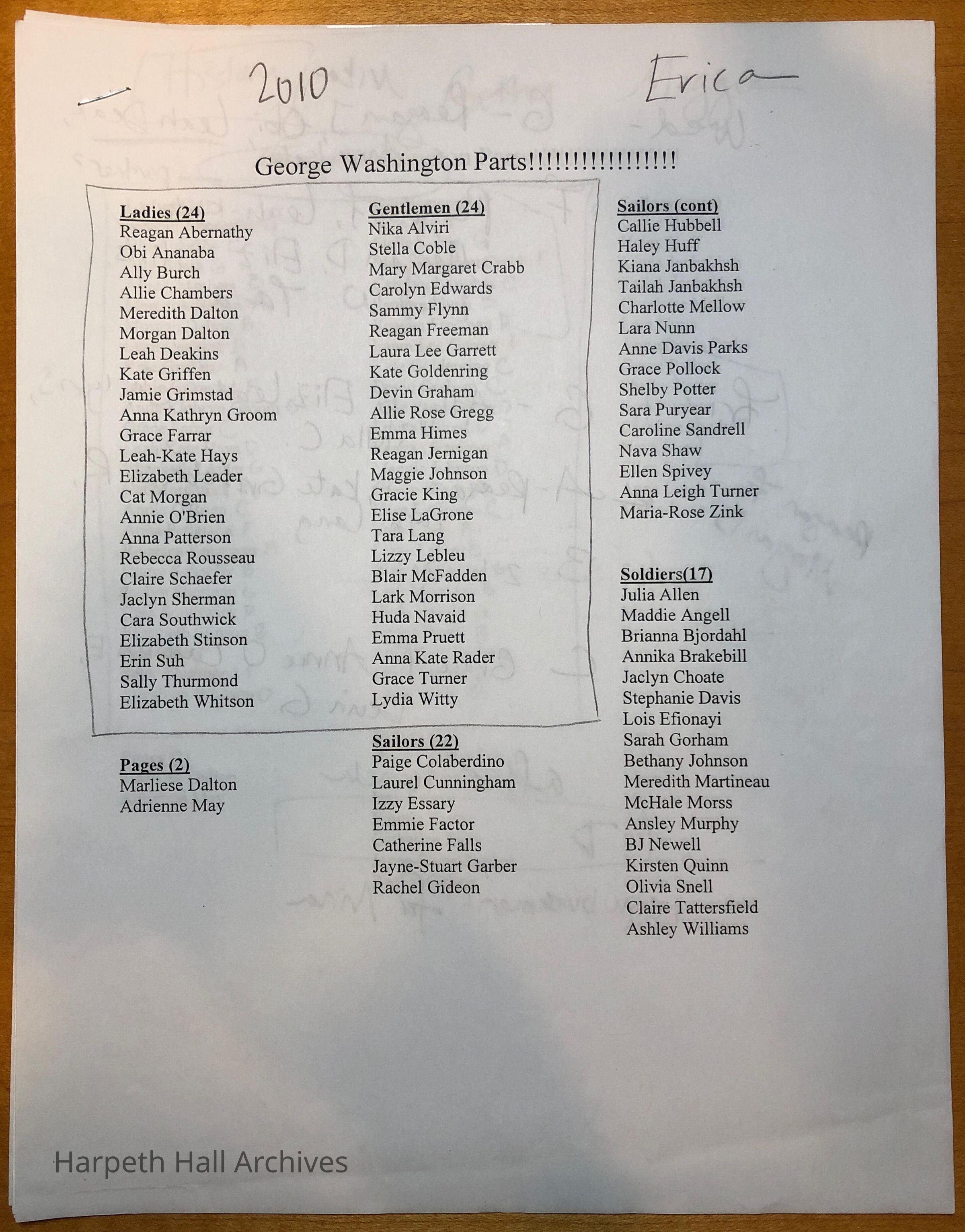 The list of roles for the George Washington Day Celebration in 2010 put on by the class of 2015 when they were in seventh grade.Context