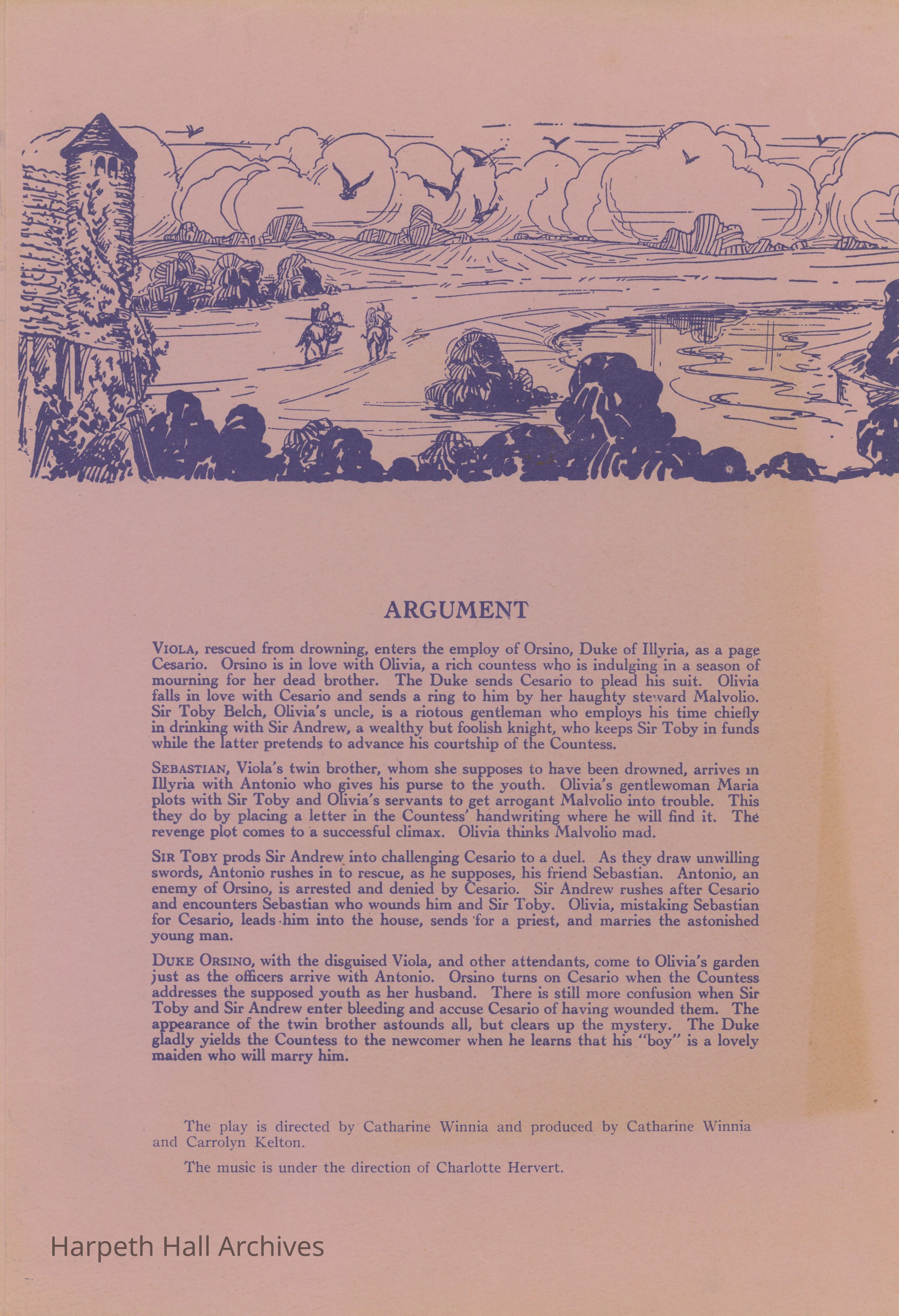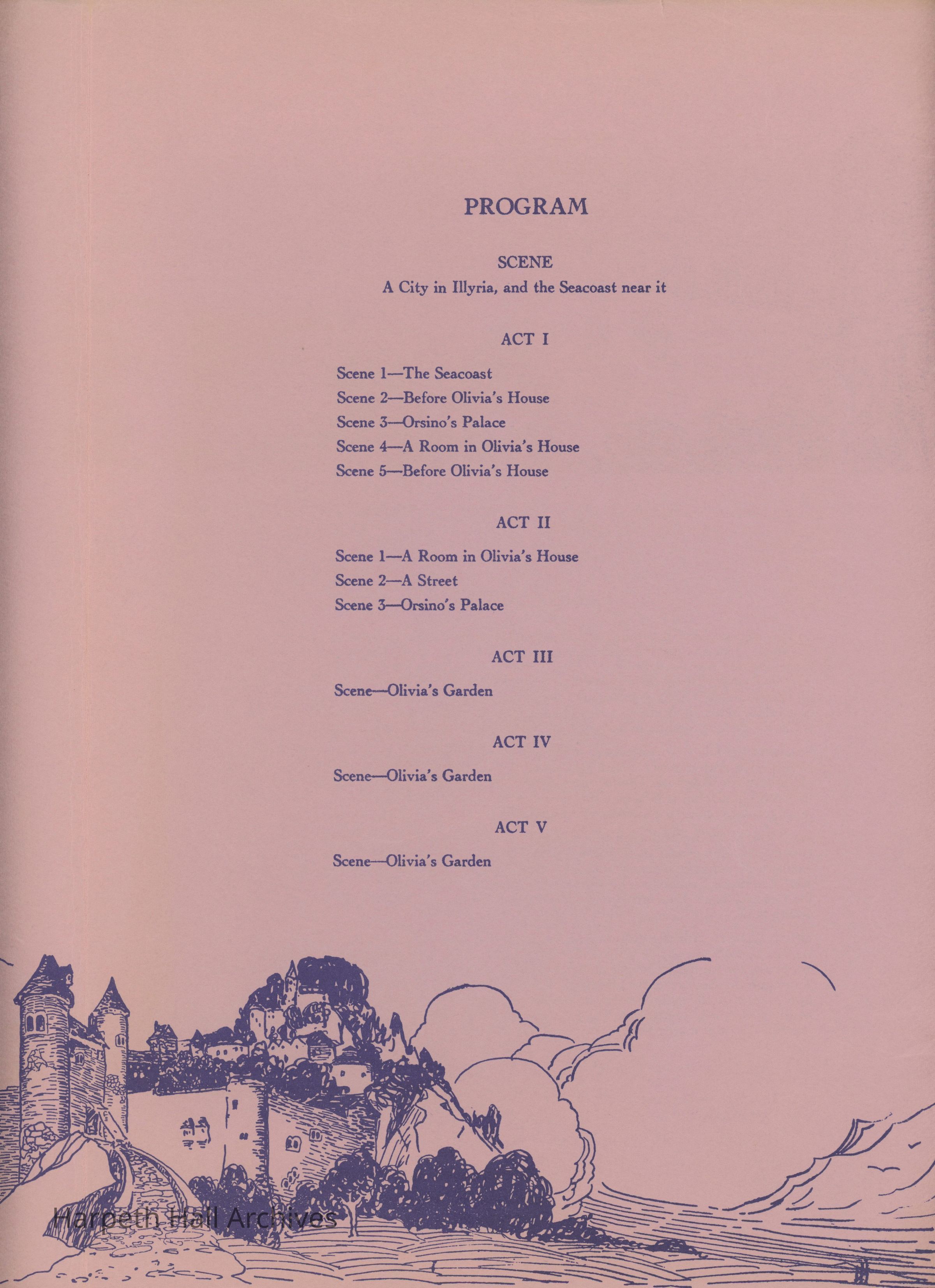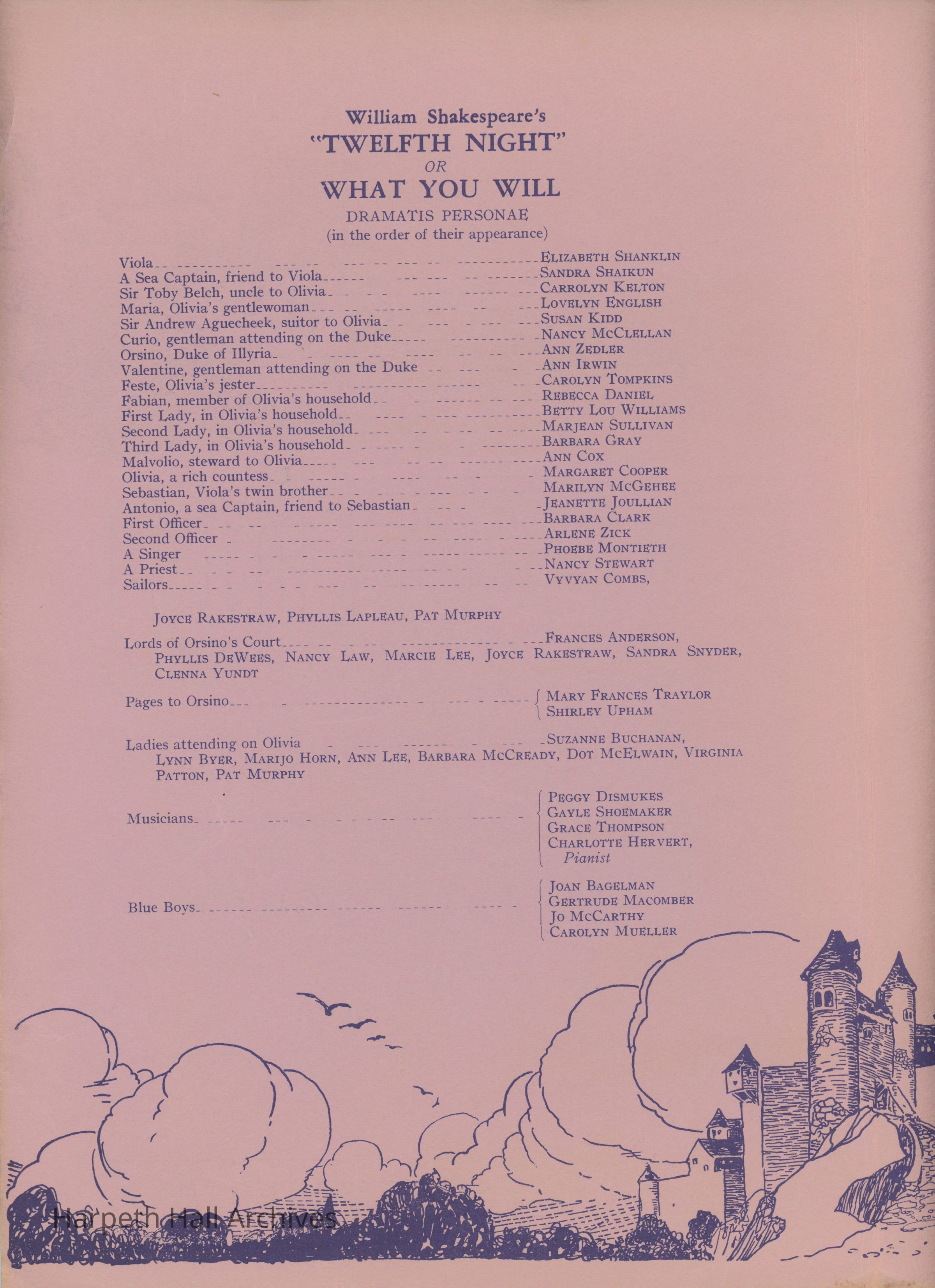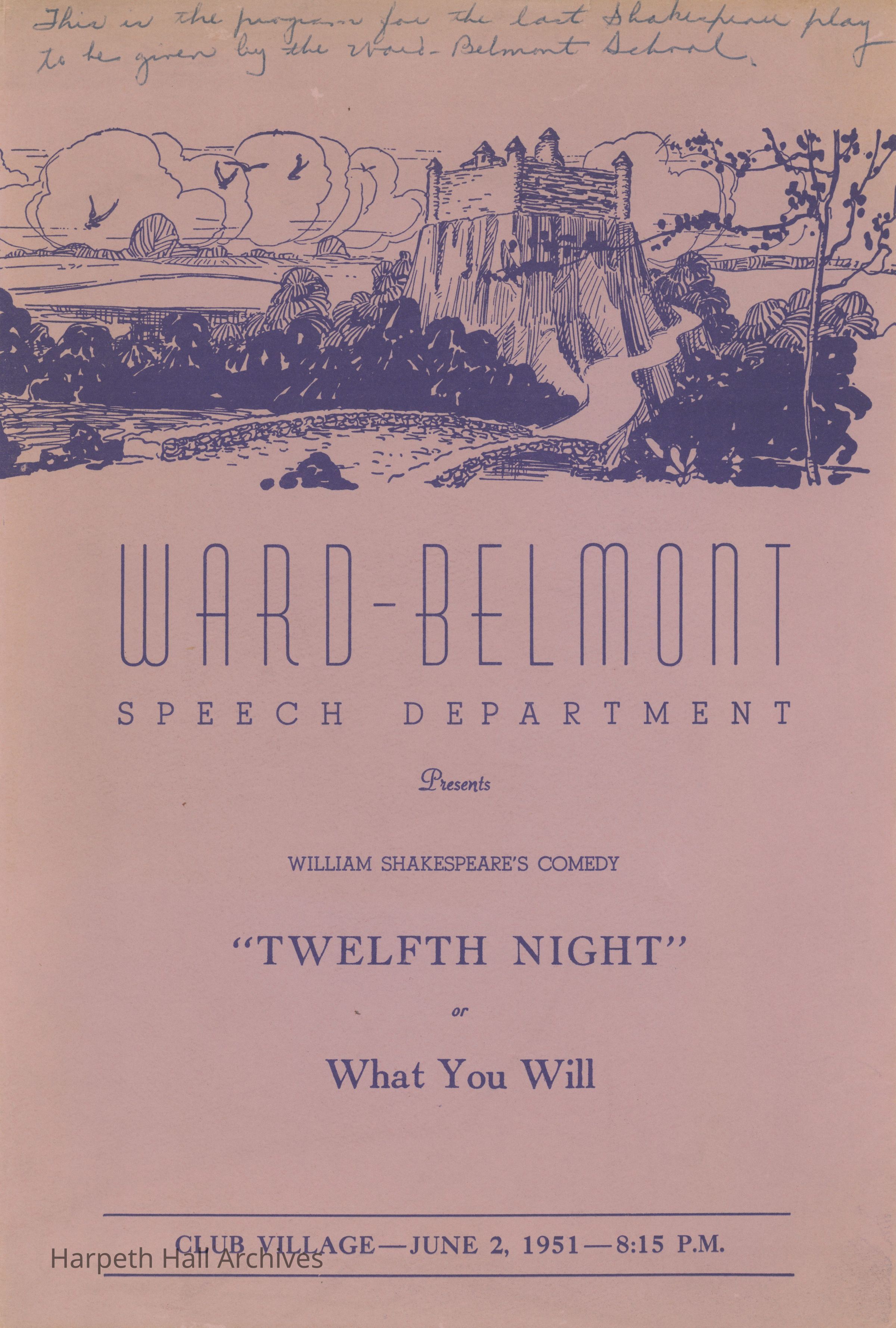 Program for the last Shakespeare play in the Ward-Belmont School. The speech department performed "Twelfth Night." Actors included Elizabeth Shanklin, Sandra Shaikun, Carrolyn Kelton, Lovelyn English, Susan Kidd, Nancy McClellar, Ann Zedler, Ann Irwin, Carolyn Tompkins, Rebecca Daniel, Betty Lou Williams, Marjean Sullivan, Barbara Gray, Ann Cox, Margaret Cooper, Marilyn McGeher, Jeanette Joullian, Barbara Clark, Arlene Zack, Phoebe Montieth, Nancy Stewart, and Vyvyan Combs.Collection