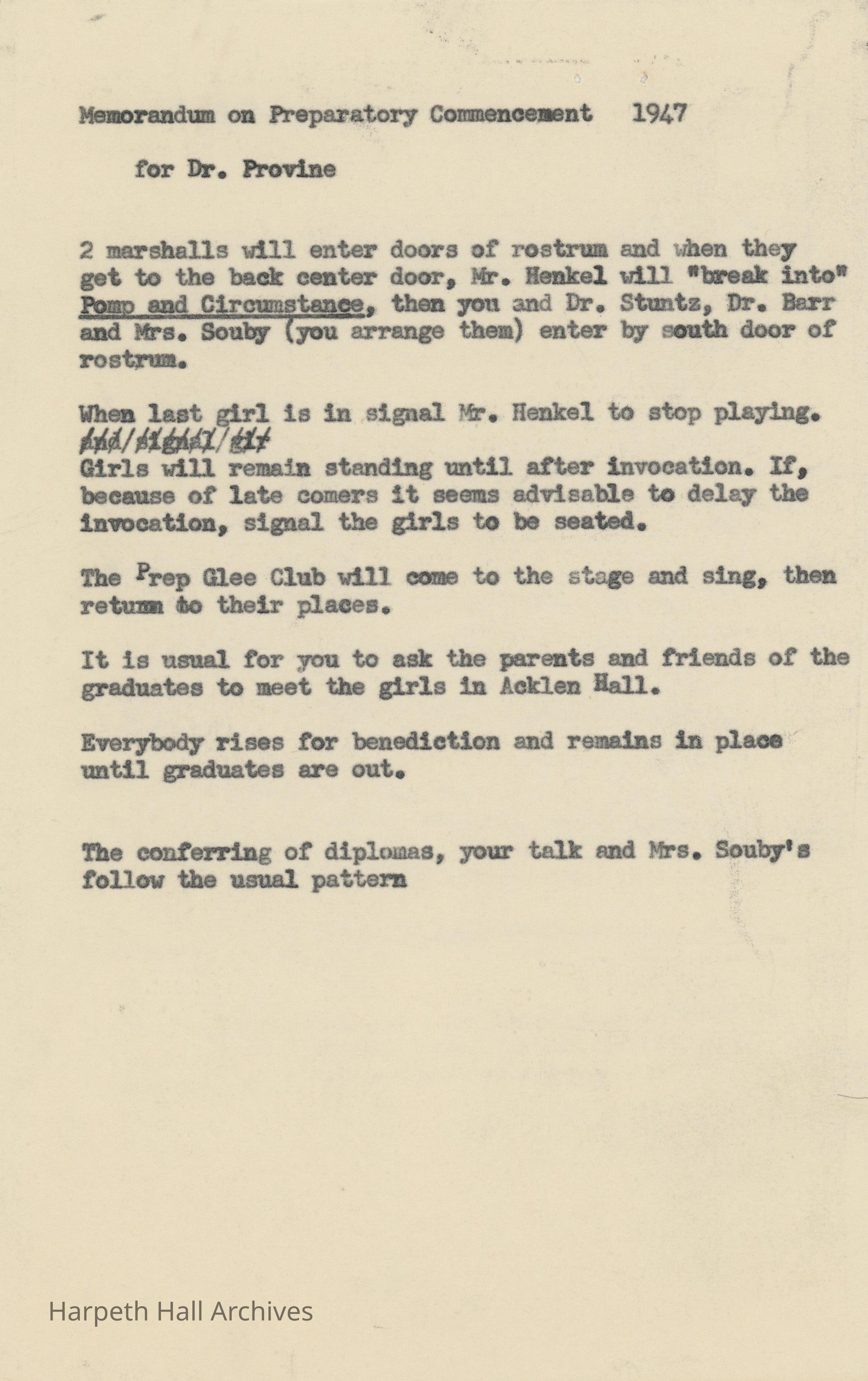 Memorandum on Preparatory Commencement for Dr. Provine sent in 1947.Collection