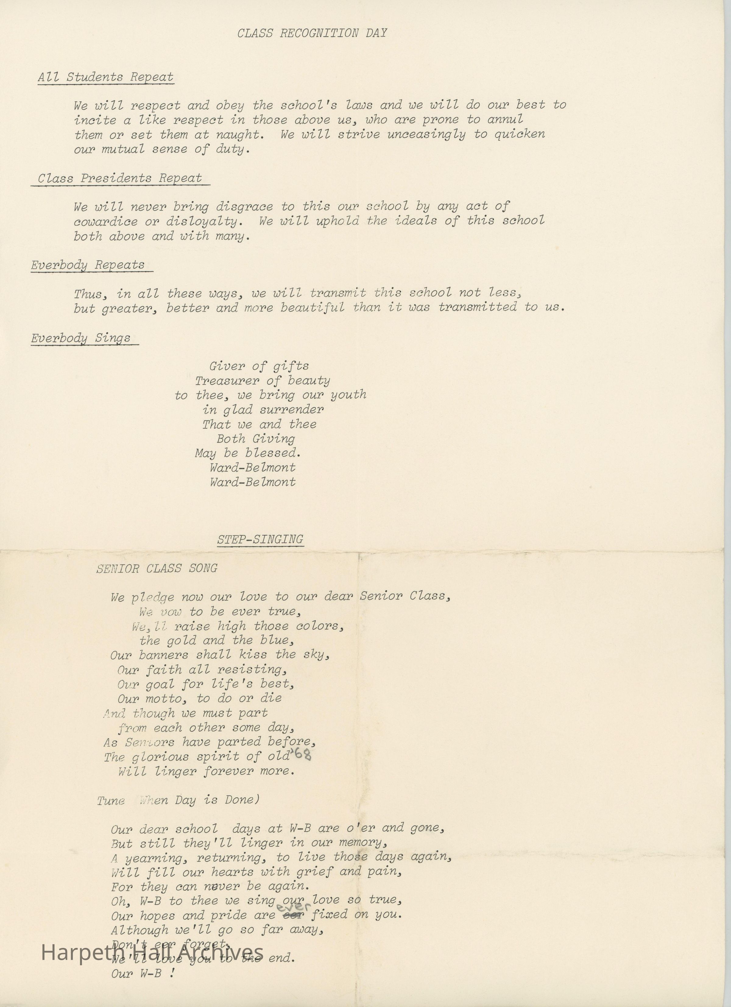 The script used for Ward-Belmont Class Recognition Day which is now known at Harpeth Hall as Step-Singing.Collection
