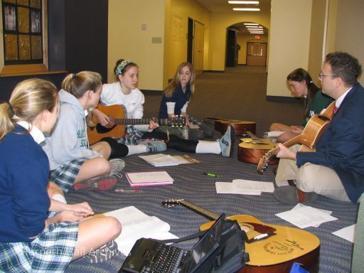 Teacher Joe Croker sits with students in a group circle while playing a guitar during Winterim 2007. Are you pictured in this photograph, do you know someone who is, or do you know where it was taken? Please contact the Harpeth Hall archives!Context