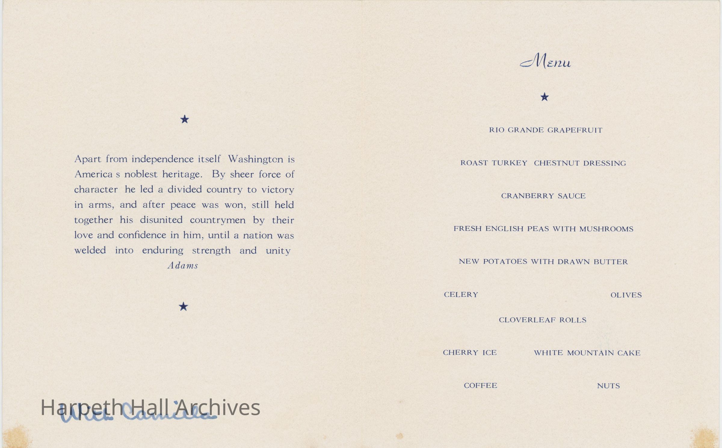 The menu for a dinner celebrating George Washington's birthday put on by Ward-Belmont on February 22nd, 1938.Context