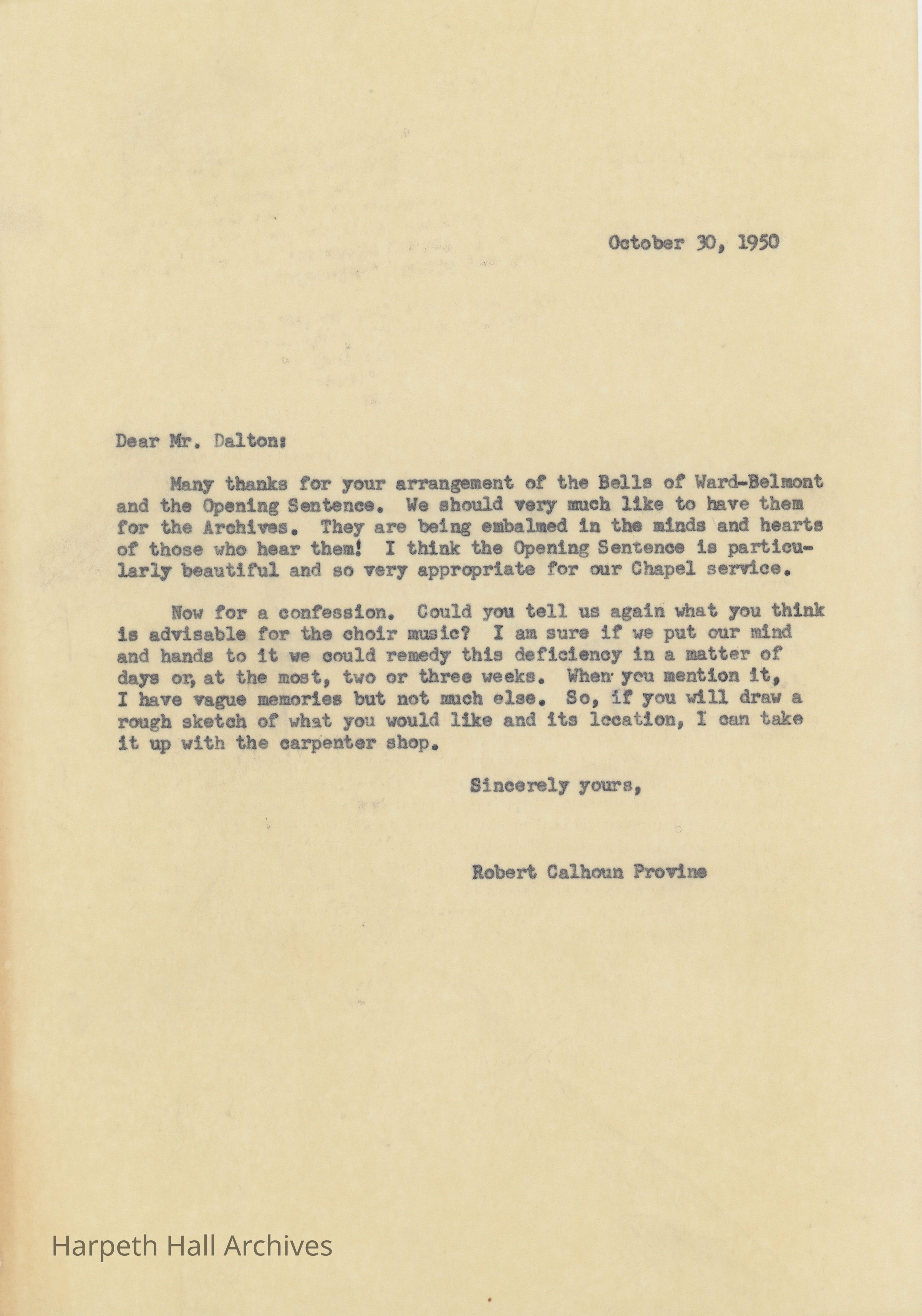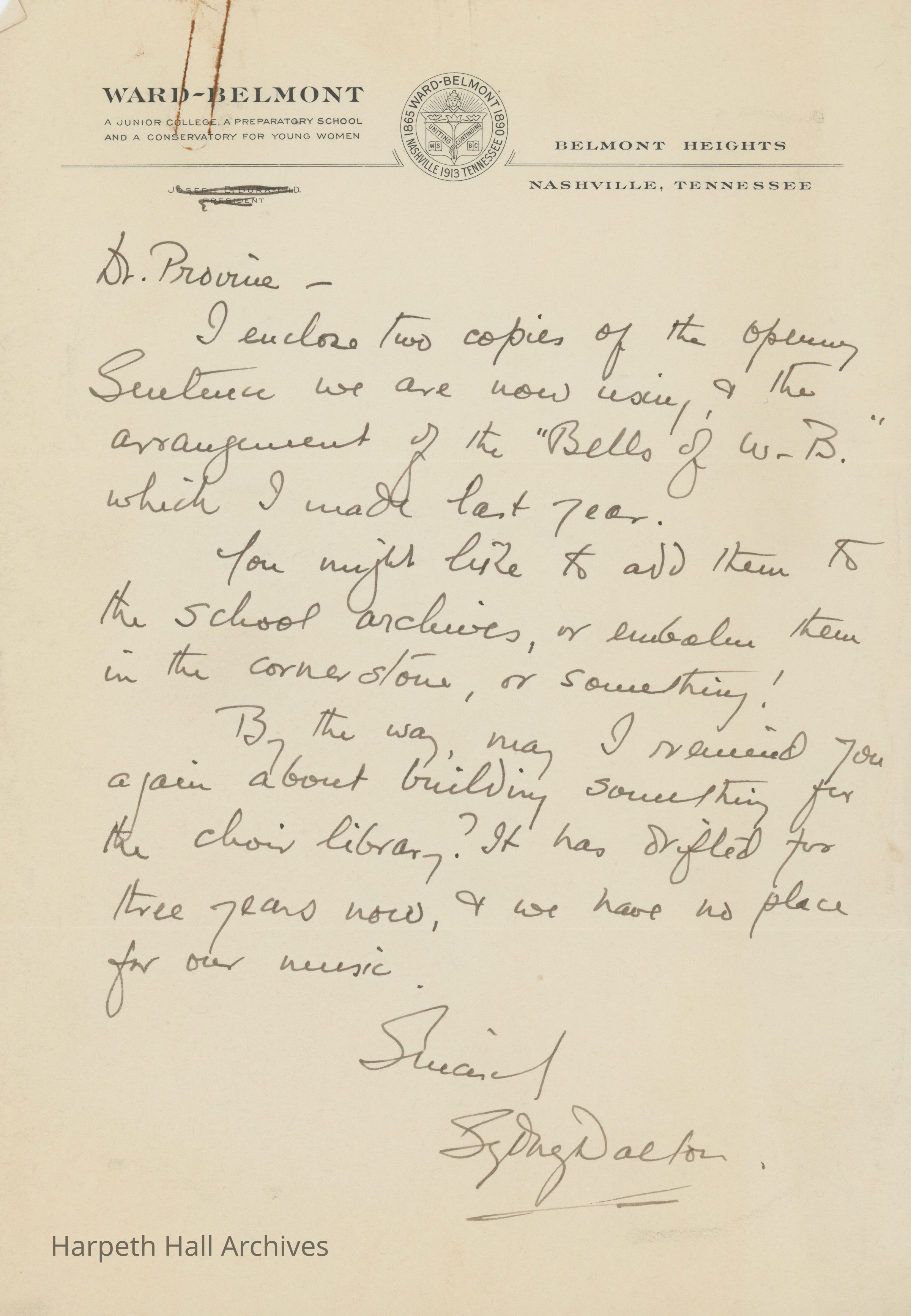 Letter of gratitude from Robert Provine to Mr. Dalton, thanking him for arranging the song the Bells of Ward-Belmont. The letter notes saving a copy of the sheet music for the archives. A follow-up letter from Mr. Dalton that notes he sent two copies of the arrangement along with his letter. Harpeth Hall's archives contains two copies of Mr. Dalton's arrangement.Collection