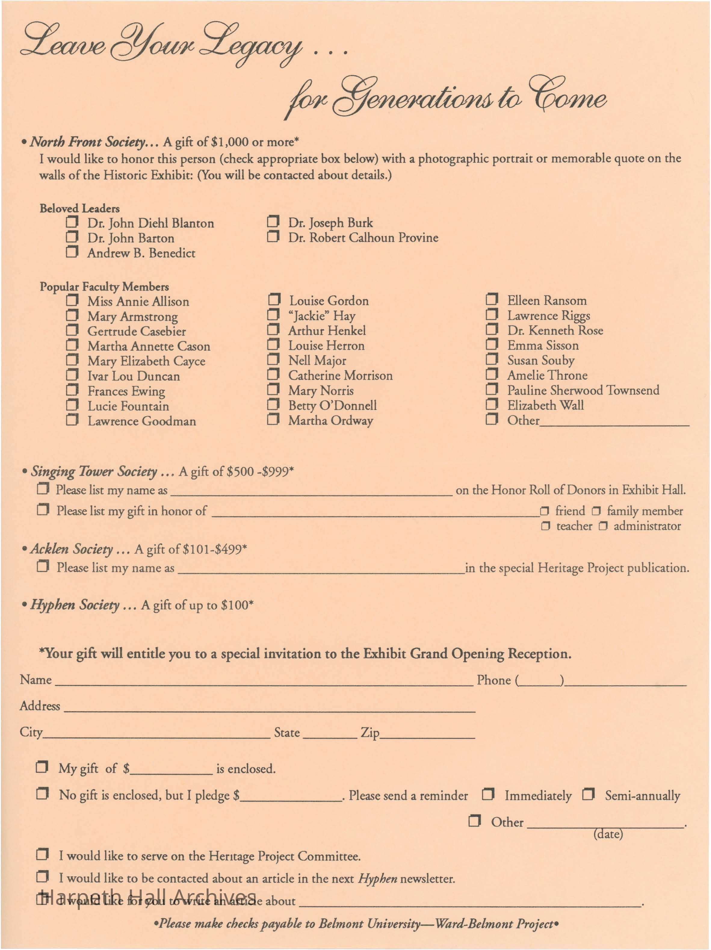 Donation Form for Ward Belmont Project