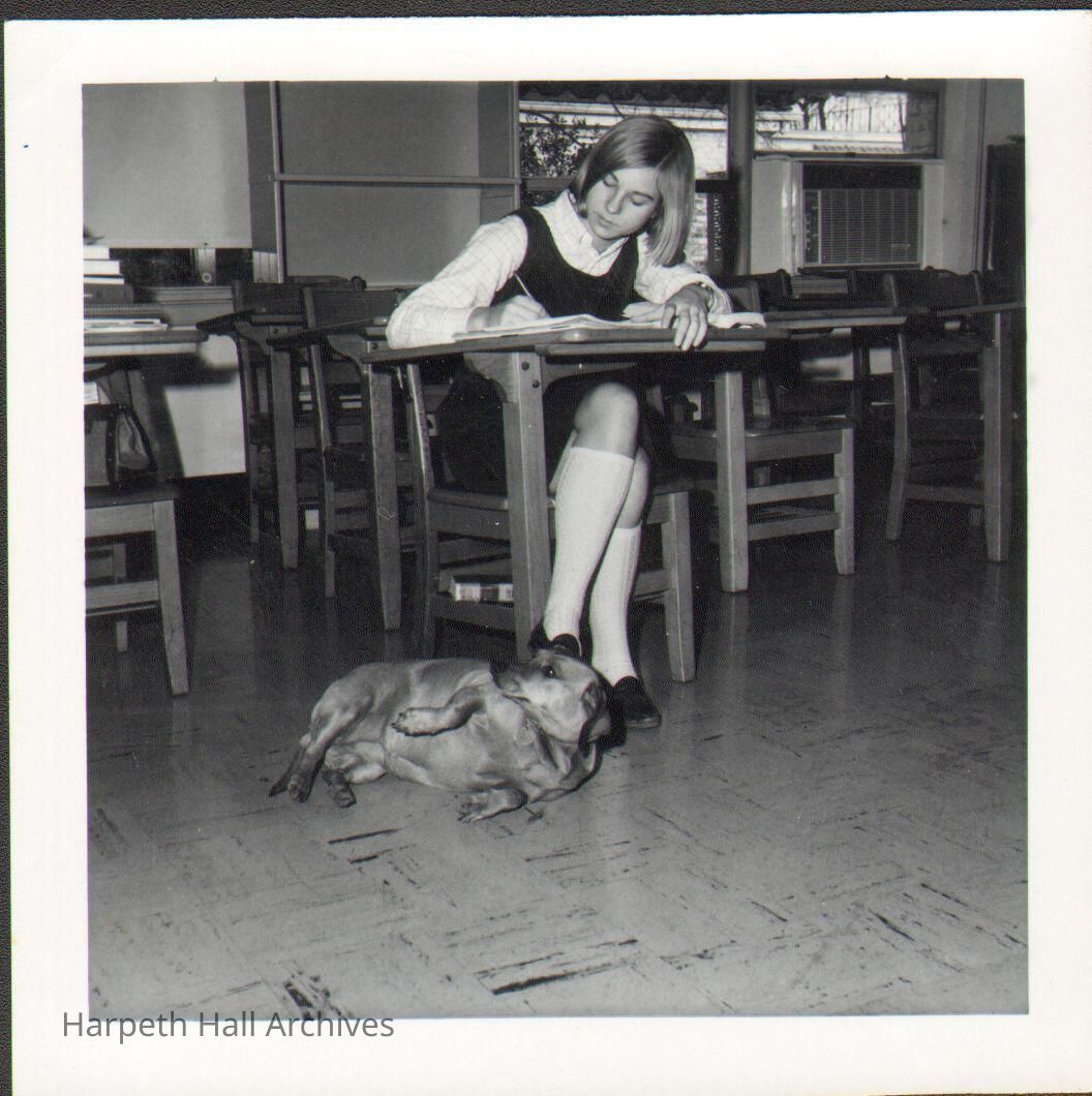 Student at desk with dog at her feet in 1969.