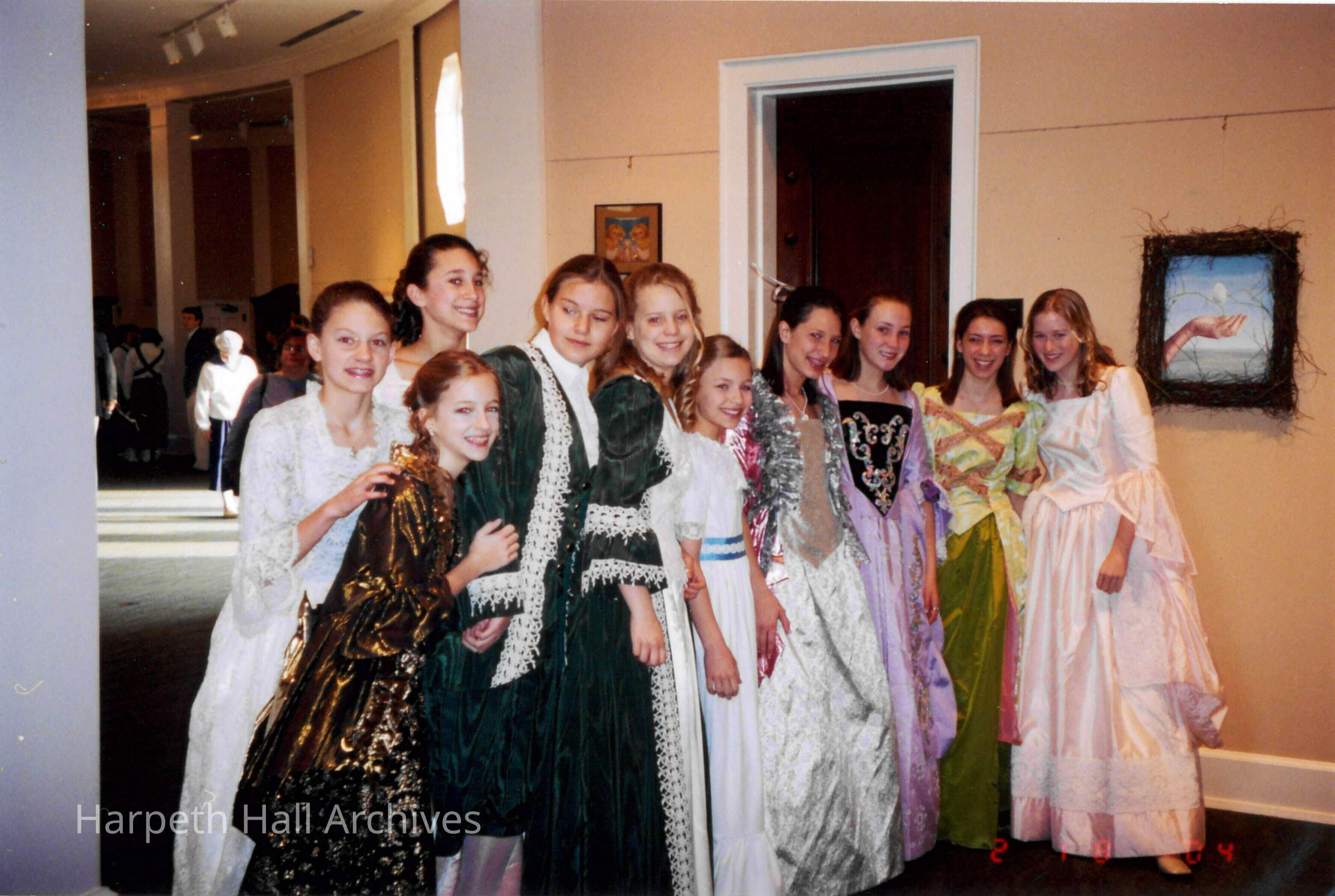 A group of seventh grade students posing in costume after the George Washington Day Celebration on February 18, 2004. The photo is taken in the Marnie Sheridan Gallery in the McMurry Center.Context