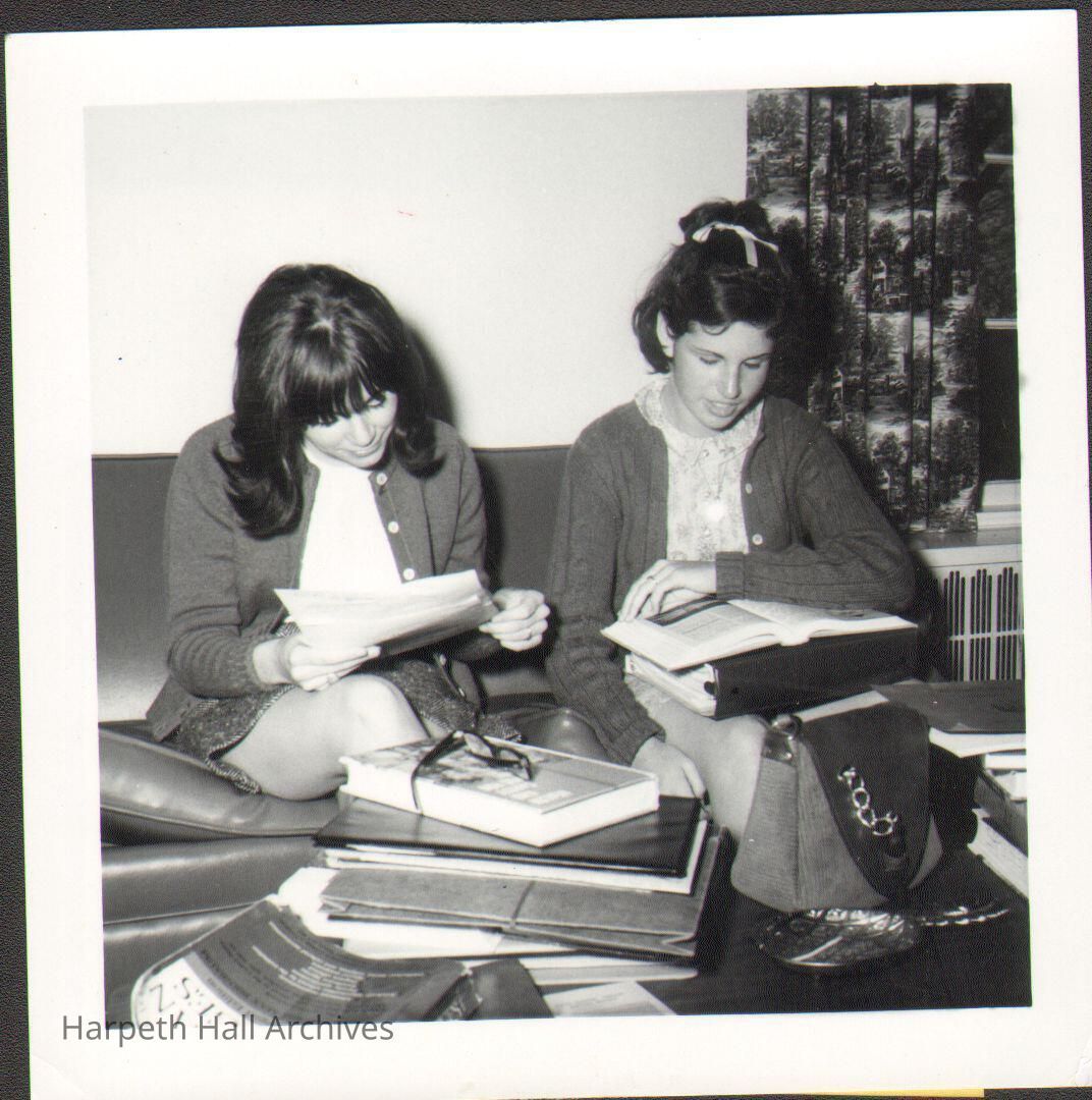 Mary "Camille" Harlin Willis (1969) and Martha Schull Gilliss (1969) studying on a sofa in 1969.