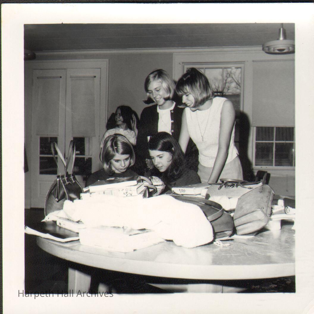 Peggy Campbell Steele (1969), Margaret "Camille" Core Gift (1969), Virginia Dale (1969), Katherine "Katy" Manier Schneider (1969) examining something in 1969.