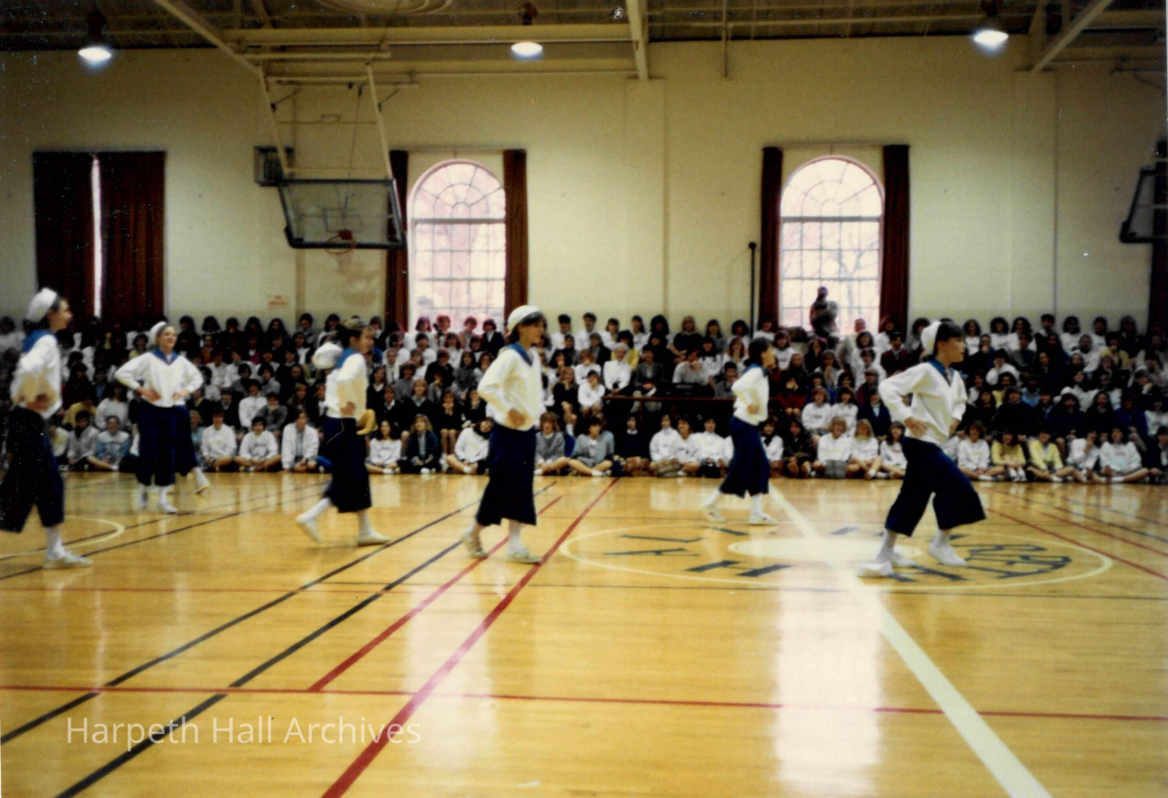 Students performing as sailors in the George Washington Day Celebration. The photo is taken in Morrison Gym in the McMurry Center.Context