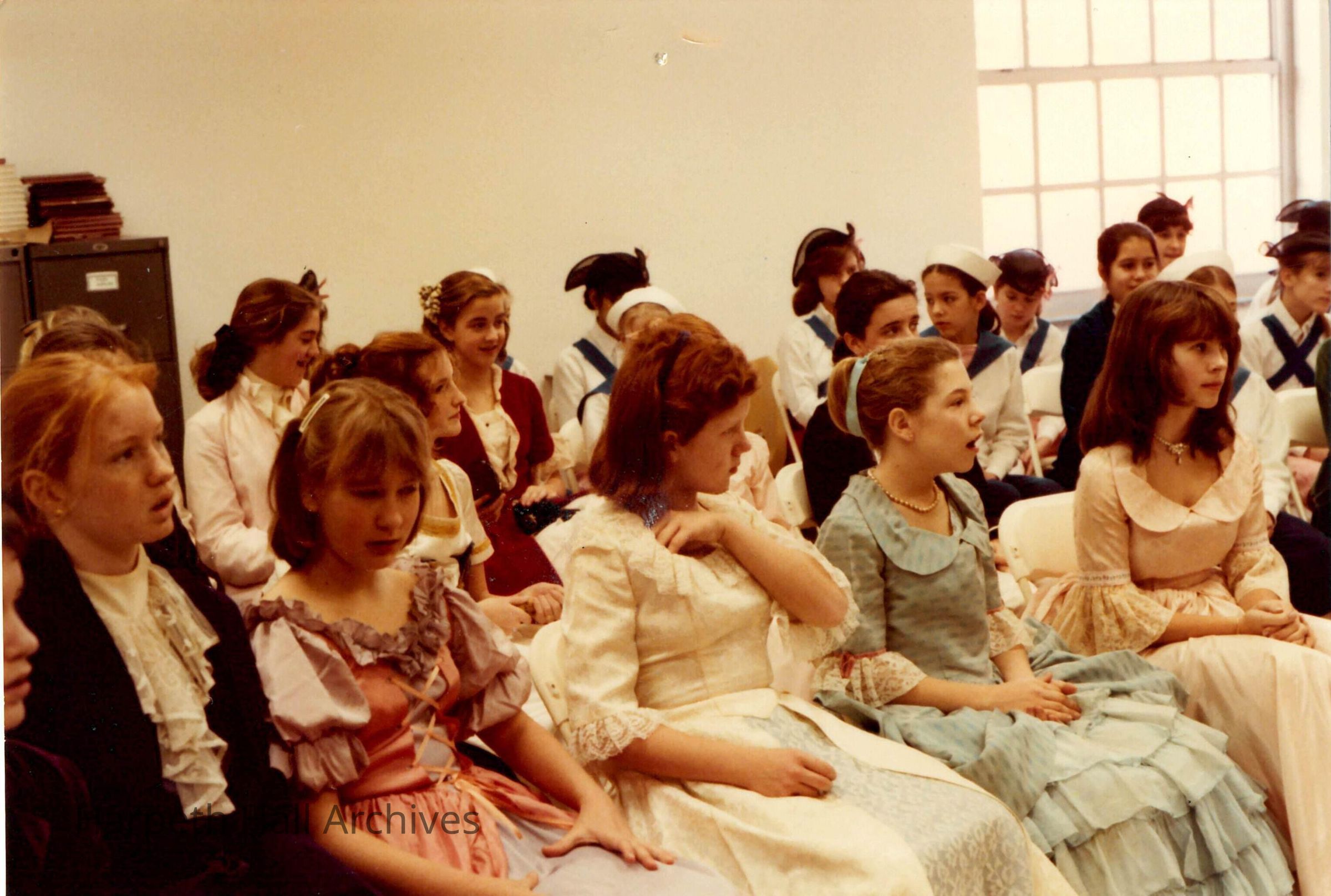 A group of seventh grade students in costume preparing for the George Washington Day Celebration.Context