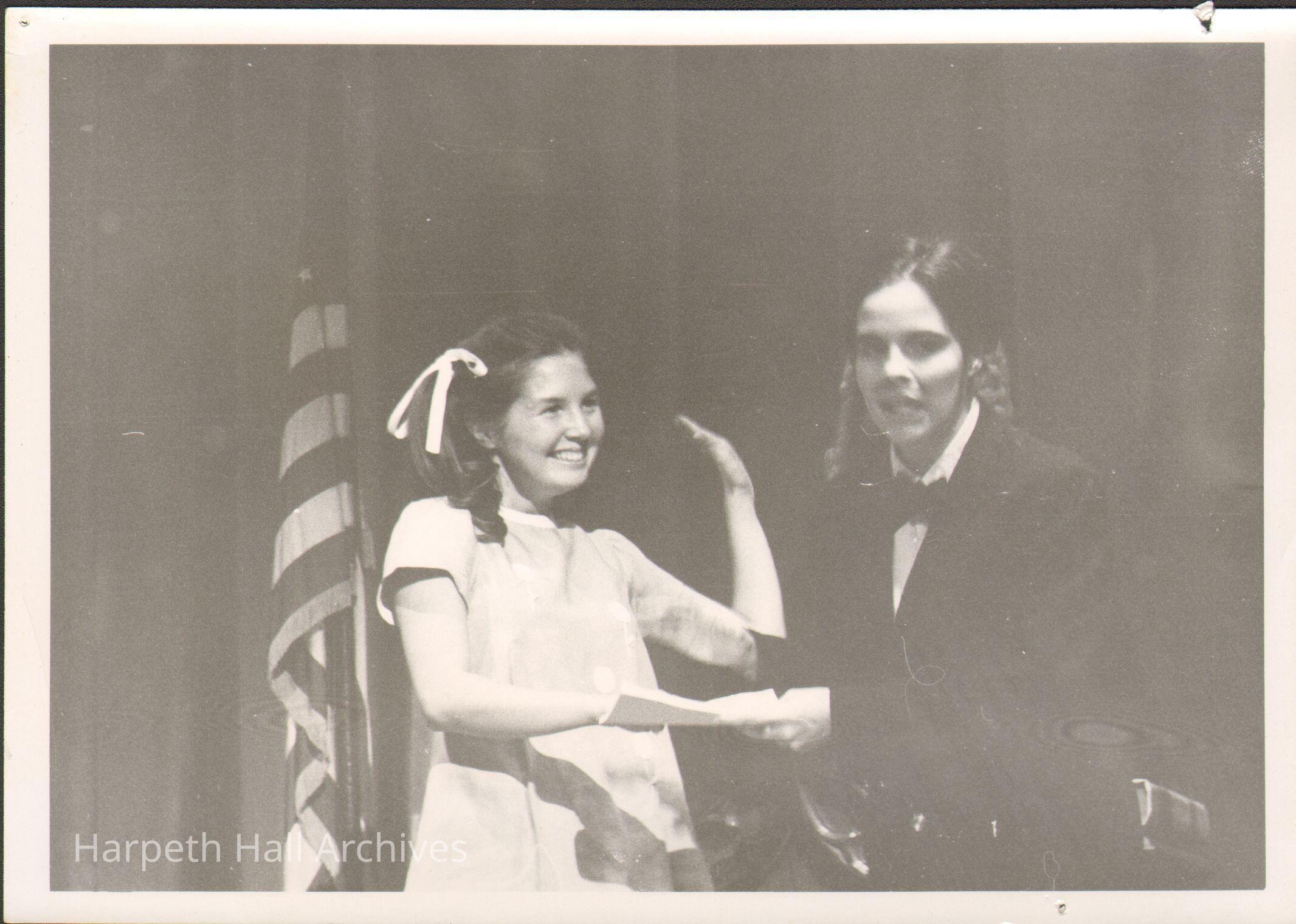 Gail Trickett Trapp (1969) and Deborah "Debbie" Rodgers Murrey (1969) on stage in the old auditorium in 1969.