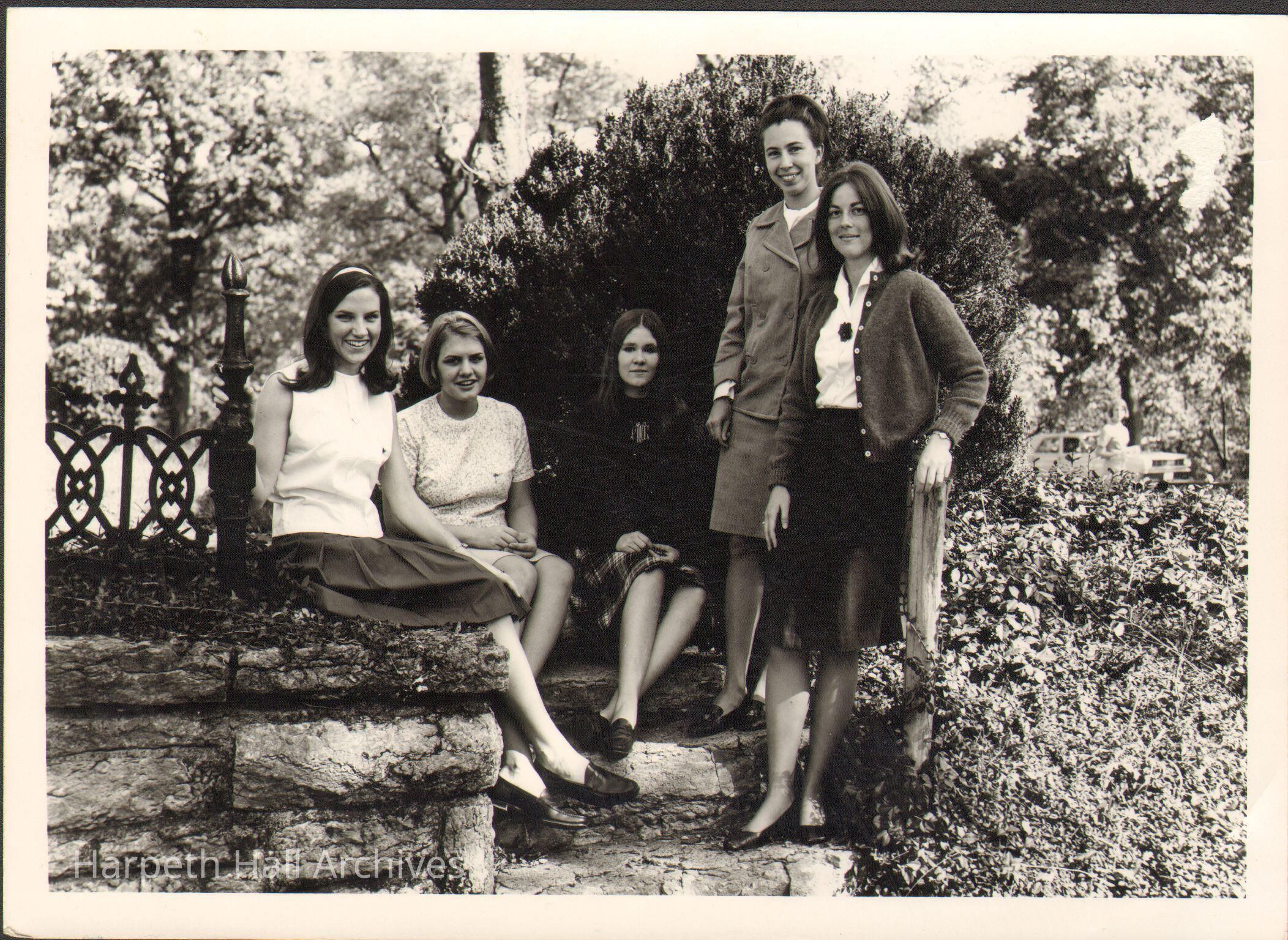 Group shot of 5 students outisde in 1969. One is Paula Whitson Reed (1969).