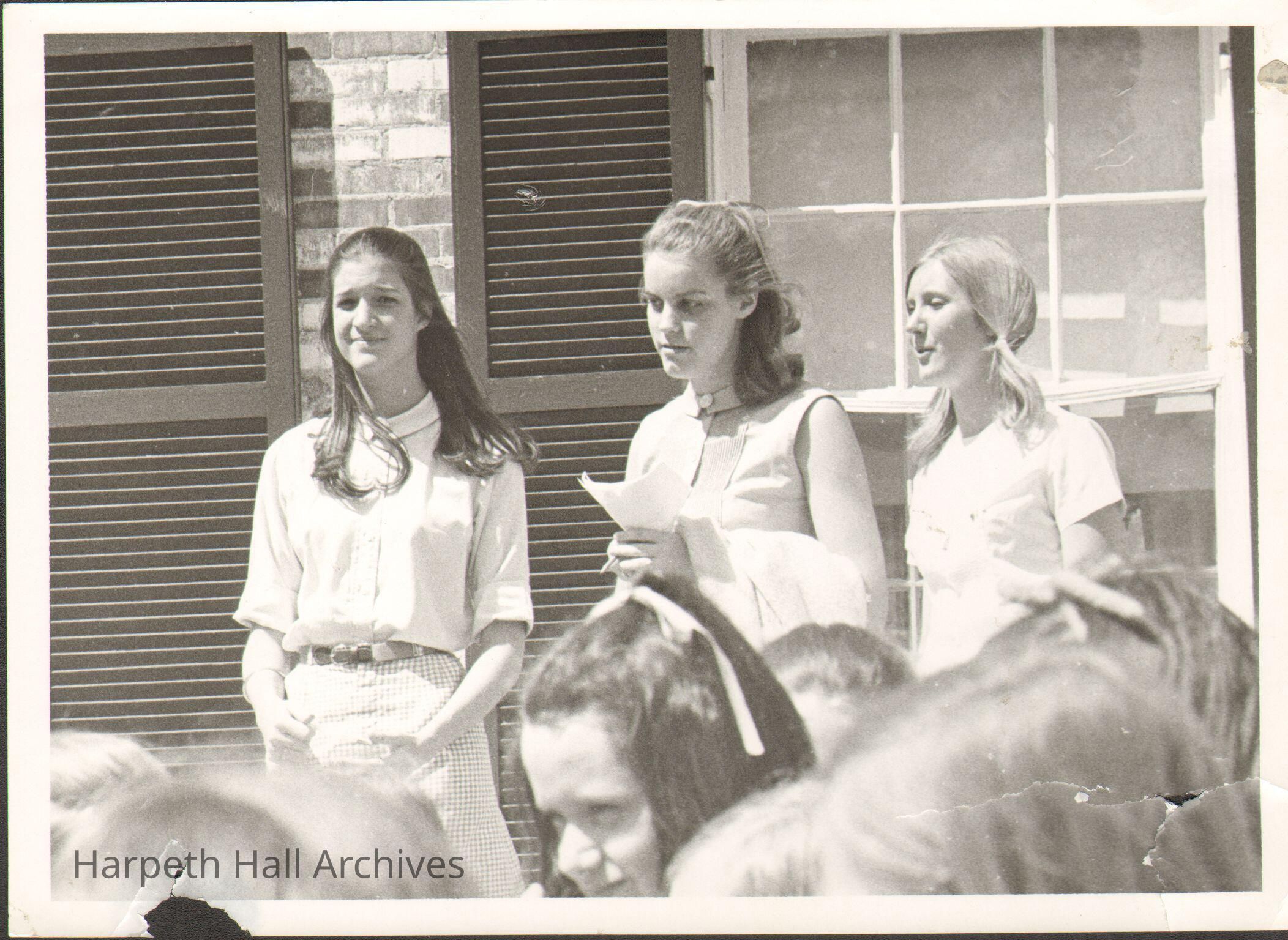 Barbara Meacham (1969), Rachel "Jane" Buchanan Corcoran (1969), Judith "Judy" Quinn (1969) on the back steps of Souby Hall in 1969.