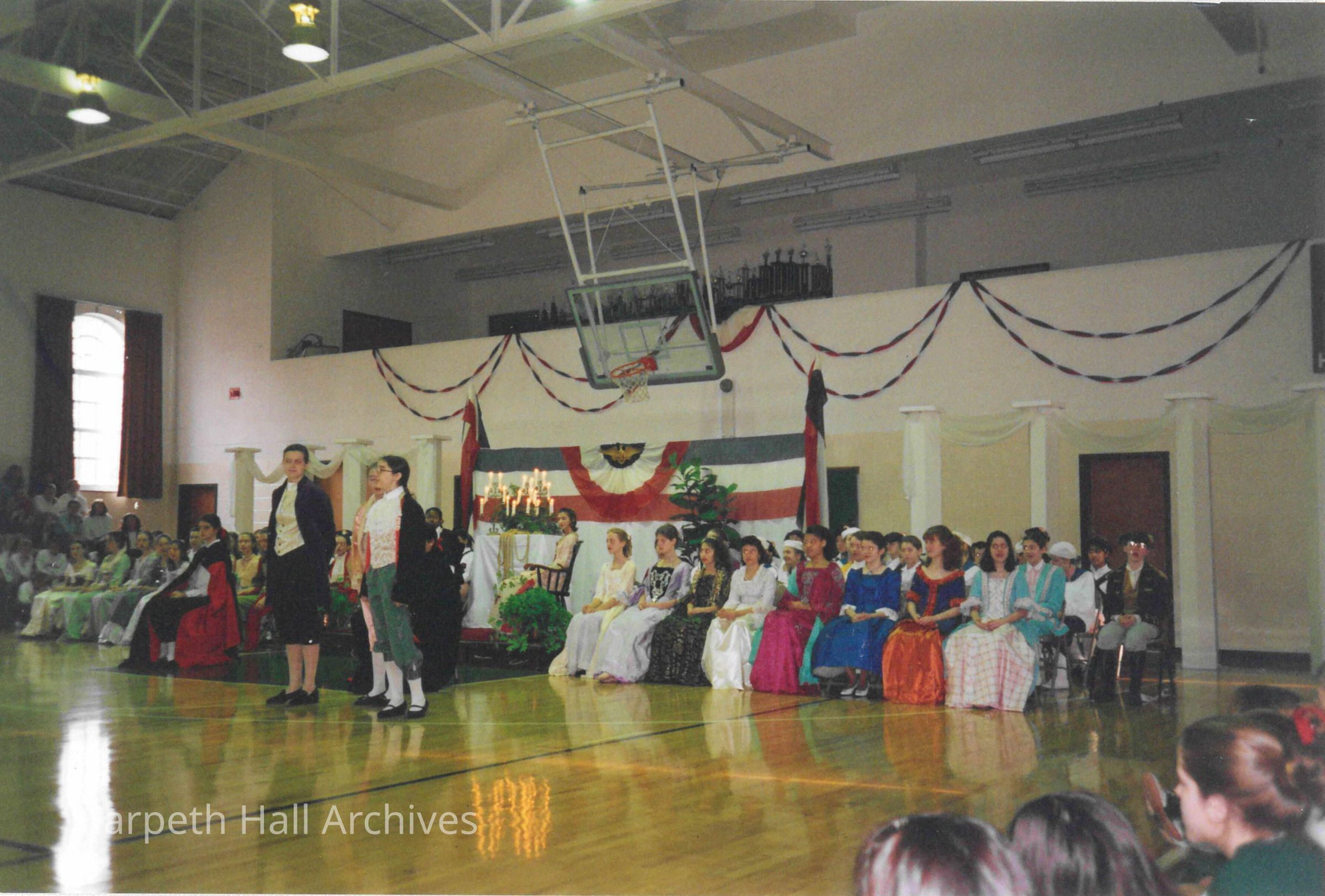 Students performing in the George Washington Day Celebration. The photo was taken in Morrison Gym in the McMurry Center.Context