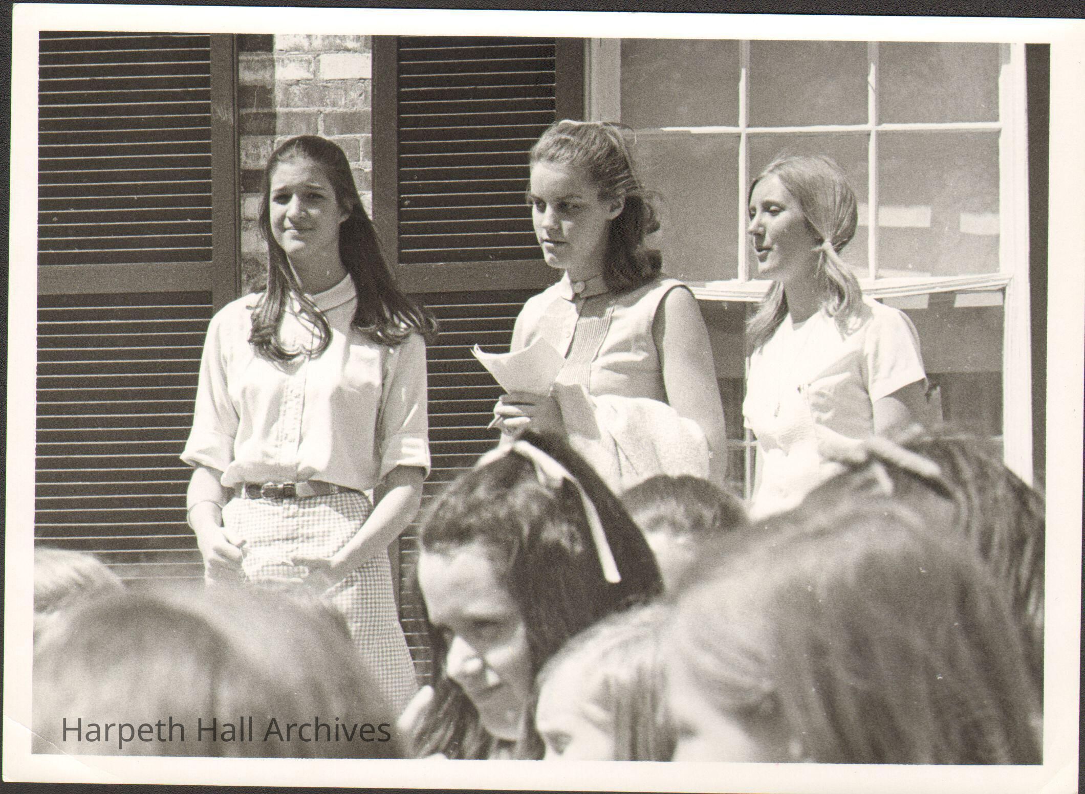Barbara Meacham (1969), Rachel "Jane" Buchanan Corcoran (1969), Judith "Judy" Quinn (1969) on the back steps of Souby Hall in 1969.