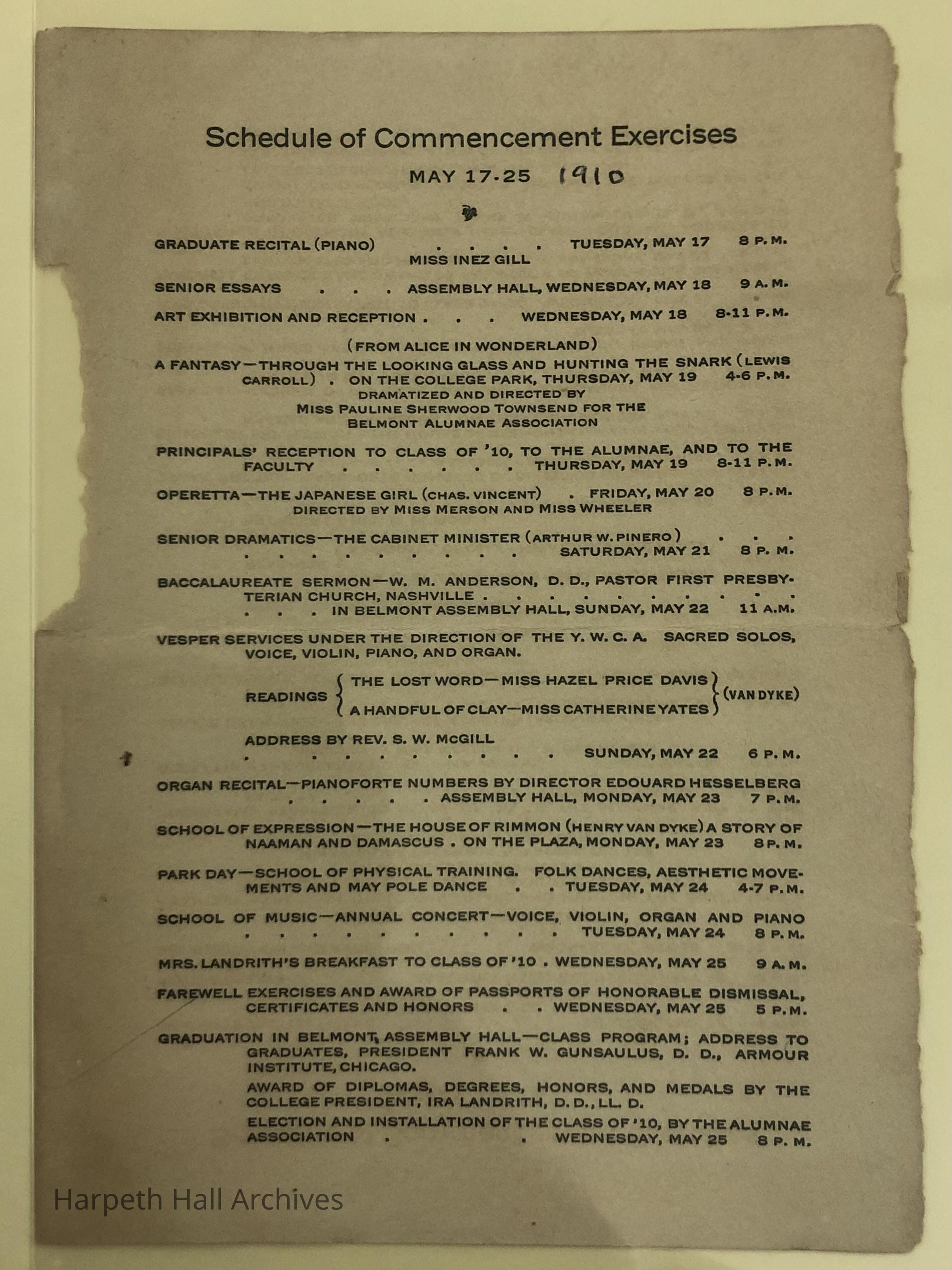 Page from pamphlet containing schedule of Belmont Seminary's Commencement Exercises (1910)