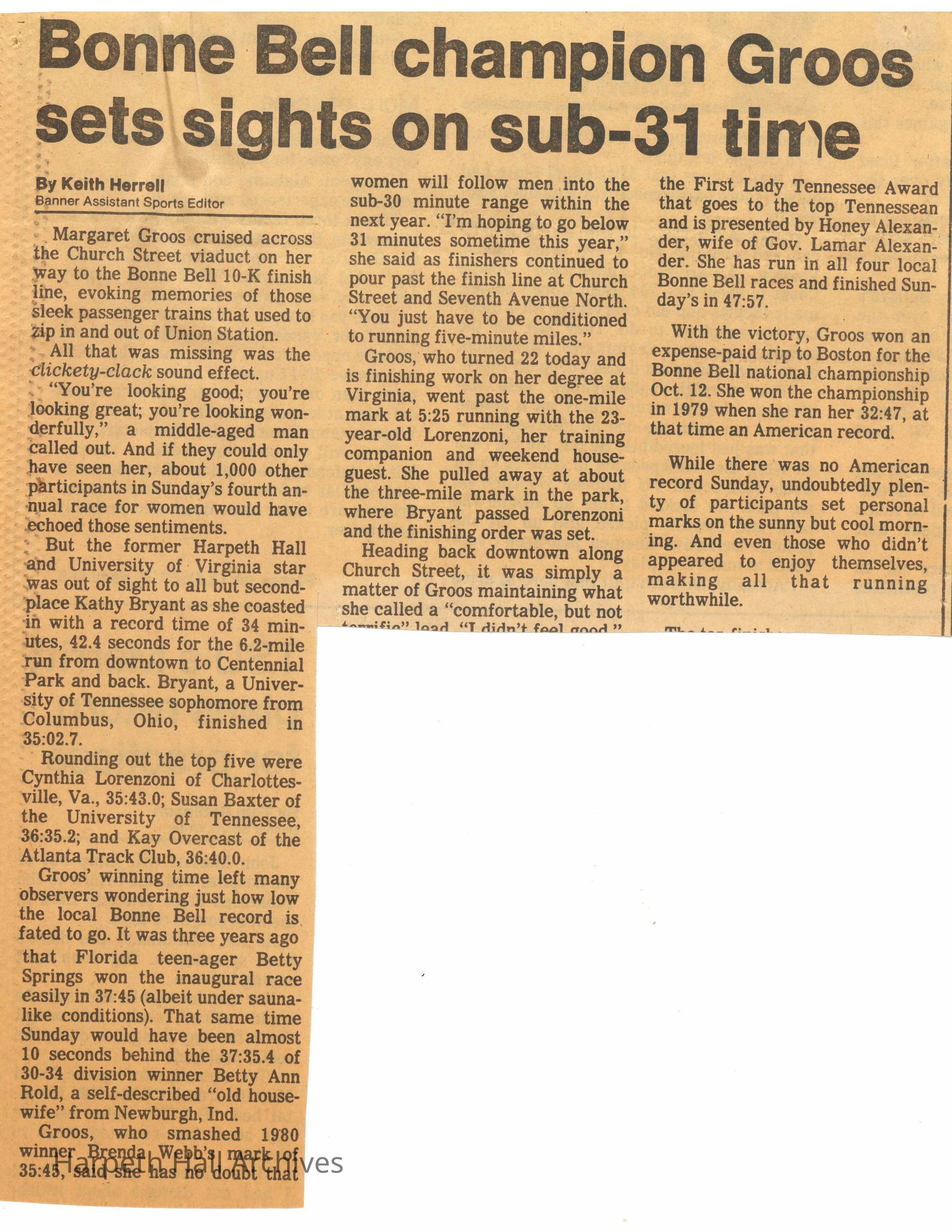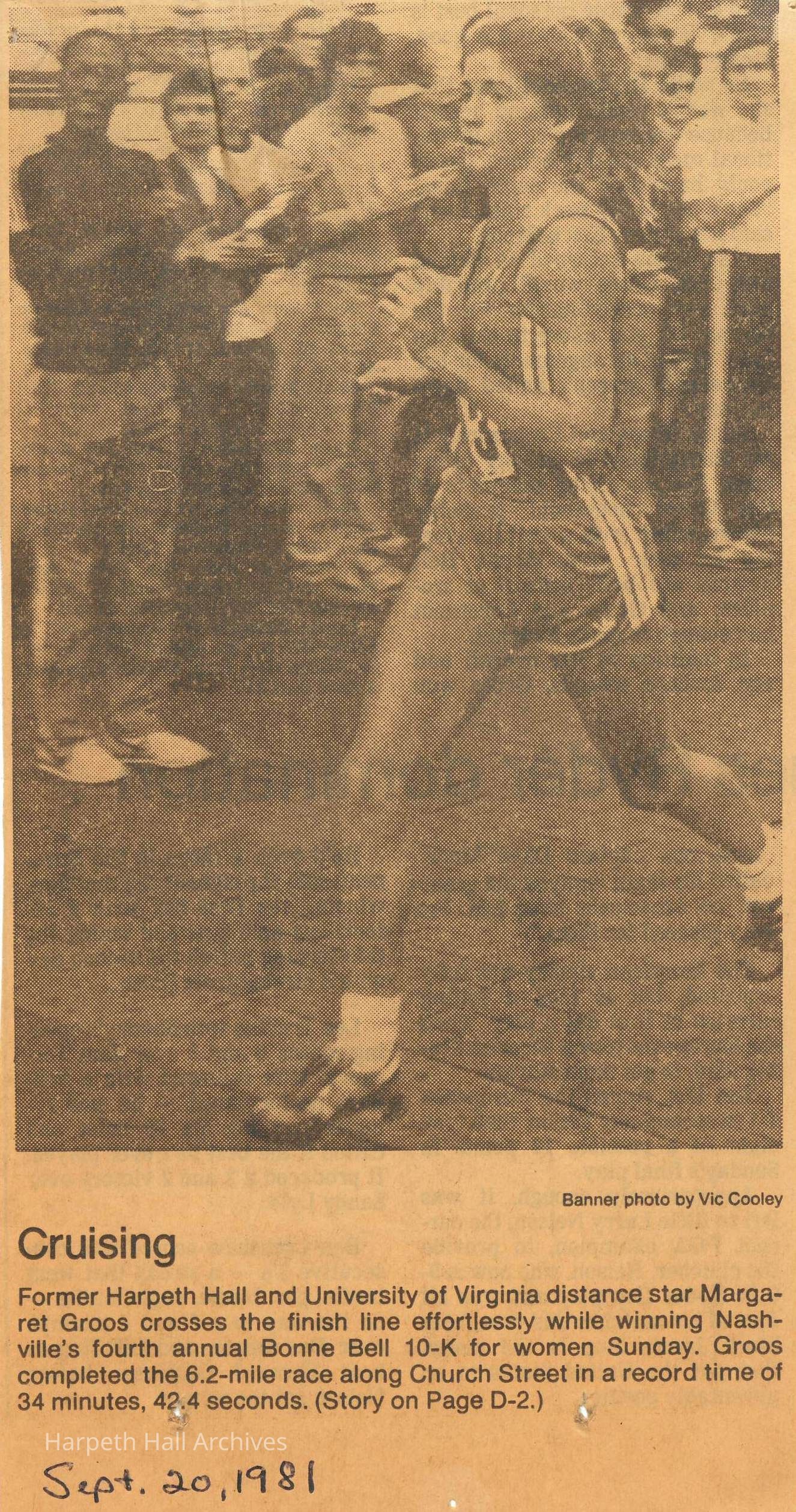Margaret Groos, Class of 1977, crosses the finish line at the fourth annual Bonne Bell 10-k for women on September 20, 1981. Groos time for the 6.2-mile race in Nashville along Church Street, was a record time of 34 minutes, 42.4 secons.Photograph Details