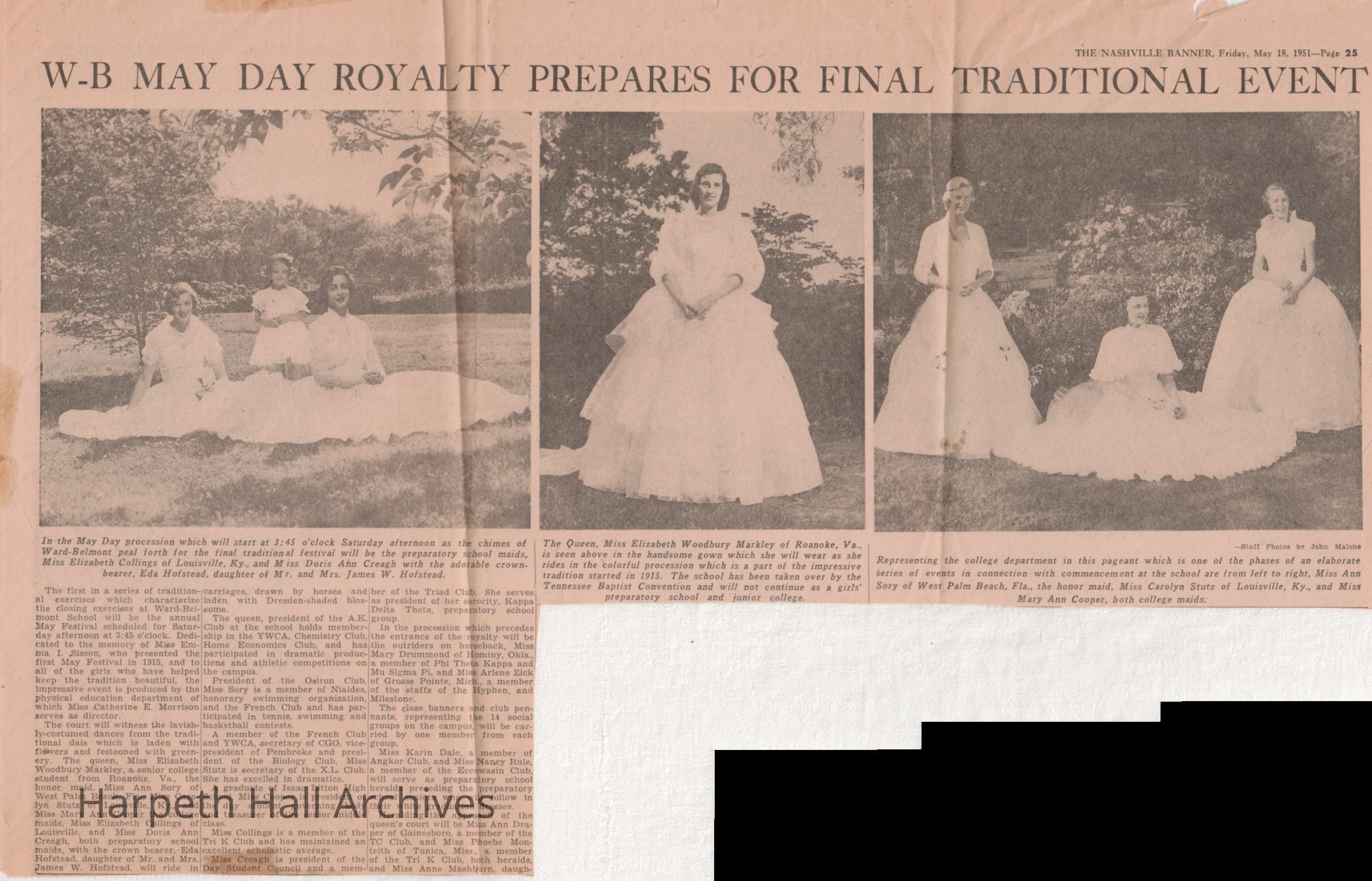 Article on Ward-Belmont's last May Day Festival. The queen's court is pictured above the article.